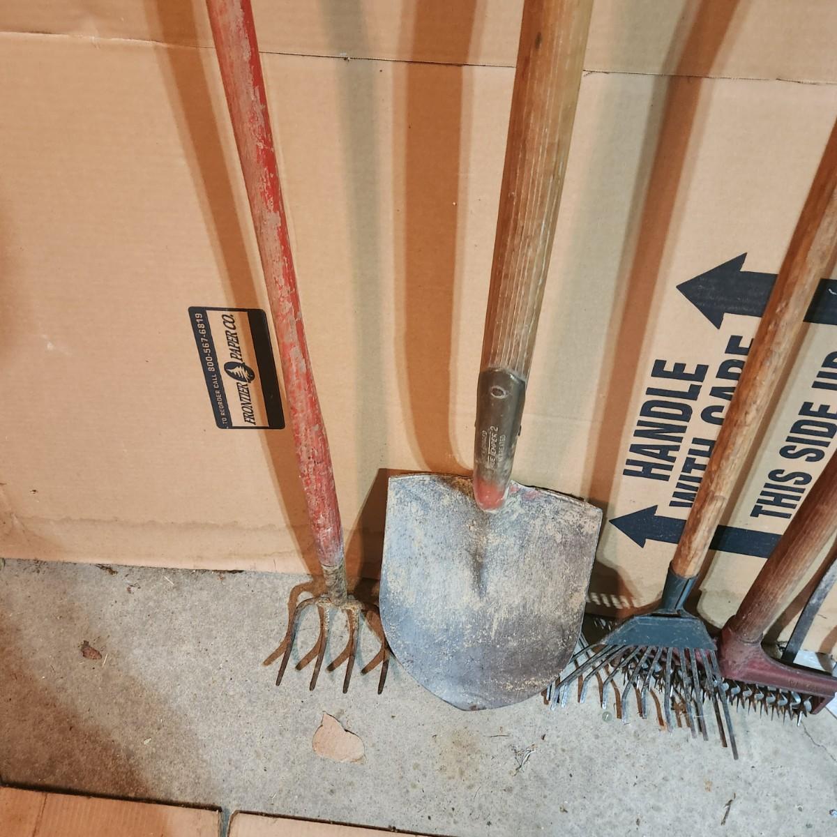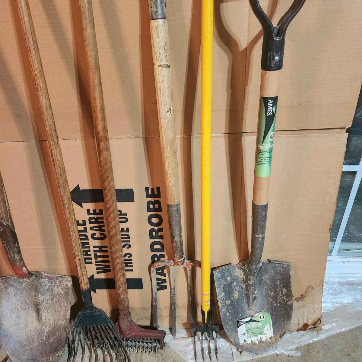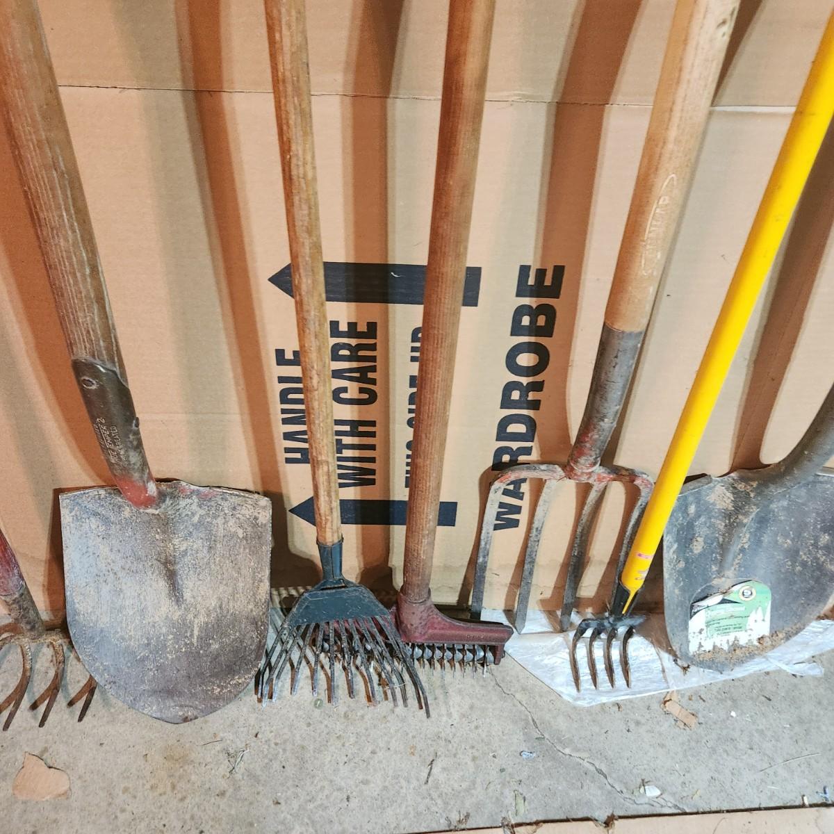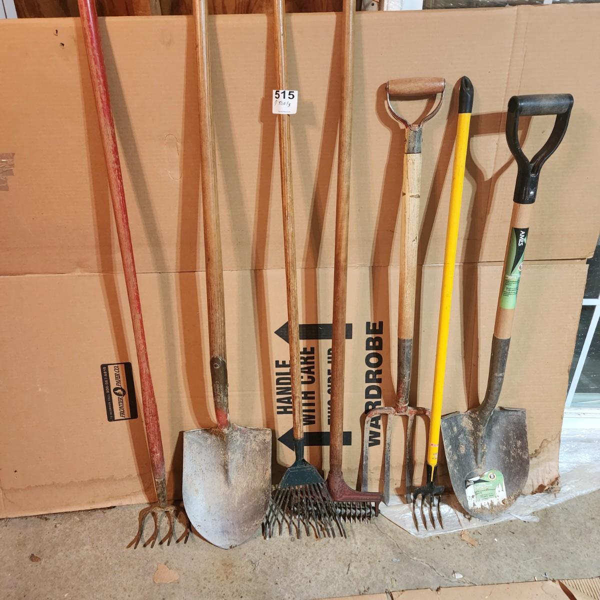 7 yard Tool Lot Shovels Forks Rake see Pictures