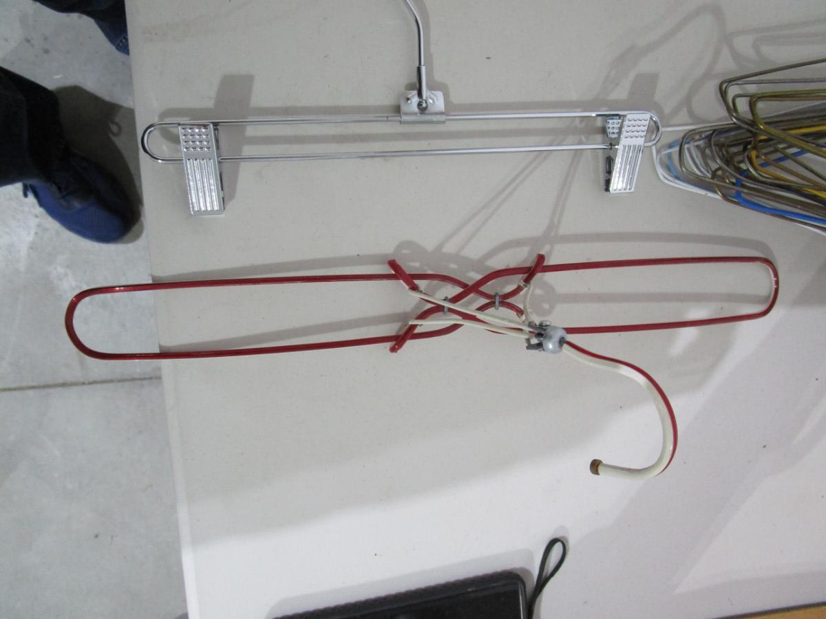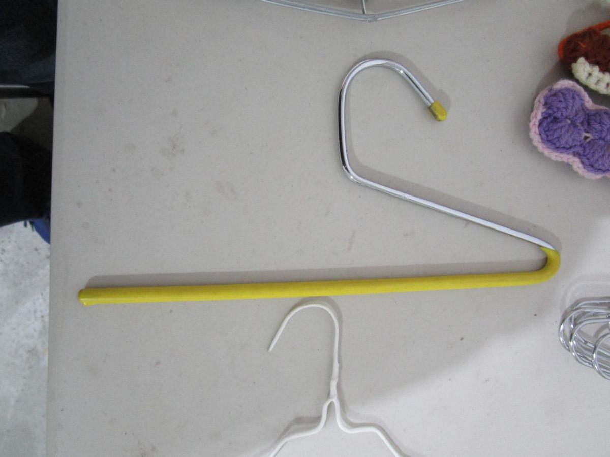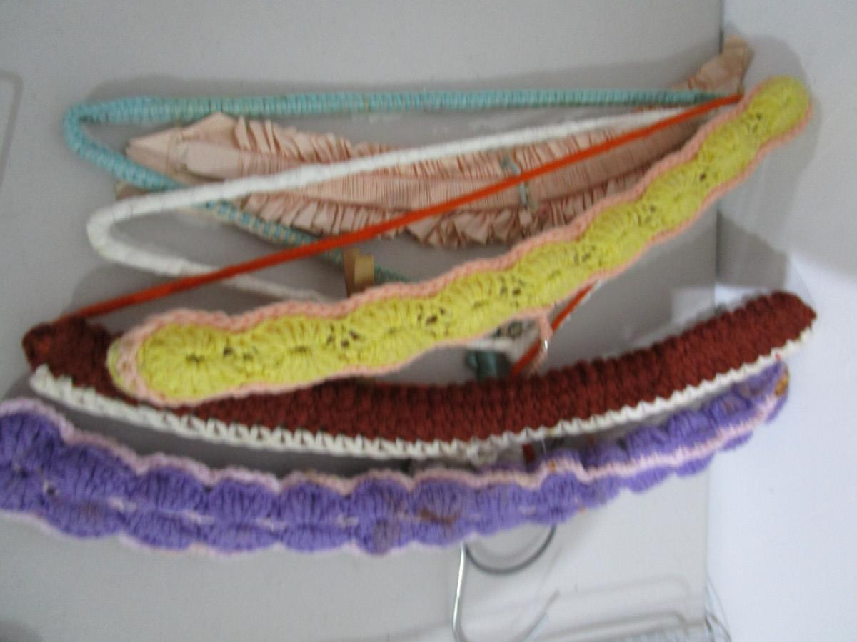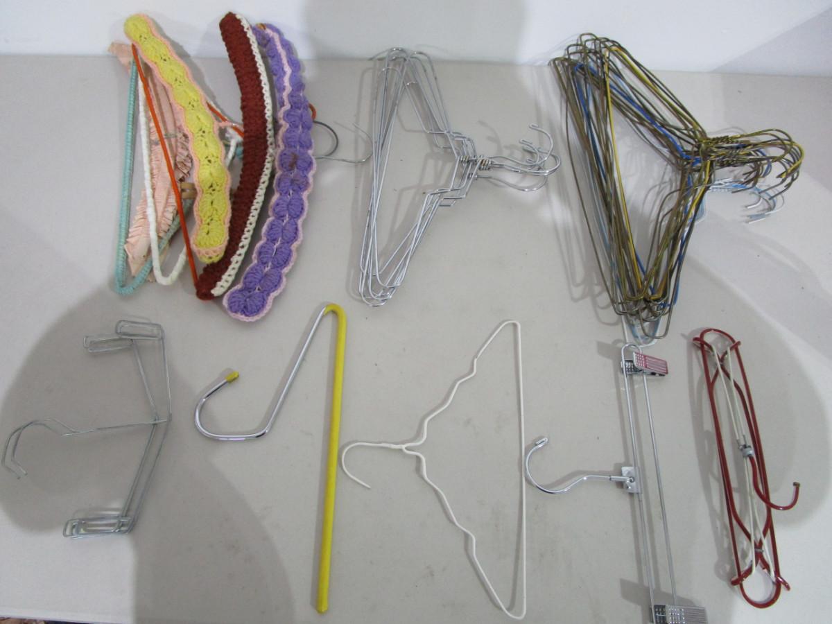 2 cuff pant hangers, 1 heavy duty pants hanger, 1 child hanger, 1 skirt hanger, 1 travel hanger, 7 crocheted hangers, 6 chrome hangers, 24 metal hangers