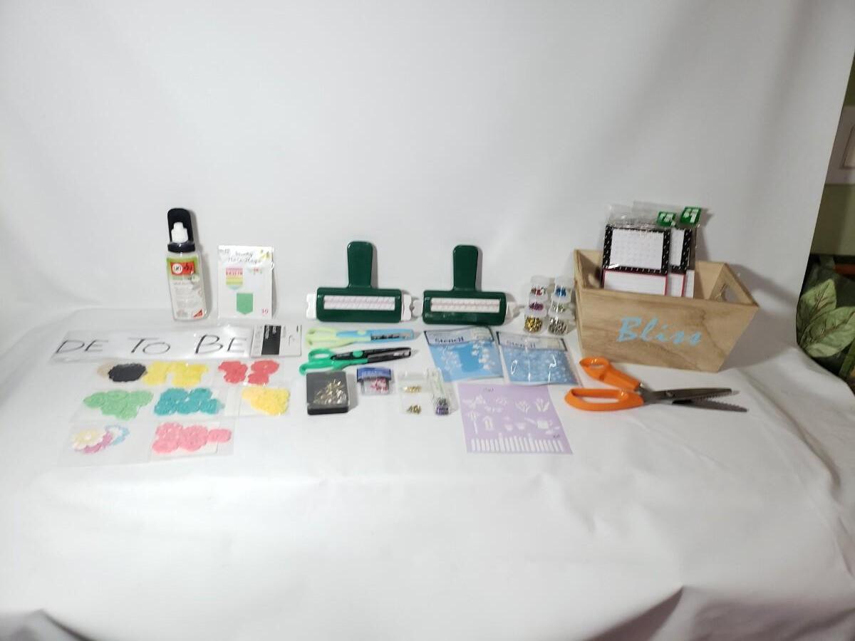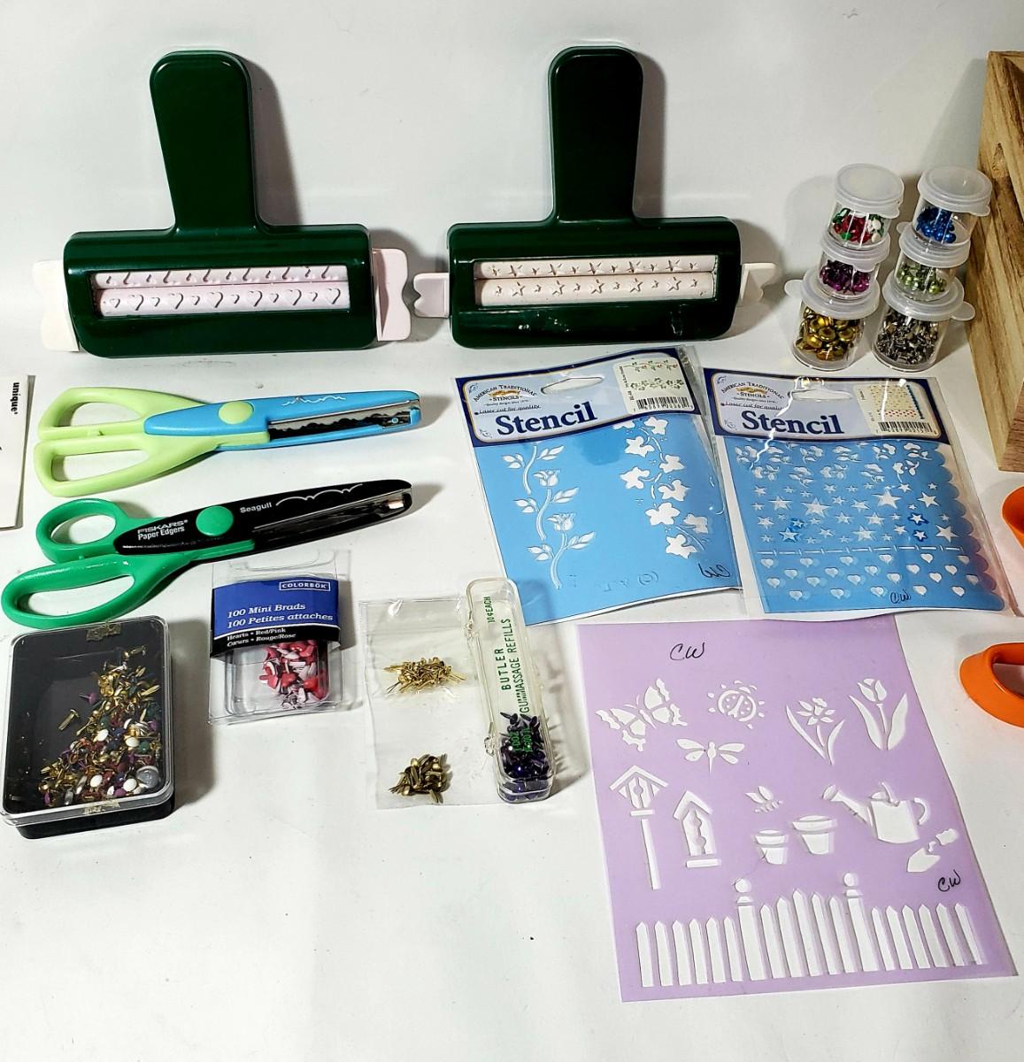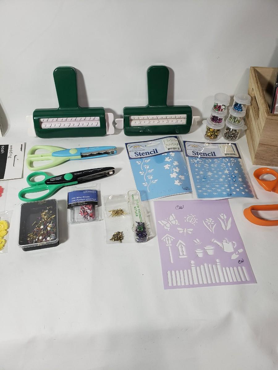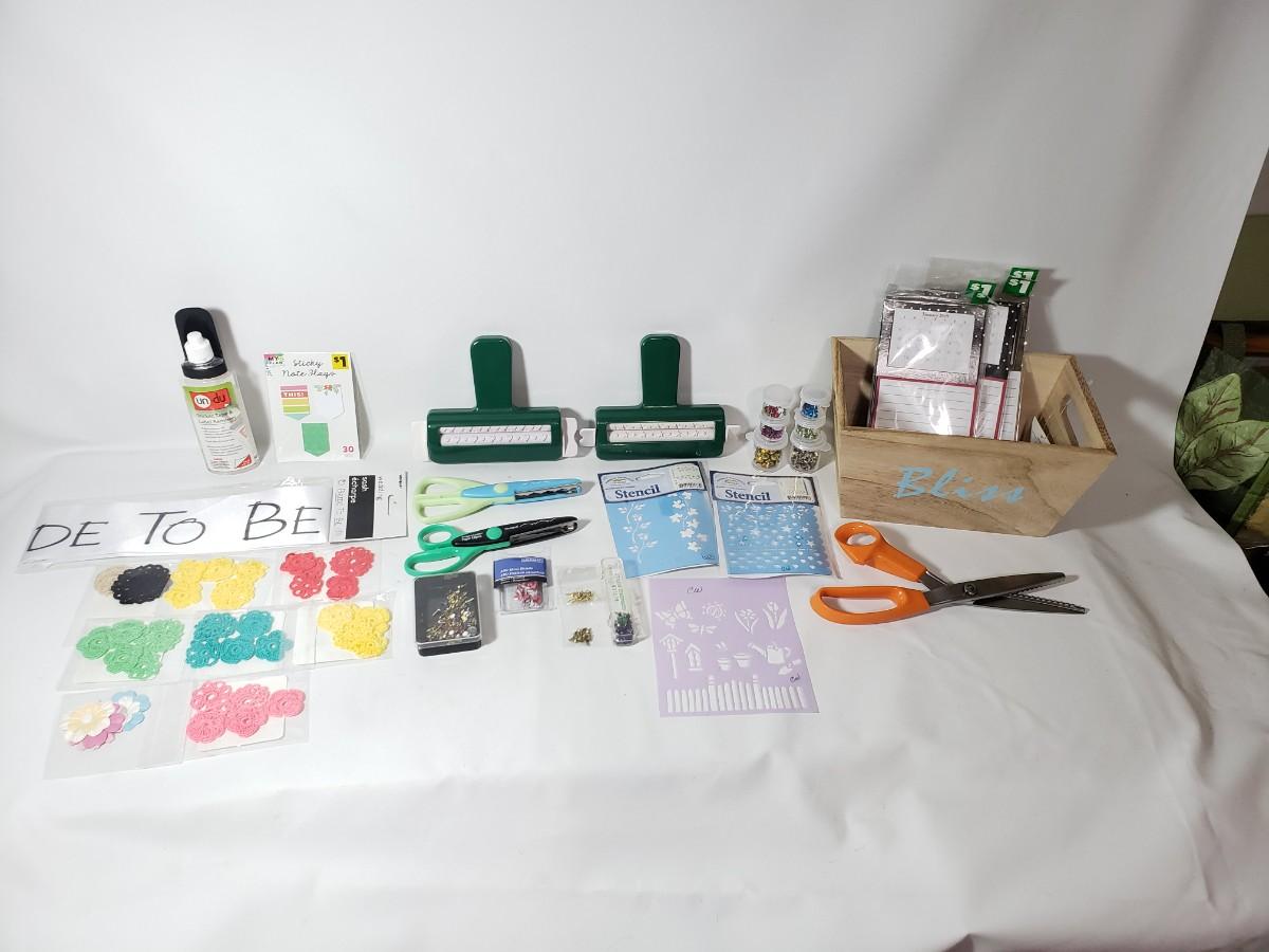 Variety of art supplies; Fiskar picking shears, mini doilies, stencils, storage box and lots more.