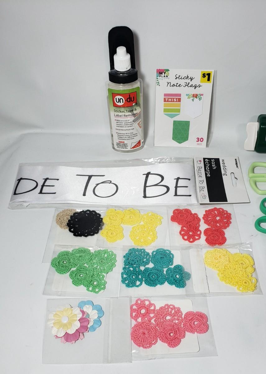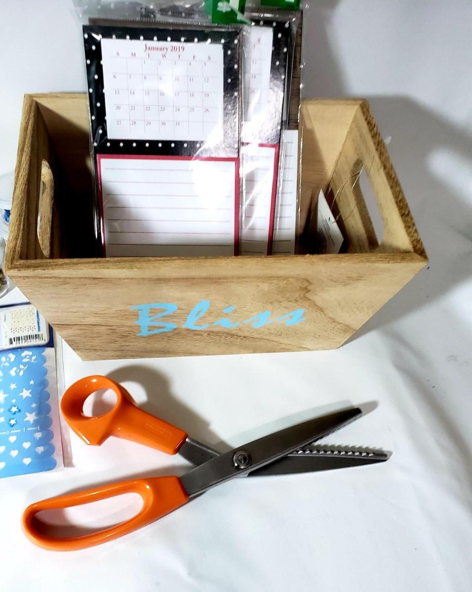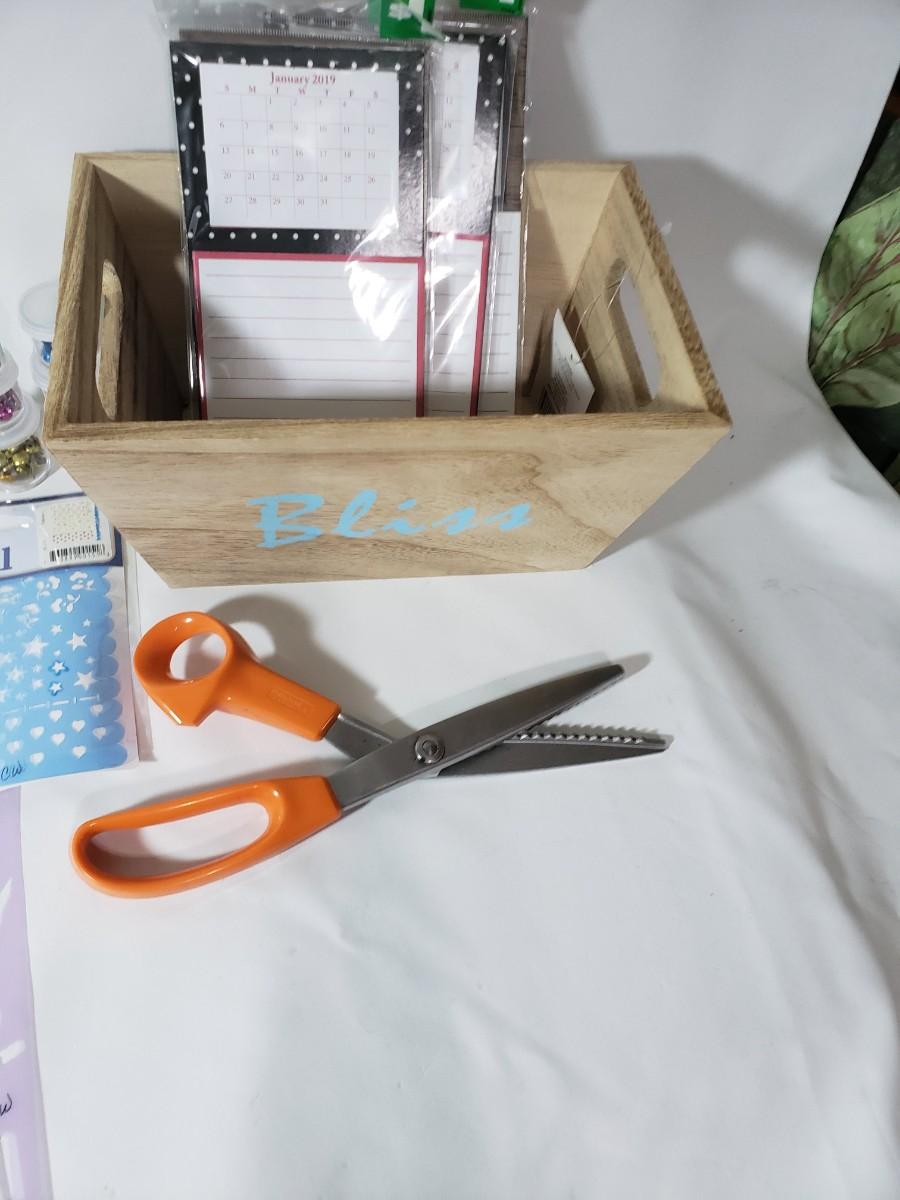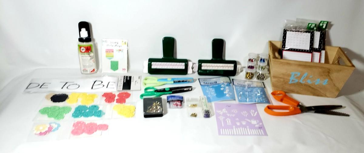 Variety of art supplies; Fiskar picking shears, mini doilies, stencils, storage box and lots more.