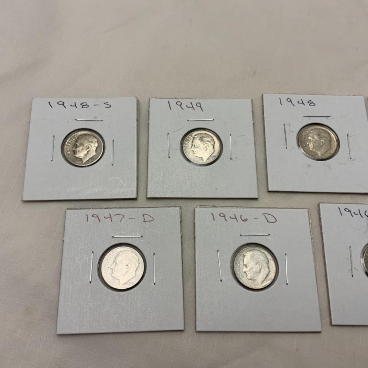 Nine Roosevelt Dimes from 1946 to 1948. Various Mint Marks, Average to AU in condition. Please see photos for details and condition. ::: Shipping is available on this lot. If you require shipping you must let us know at the close of the auction. We will coordinate with you after the item has been won. Shipping fees will include insurance up to or exceeding the value of all items being mailed. If you have any questions regarding this lot please contact the auctioneer either via this website, by direct email or by phone. PICK UP TIMES and other important information can be found in the TERMS and DESCRIPTION of the auction. Please take a look for pertinent information. Thanks!