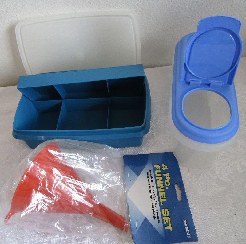 #70 Tupperware Utility Box, Anchorhocking container, and New Funnel set