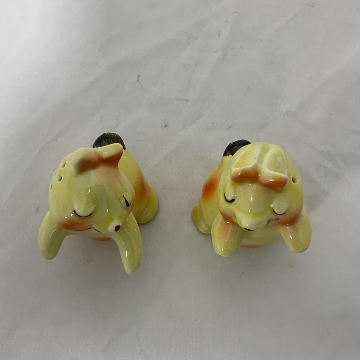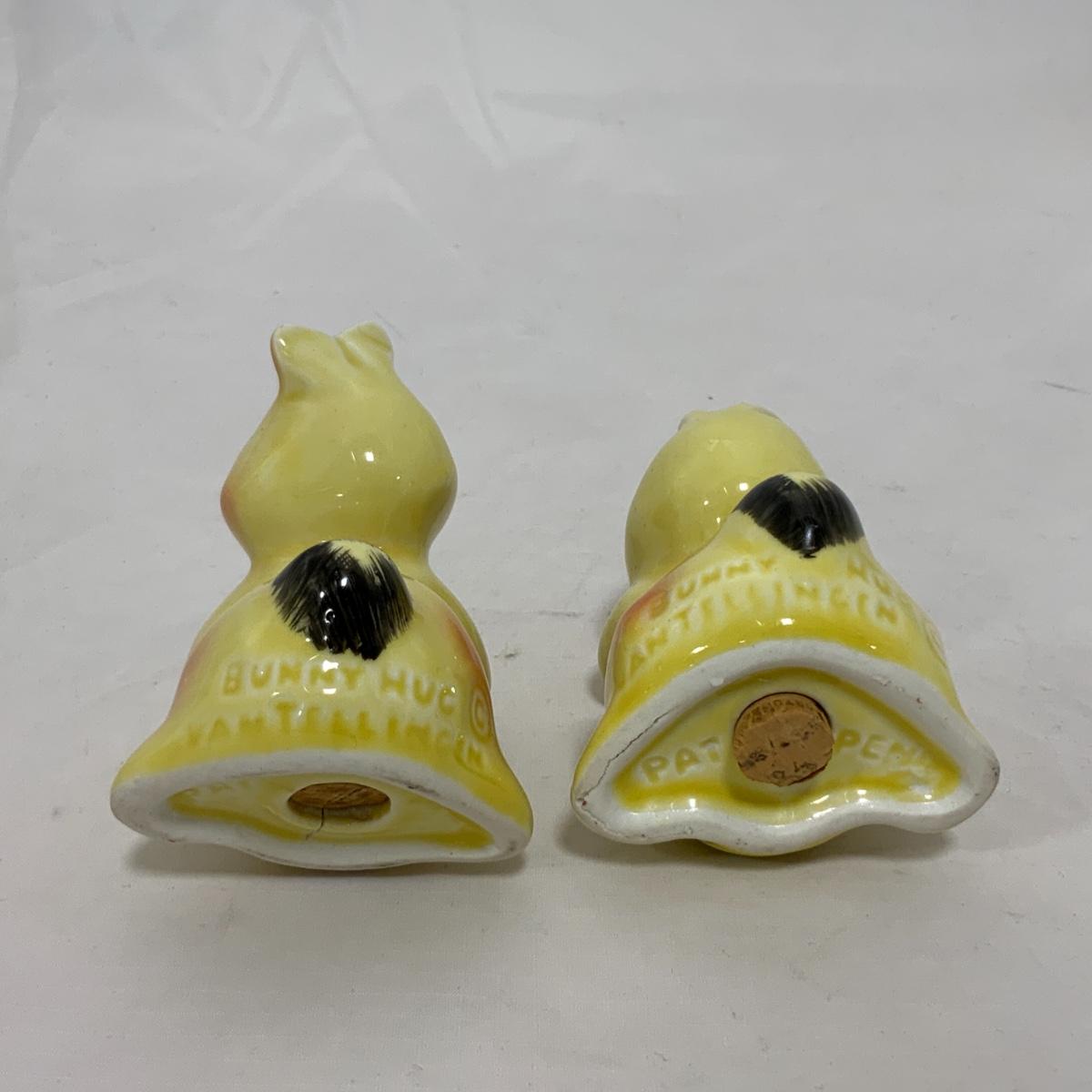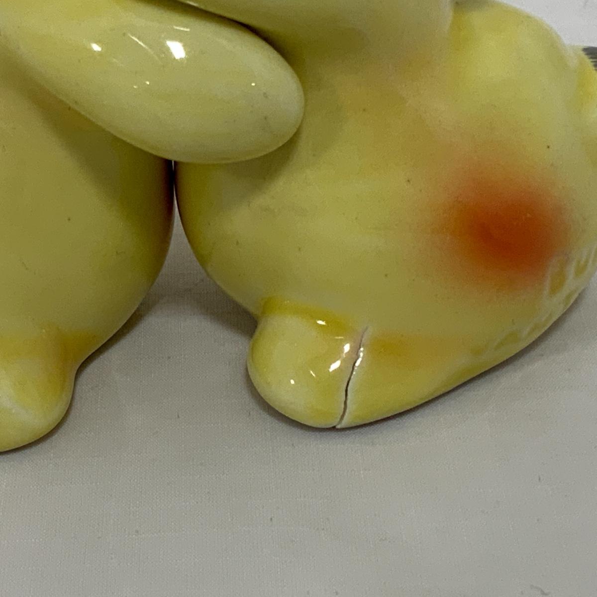 From the Estate of Peter and Alice Radovanovich: Attractive Yellow and orange set of 1950s Van Tellingen Huggies. One of the bunnies does have a crack - a manufacturing flaw, which is pictured. Please see photos for details and condition. ::: Shipping is available on this lot. If you require shipping you must let us know at the close of the auction. We will coordinate with you after the item has been won. Shipping fees will include insurance up to or exceeding the value of all items being mailed. If you have any questions regarding this lot please contact the auctioneer either via this website, by direct email or by phone. PICK UP TIMES and other important information can be found in the TERMS and DESCRIPTION of the auction. Please take a look for pertinent information. Thanks!