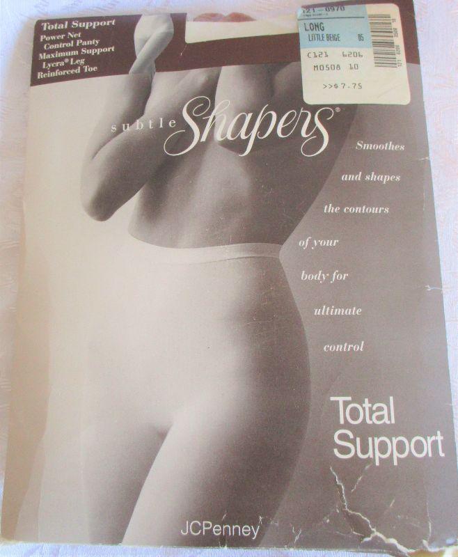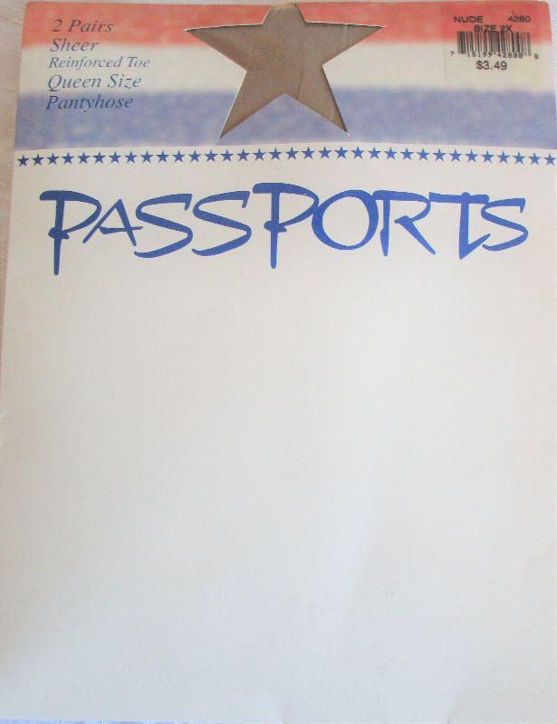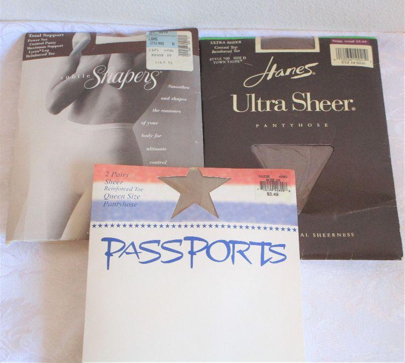 Three packages- 1 pair JC Penney Total Support, Beige, size Long; 1 pair Hanes Ultra Sheer, Town Taupe, size D; Passports 2 pair Passports, Nude, size Queen Size 2x;