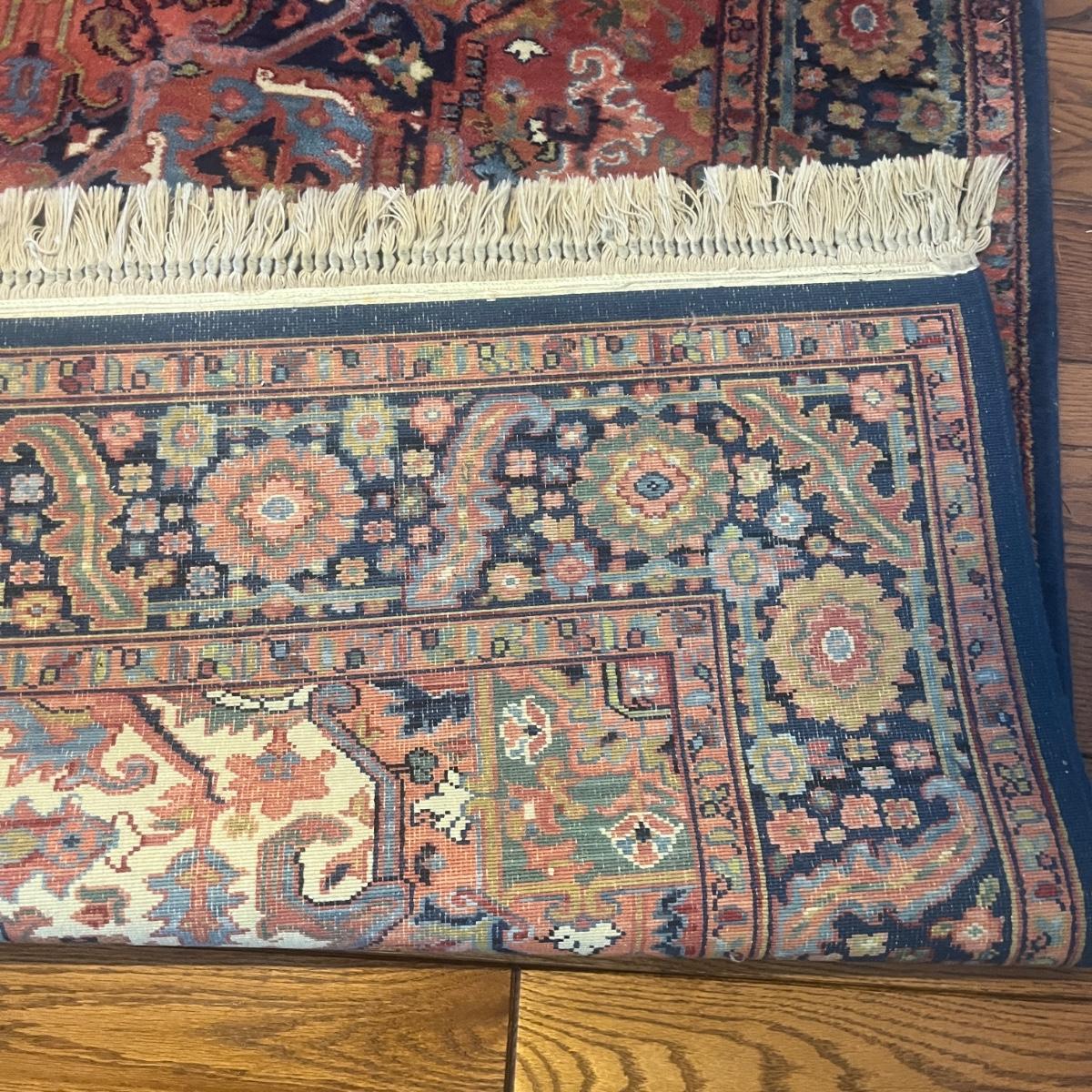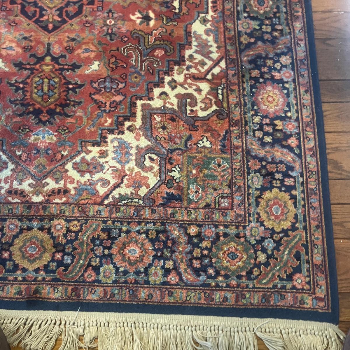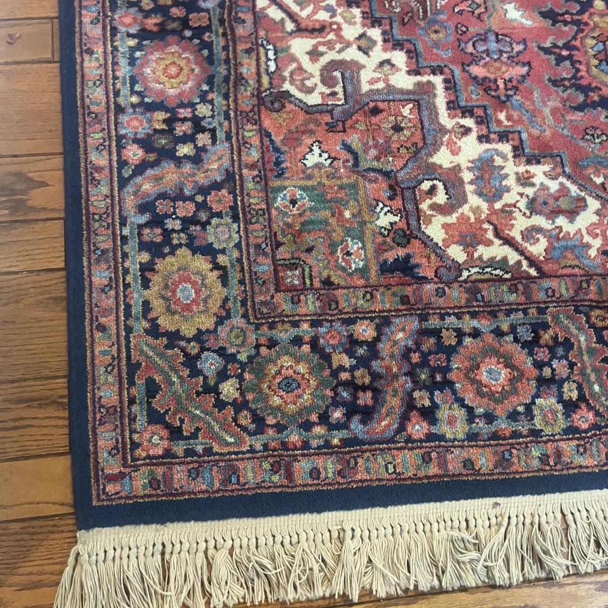 This area rug measures 70” x 116” and is predominantly red with dark blue accents.