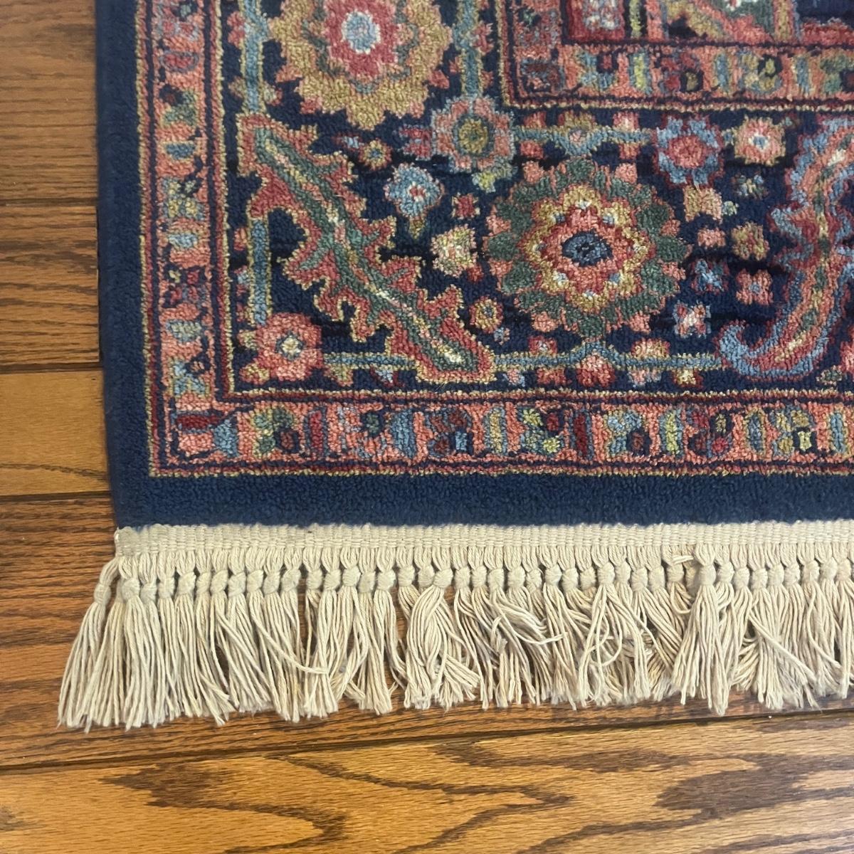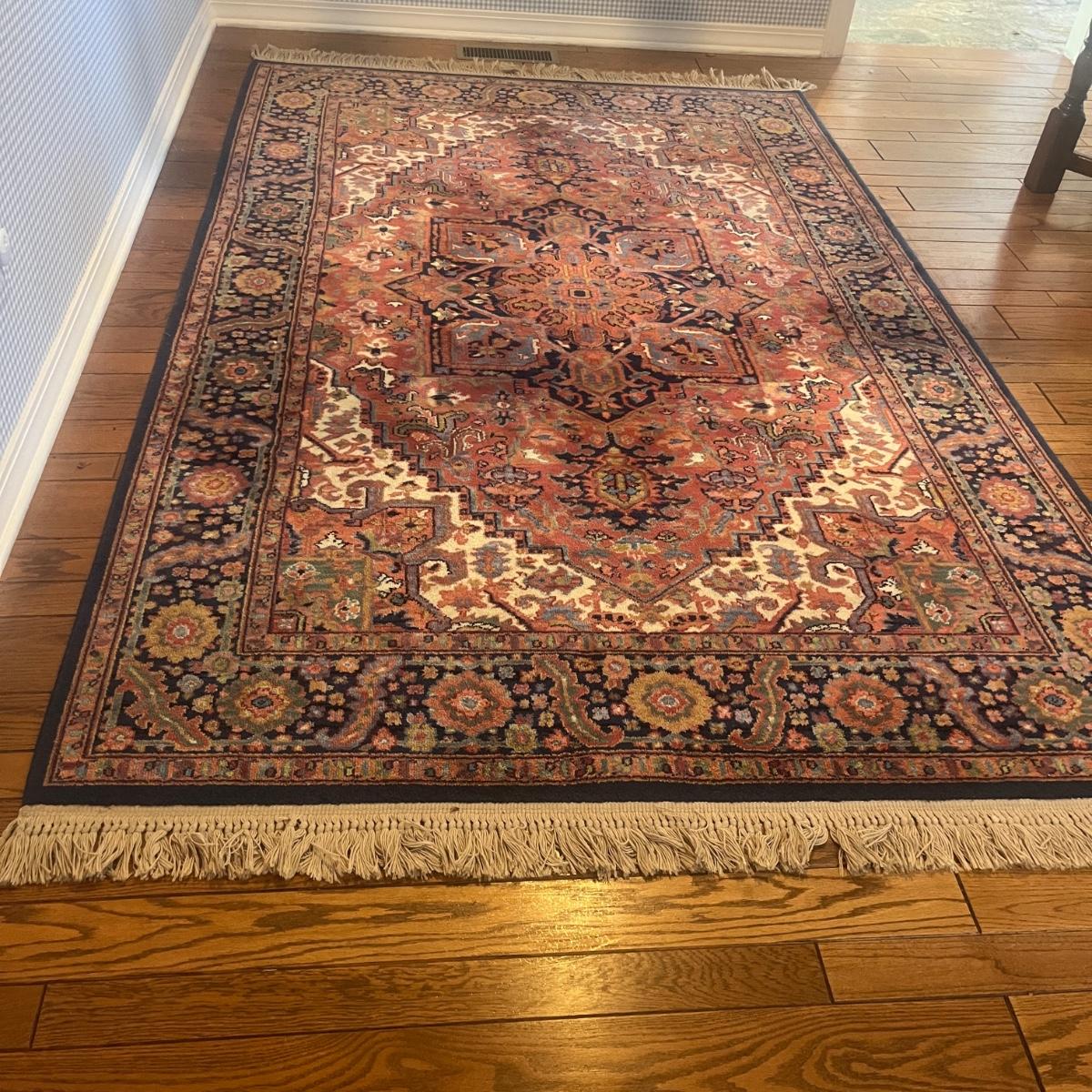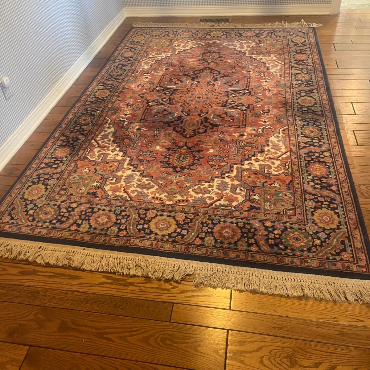 This area rug measures 70” x 116” and is predominantly red with dark blue accents.