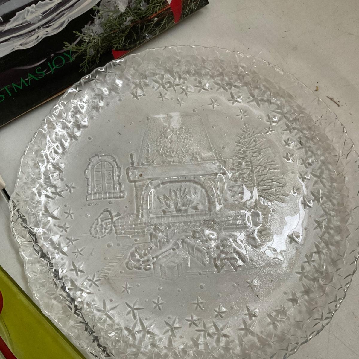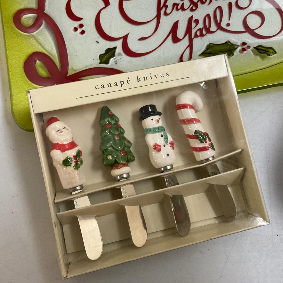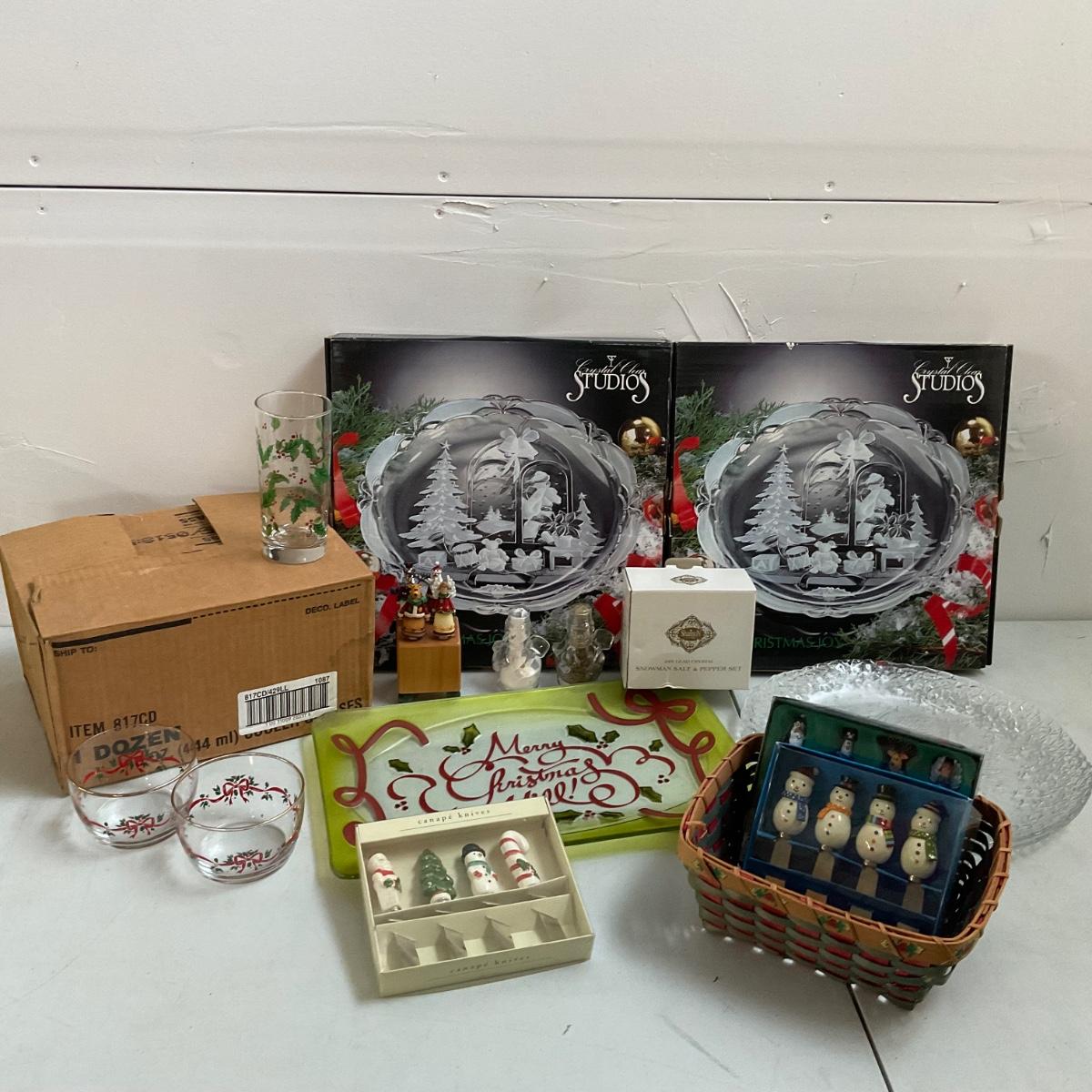 four large 13" round glass platters, canapé knives, glass salt and pepper snowmen, 12 glass holly tumblers and more