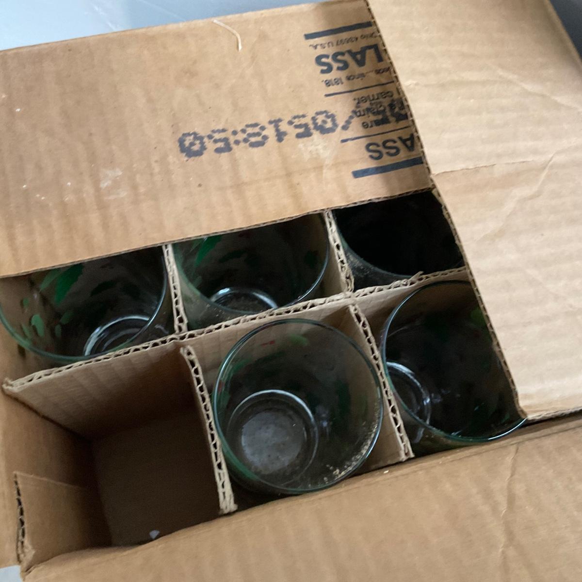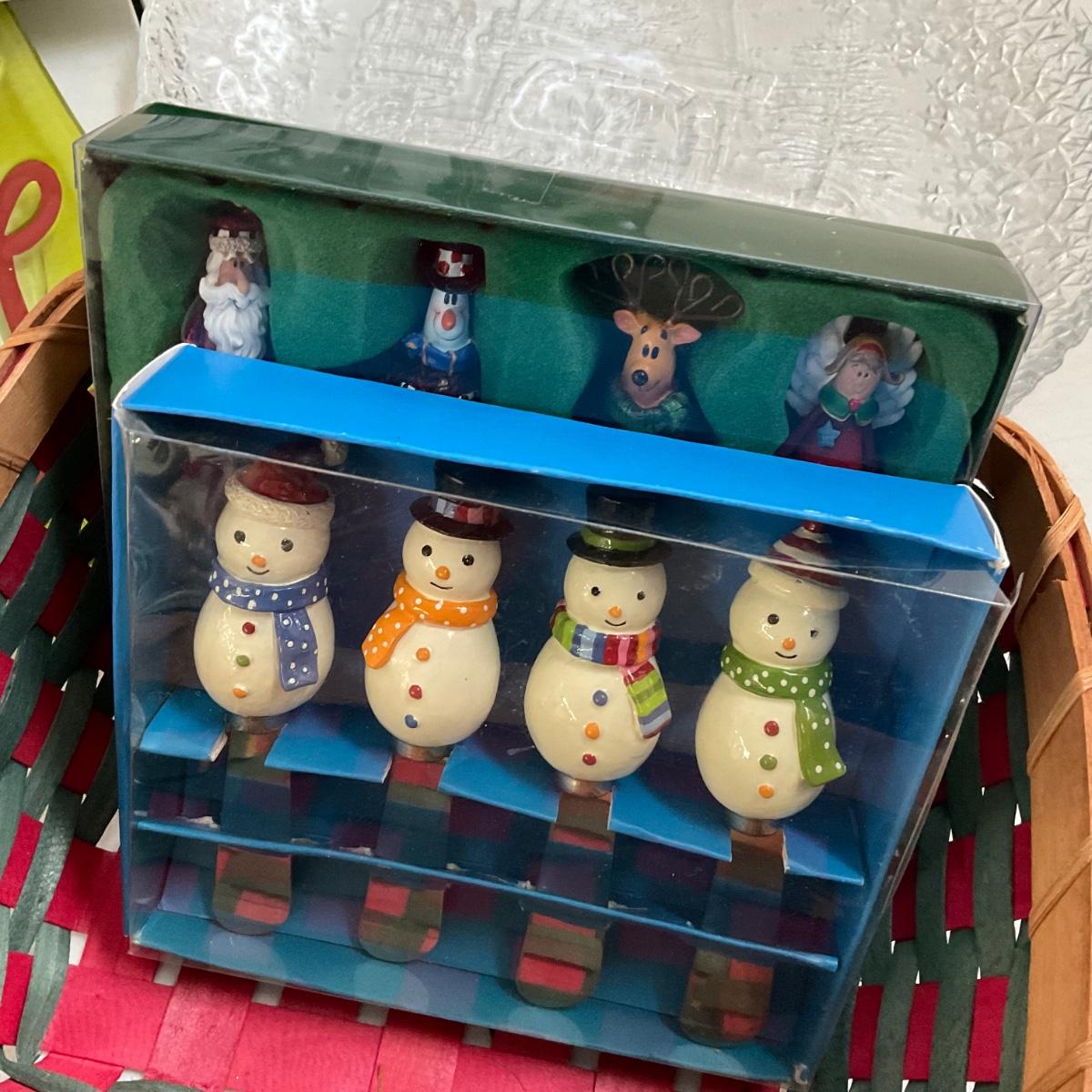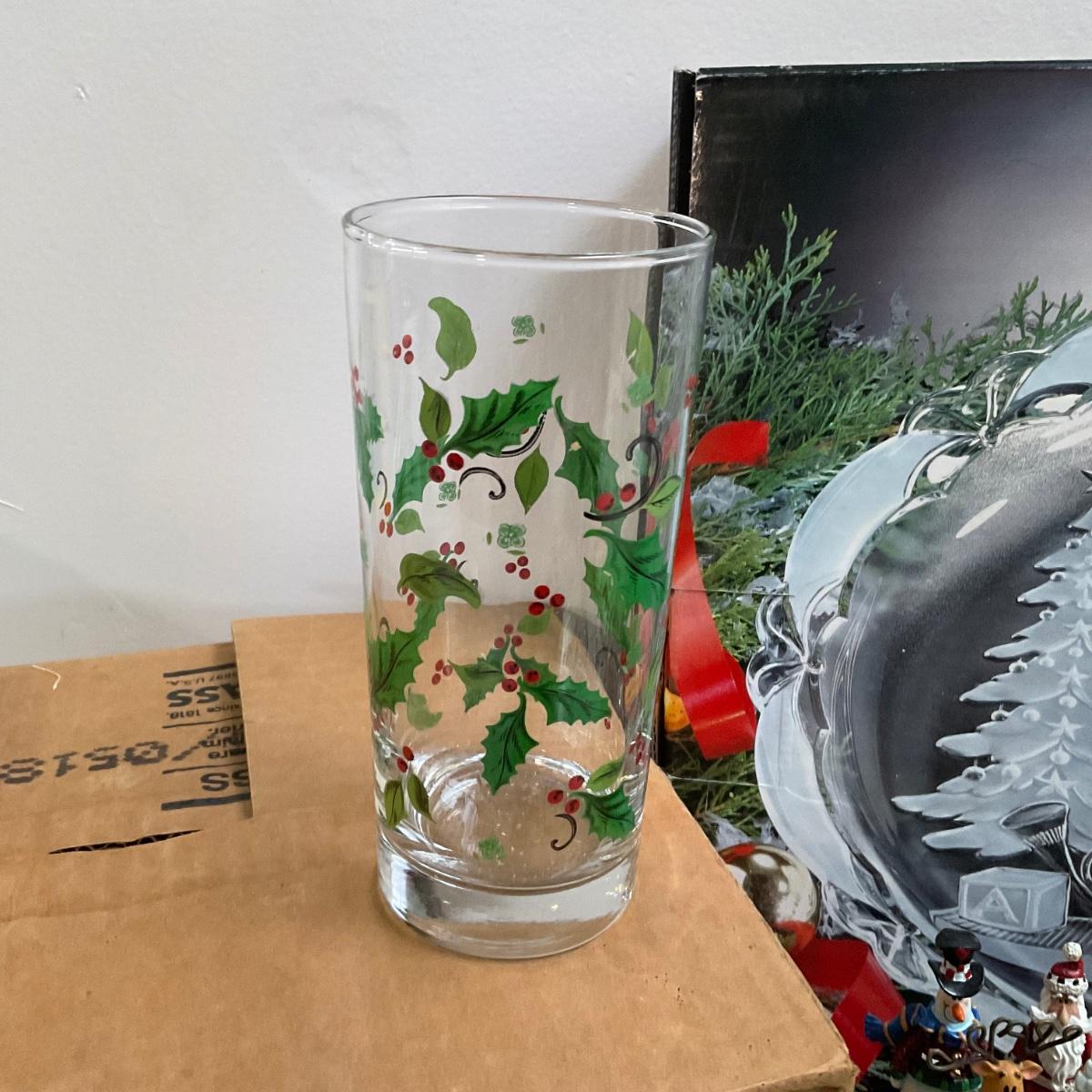 four large 13" round glass platters, canapé knives, glass salt and pepper snowmen, 12 glass holly tumblers and more