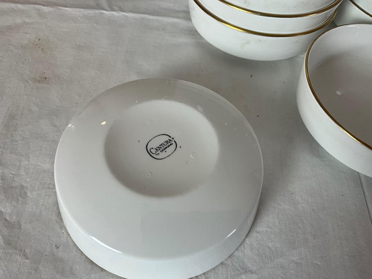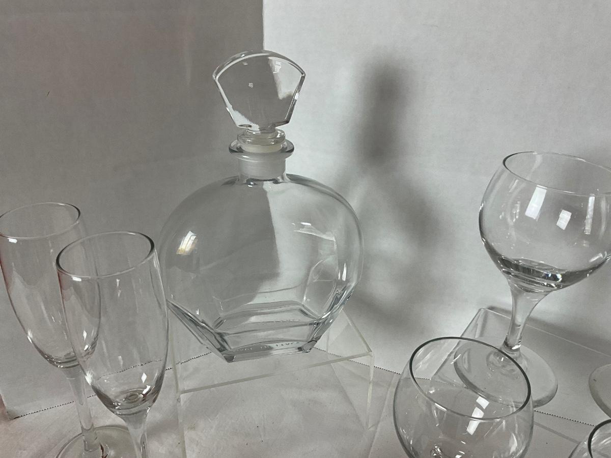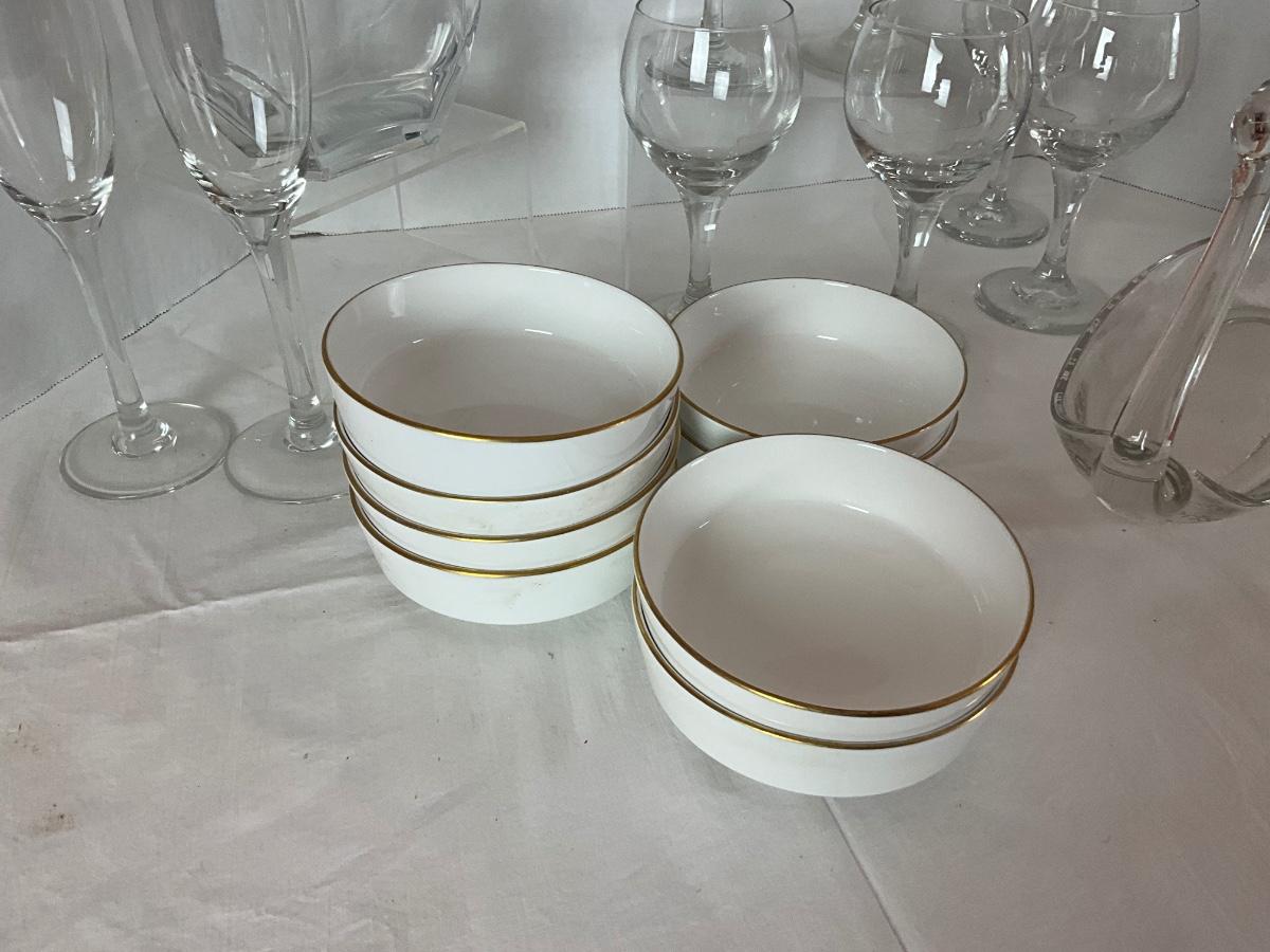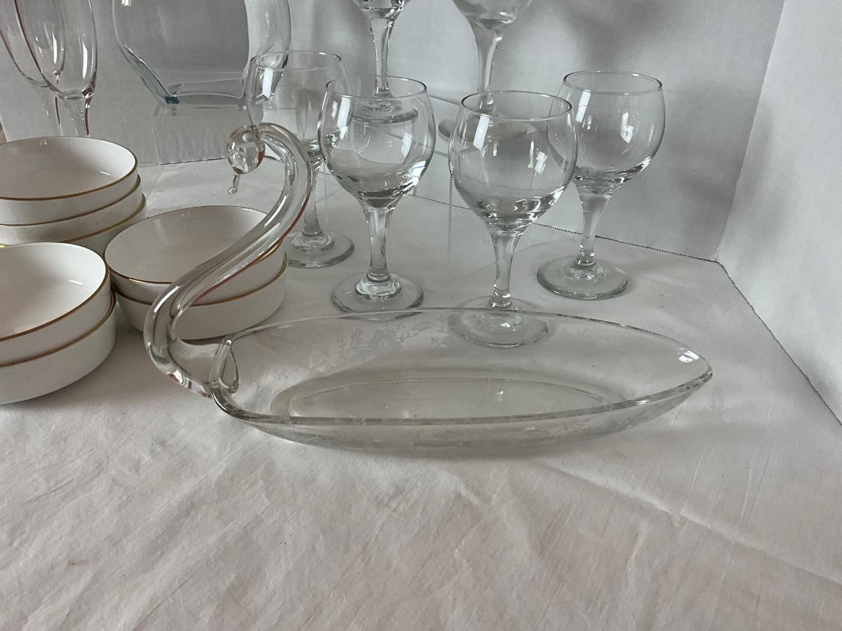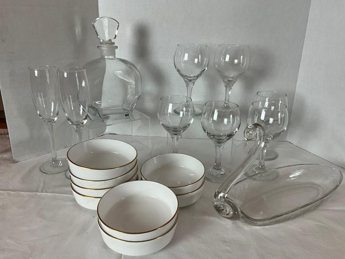 Italian Decanter & Glasses to include: 2 champaign, 6 wine, ATB Fostoria etched swan serving dish- 13"W x 5"D x 6"H, 8 gold rimmed Centura by Corning round shallow bowls-5"diameter x 1"H