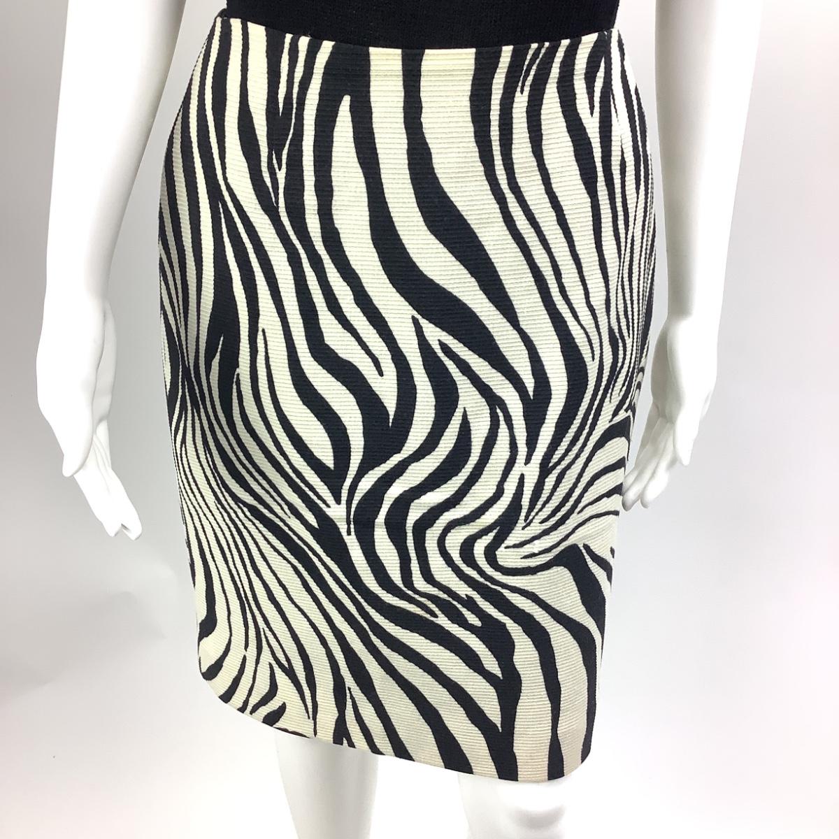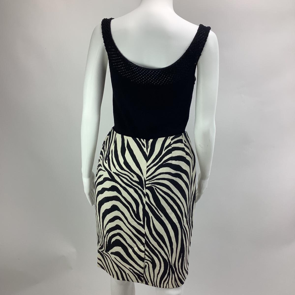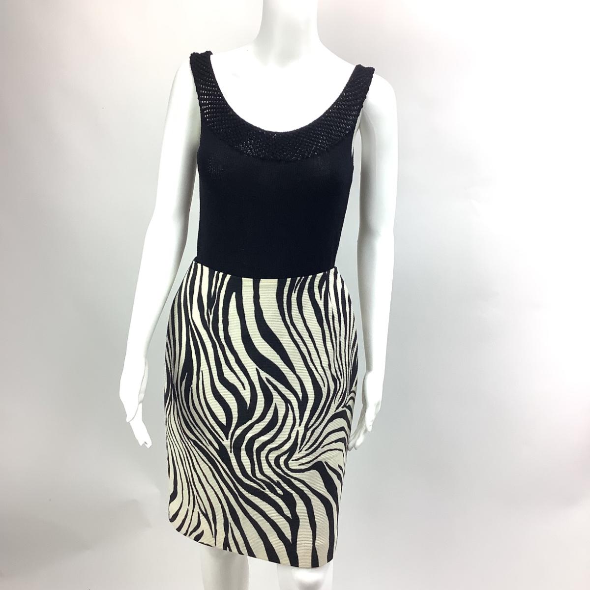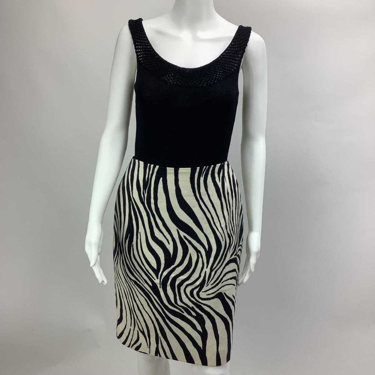 The knit tank is size medium by Ralph Lauren, measures 16" from armpit to armpit and 25" overall length. The skirts is zebra striped by Dana Buchman size 6, 100% wool and fully lined. It measures 13" from hip to hip when flat, 21" overall length.