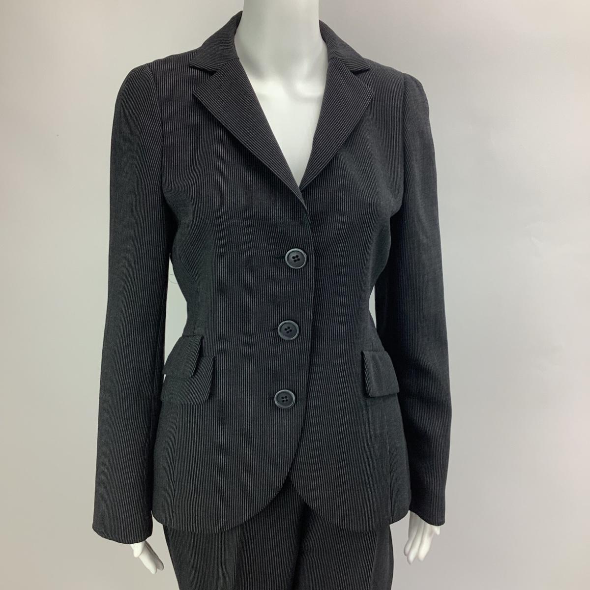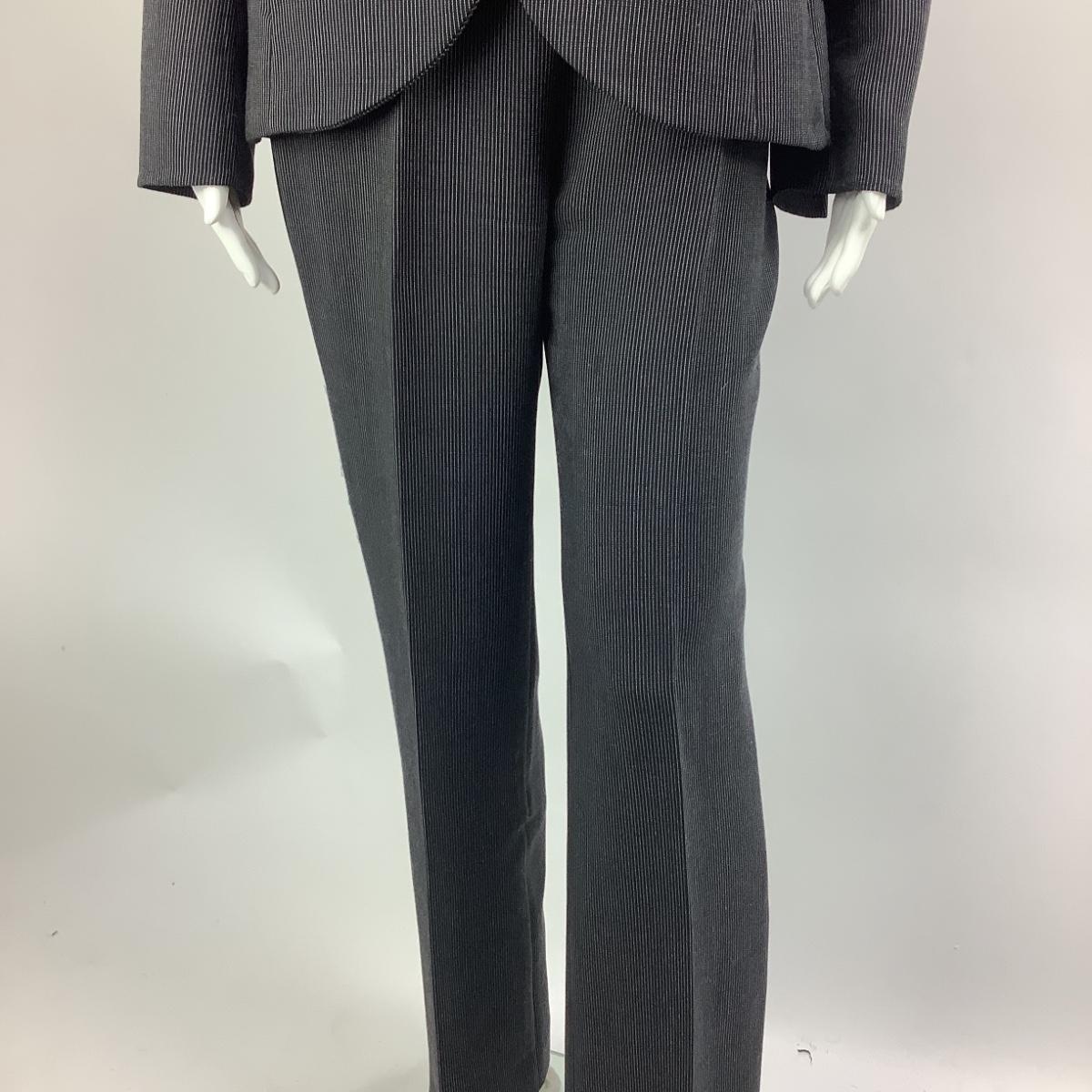 Suit is wool blend, the jacket is size 8 and the pants are a size 6. The measurements for the jacket is 19" from armpit to armpit and 27" overall length. Pants measure 13" from hip to hip when flat and 40 in length with inseam at 30".