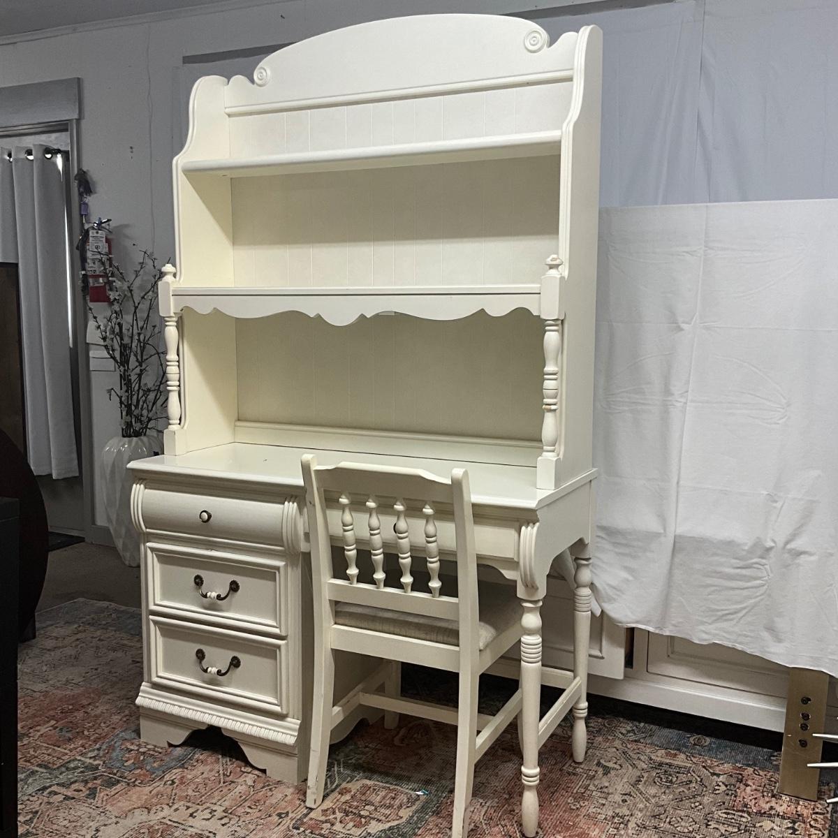 Measures 44" wide x 18.5" deep x 30" high (desk) w/ shelf 75" high