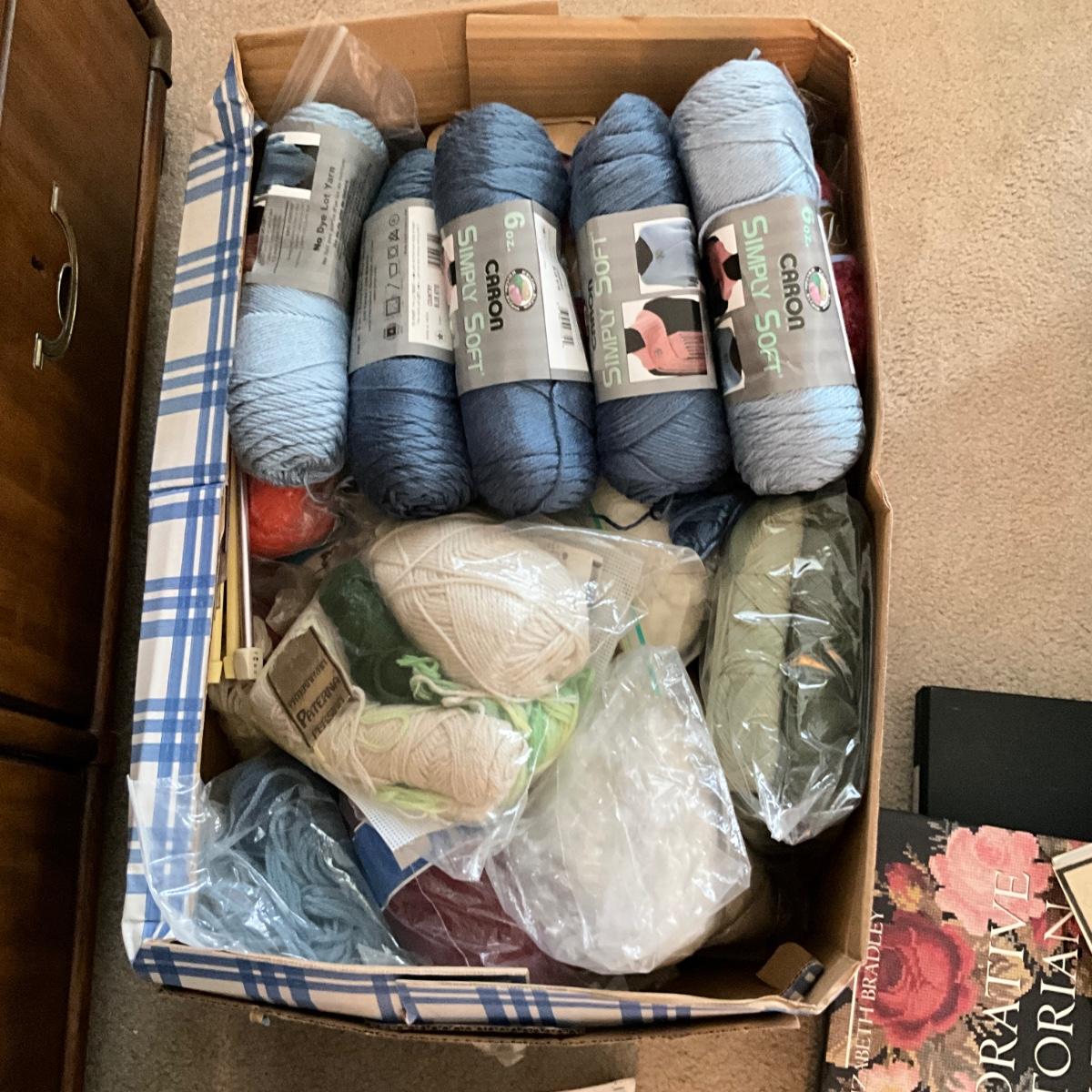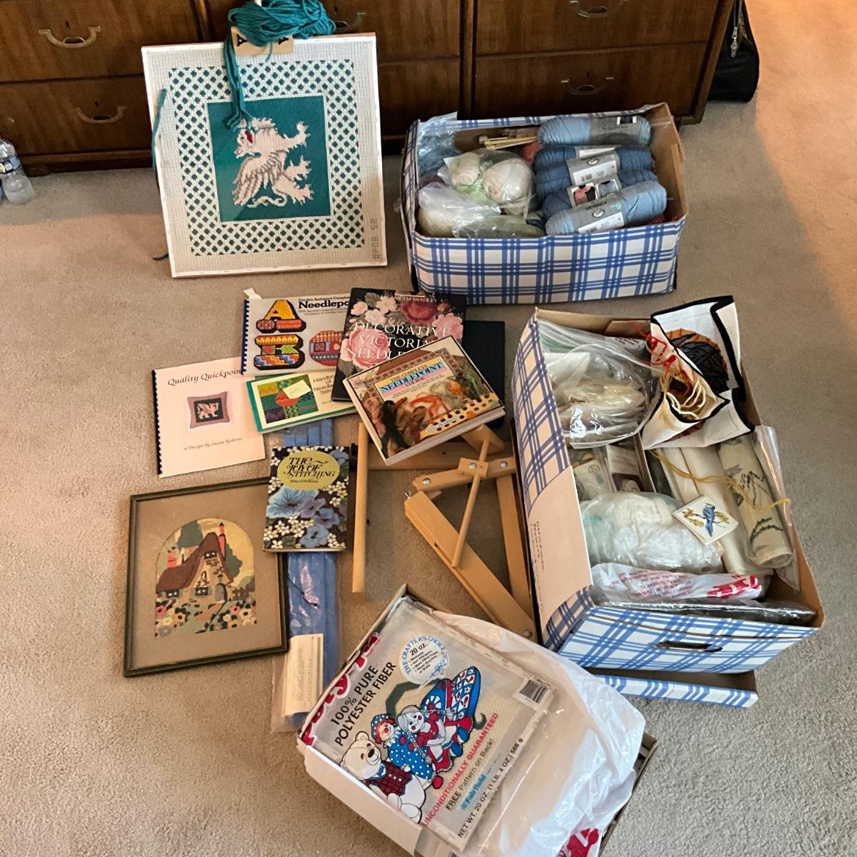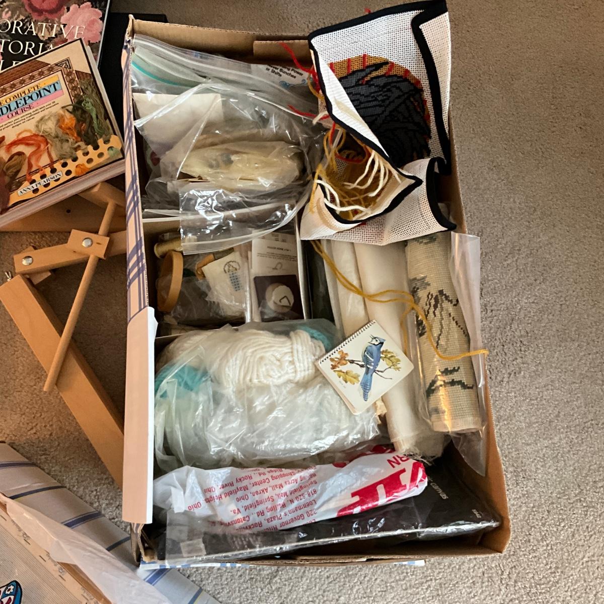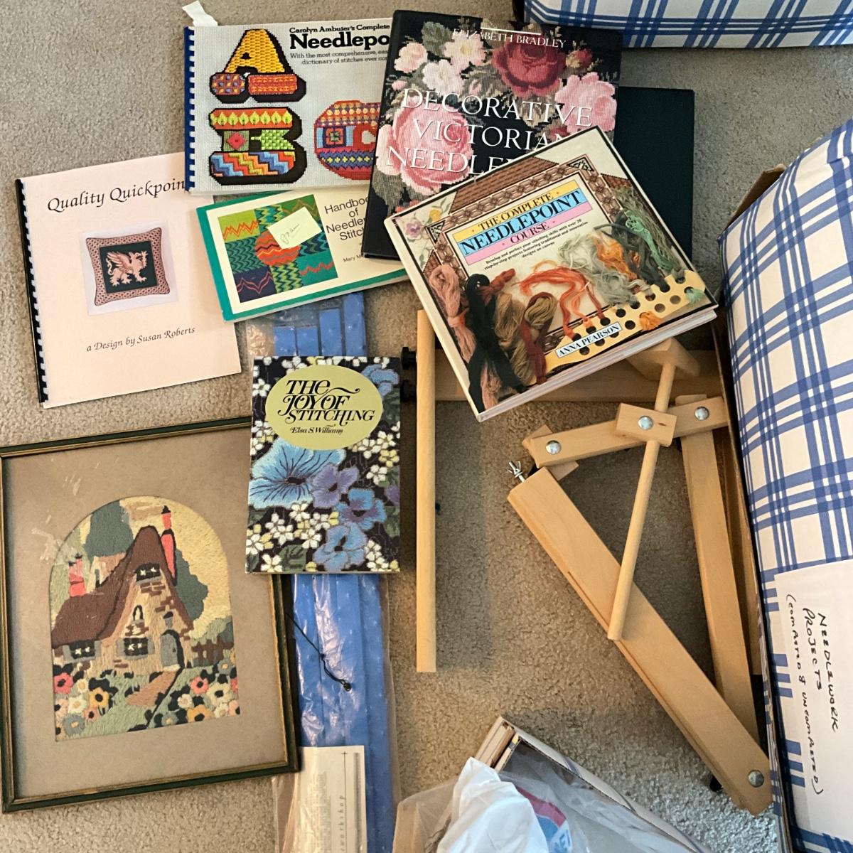 This includes all three boxes of materials and supplies. Framed Needlepoint art, and various needlepoint books