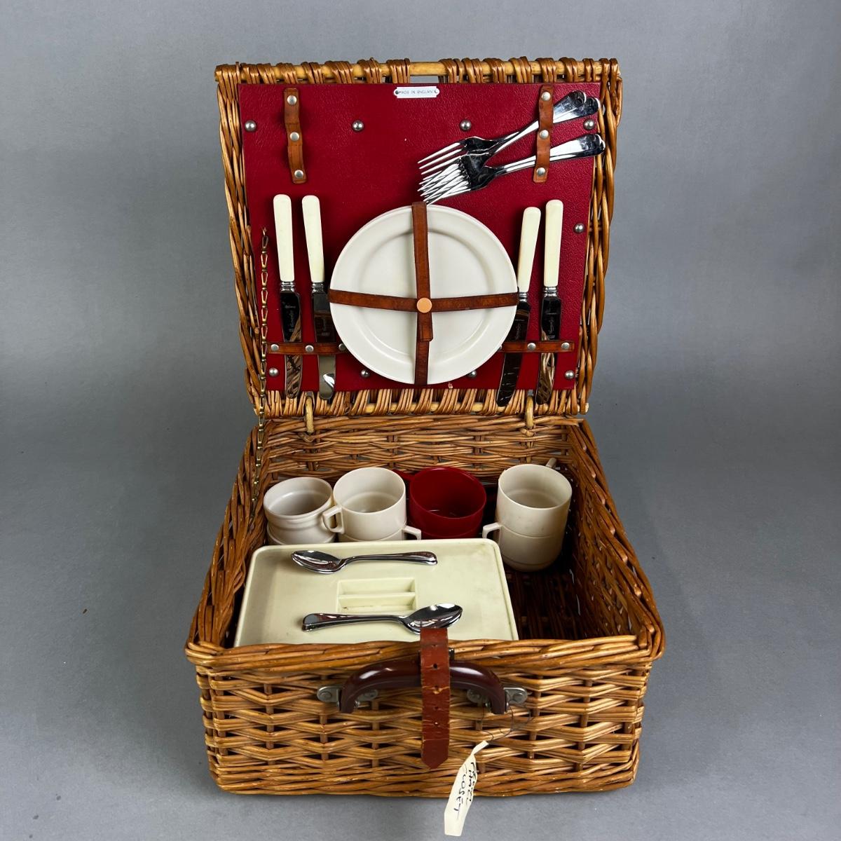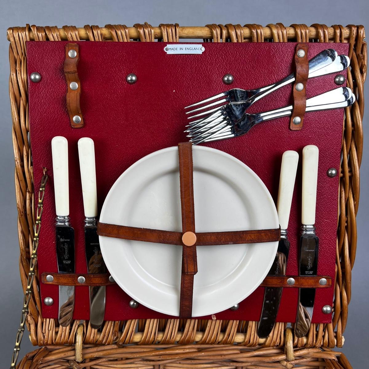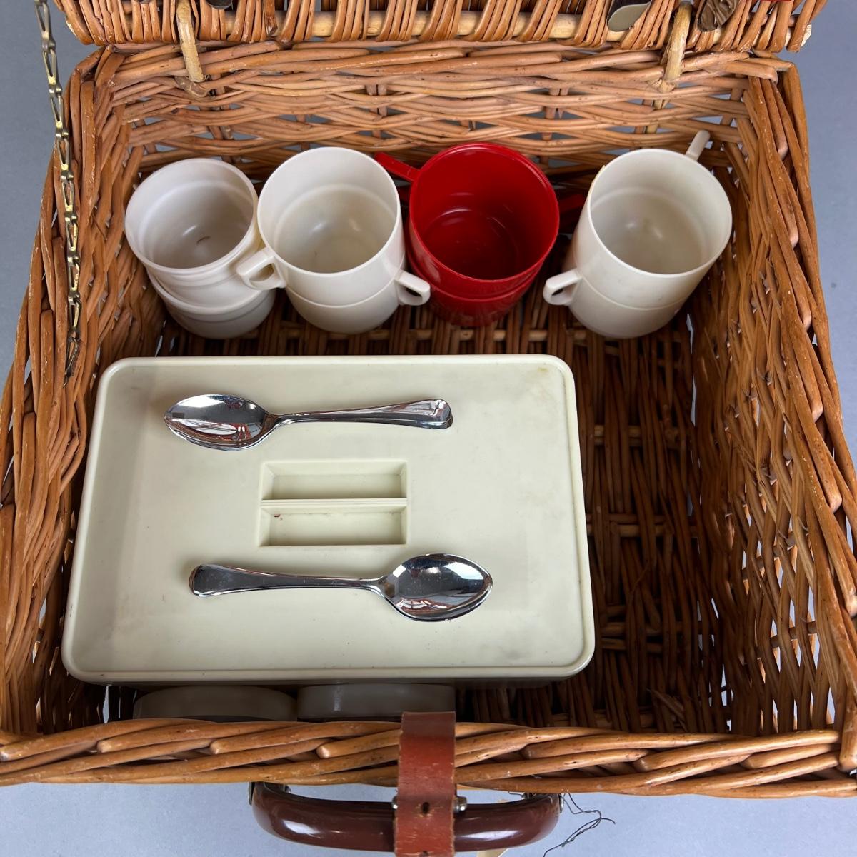 Includes 8 cups, 4 plates, 4 forks, 4 spoons, 1 containers, and includes leather holders for utensils, but top left leather holders are ripped.