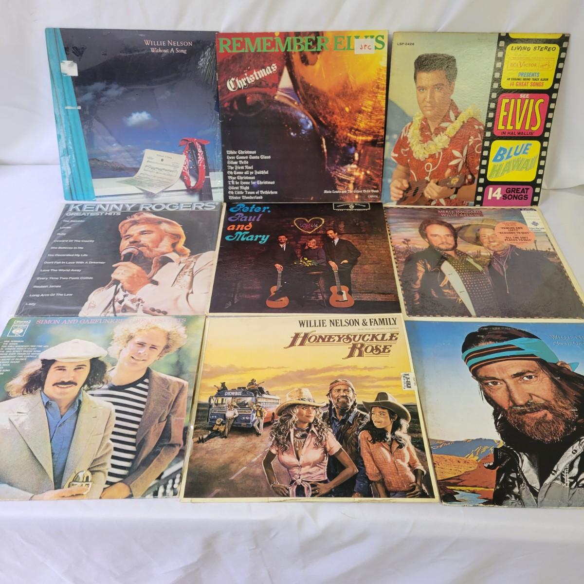 An assortment of over a dozen albums of 70s folk, rock, and country music including vinyl by Elvis, Willie Nelson, Kenny Rogers and more. Shipping available. All sales are final. No returns or refunds. Please bid accordingly.