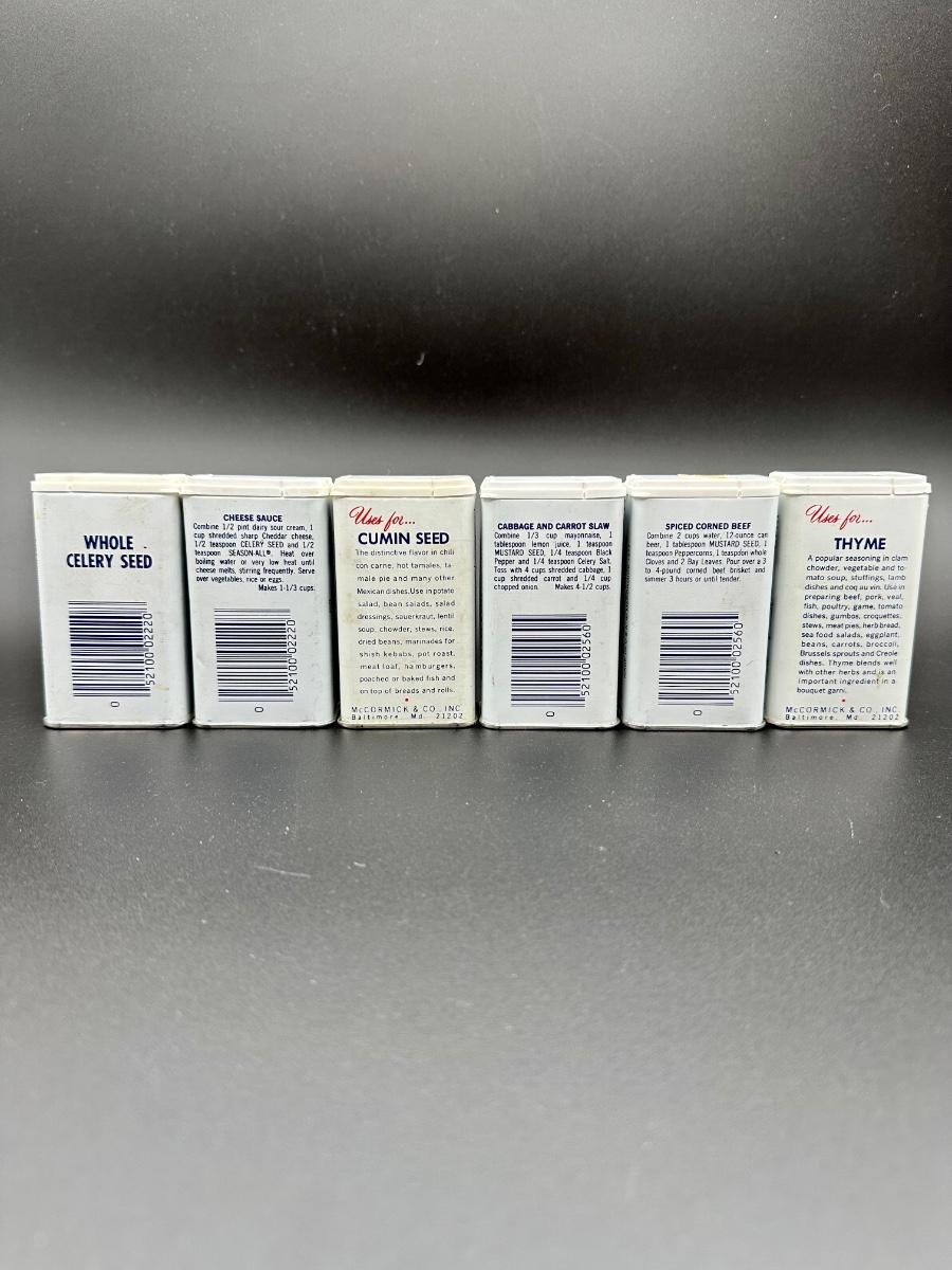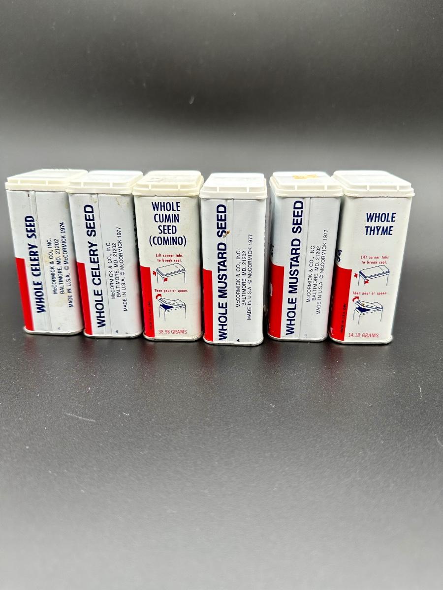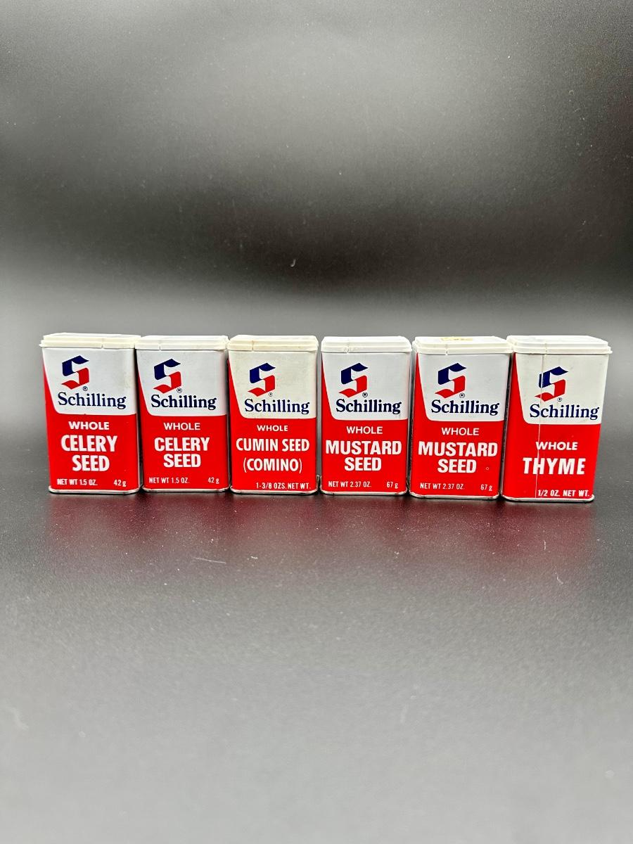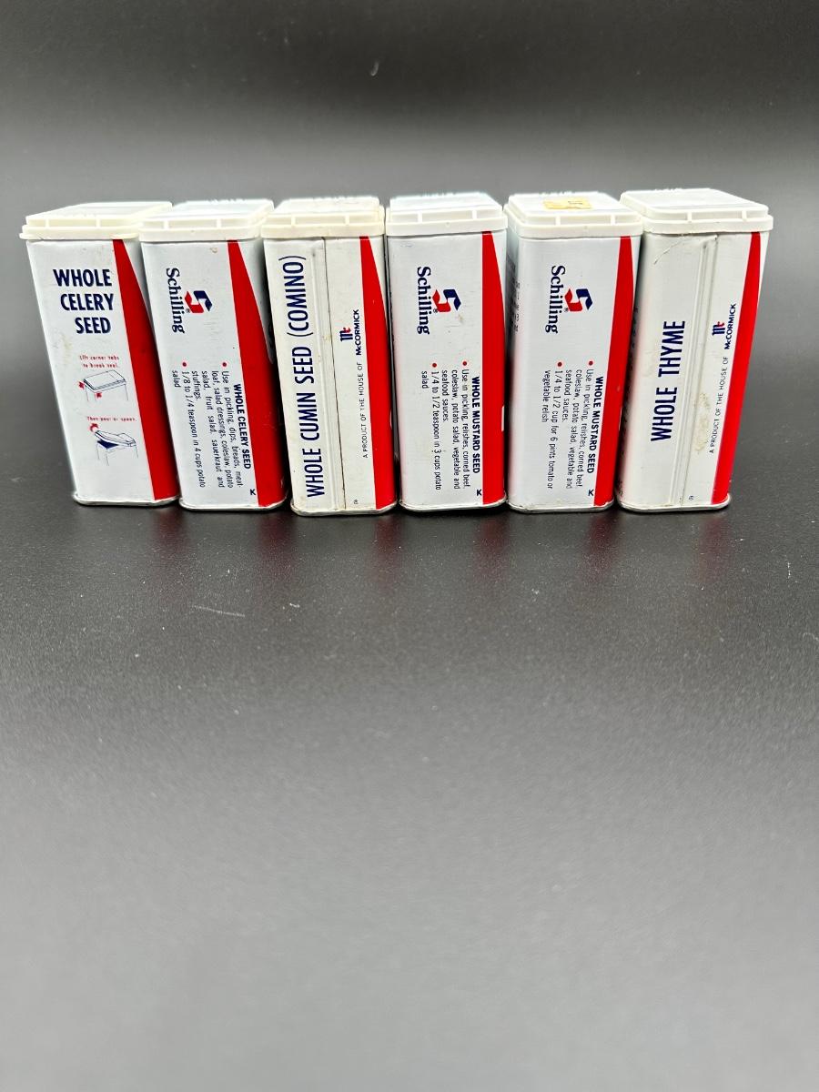 Tall vintage Schilling metal spice tins (6) from the 1970’s