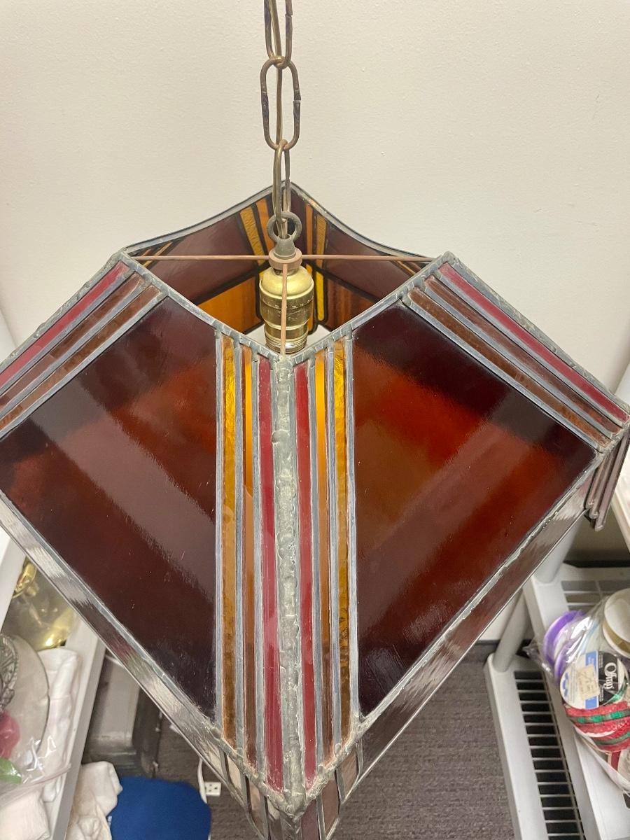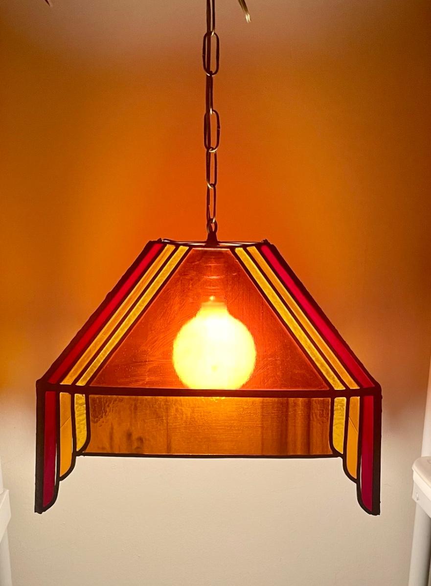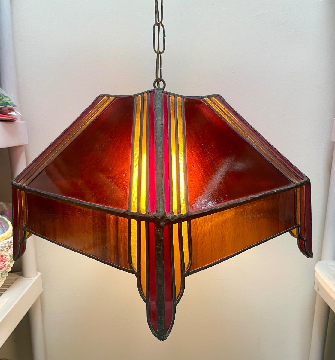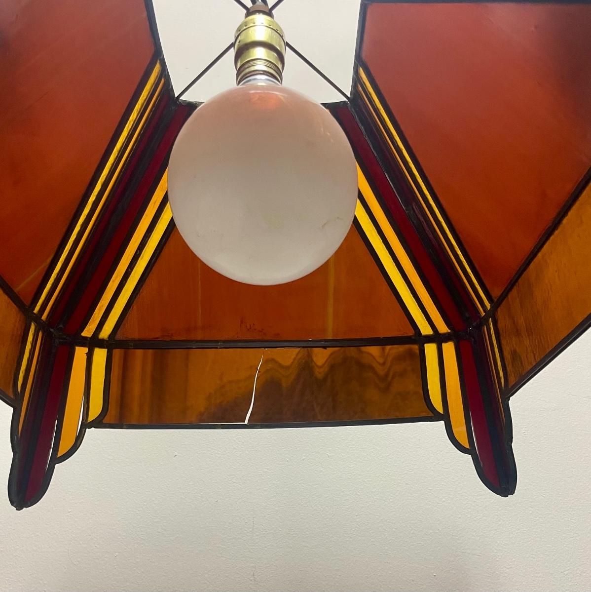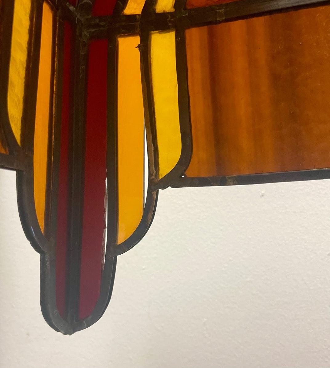 Red,orange and yellow stained glass. Art Deco inspired. Tested, works as expected. Some slight damage to the lamp, see photos for details.