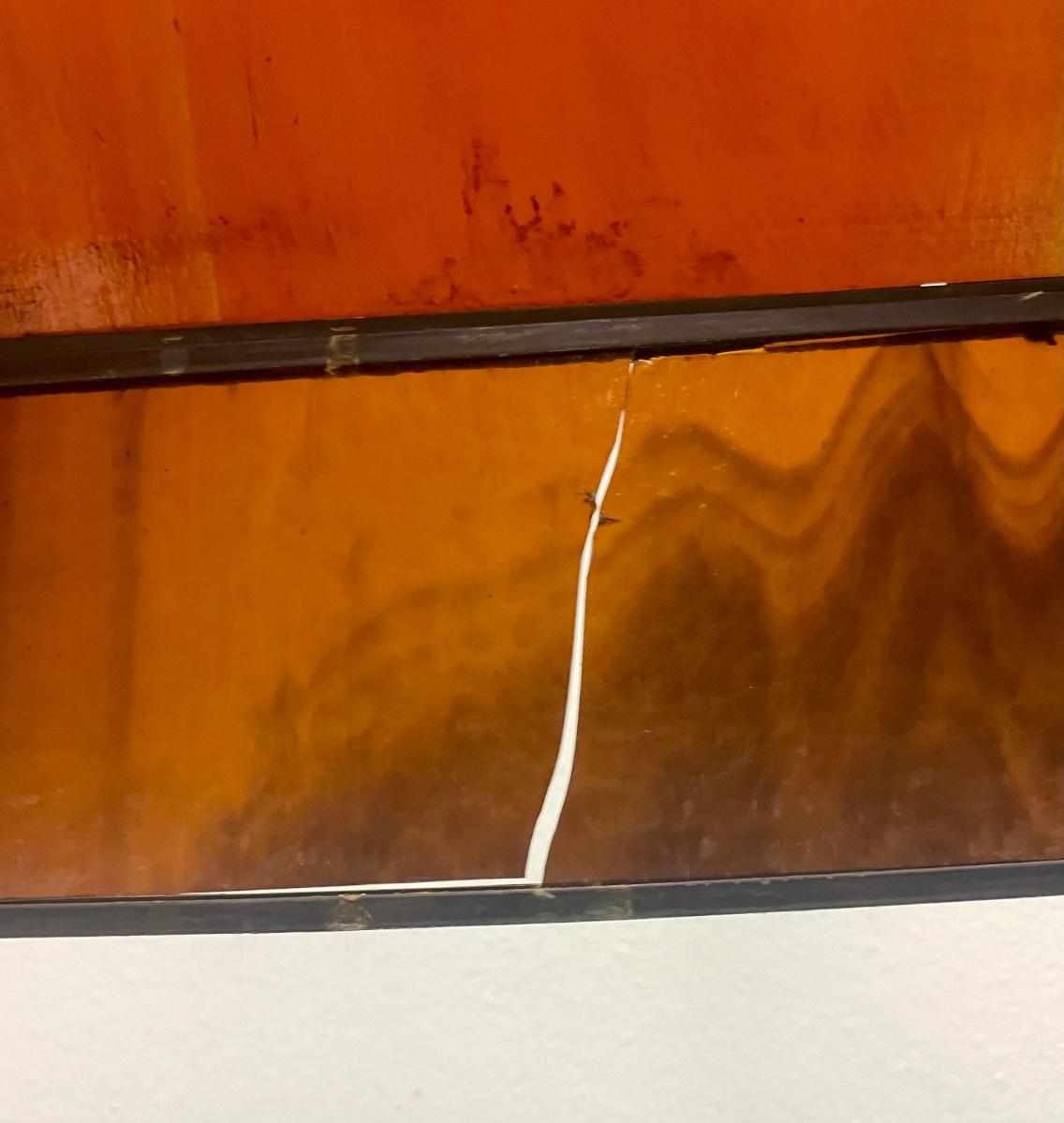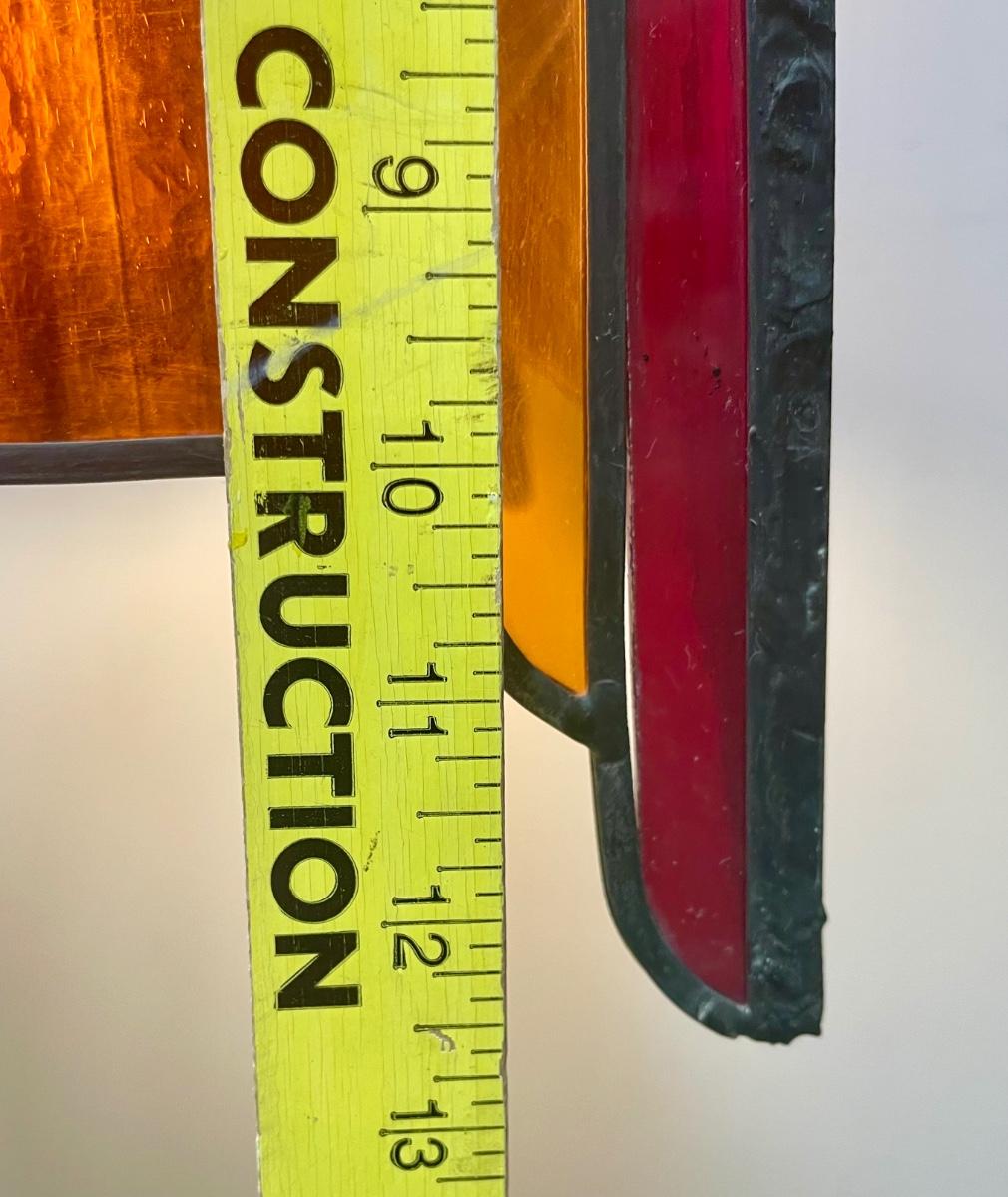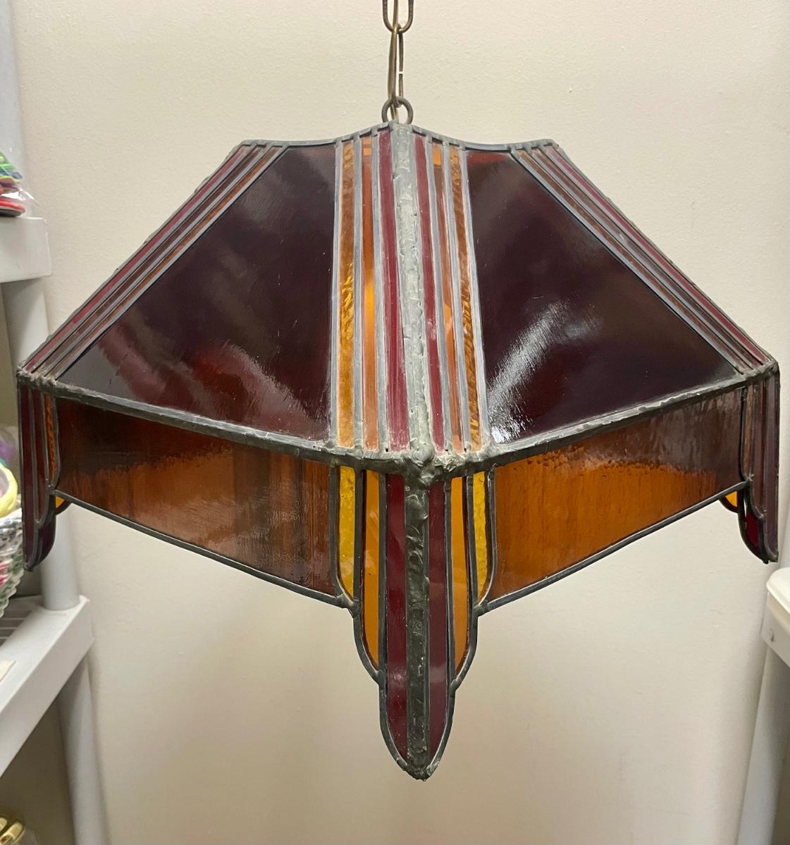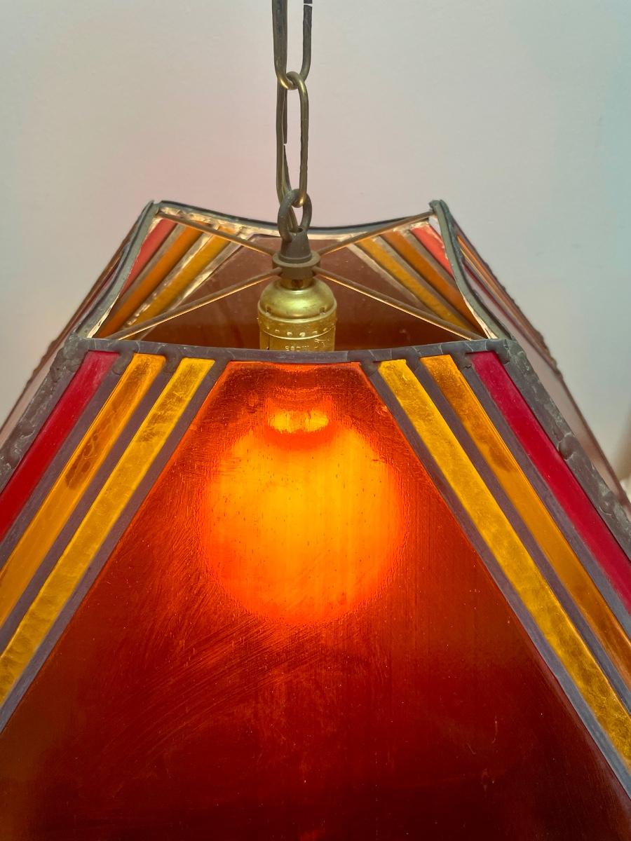 Red,orange and yellow stained glass. Art Deco inspired. Tested, works as expected. Some slight damage to the lamp, see photos for details.