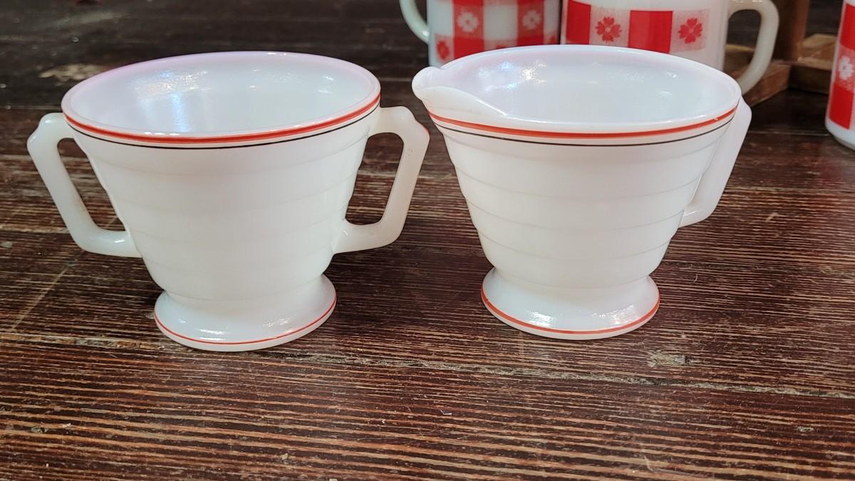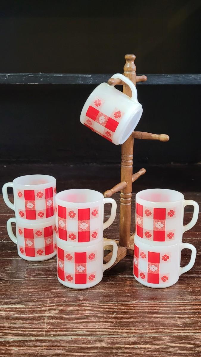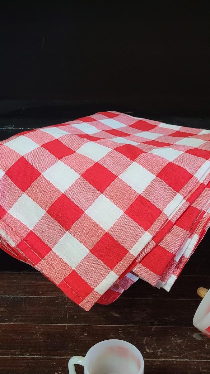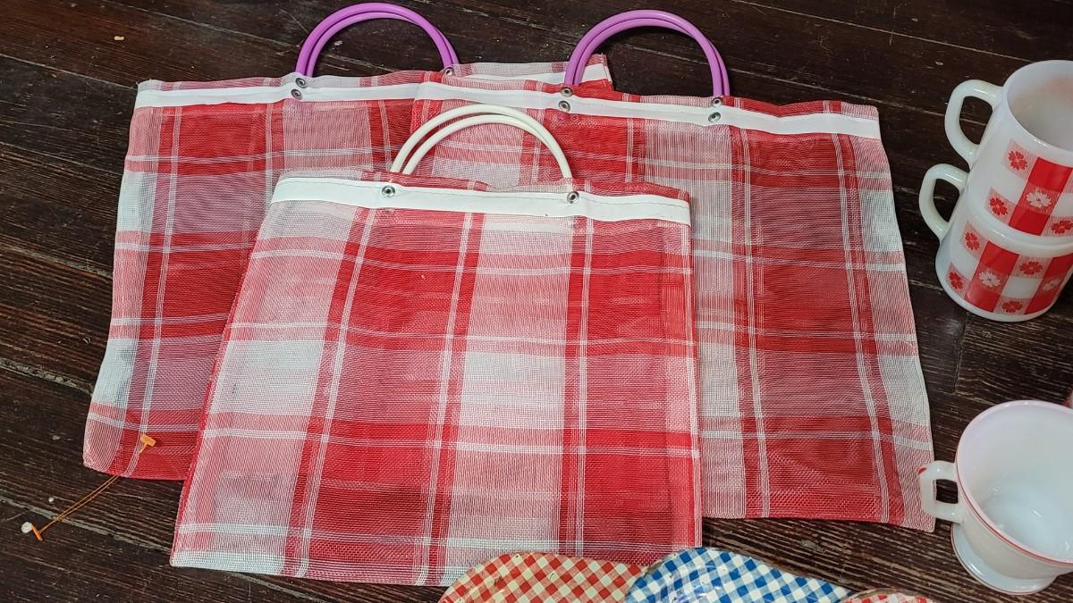 71: Vintage Red & White Checkered Coffee Cups, Tablecloth, Bags & Trays