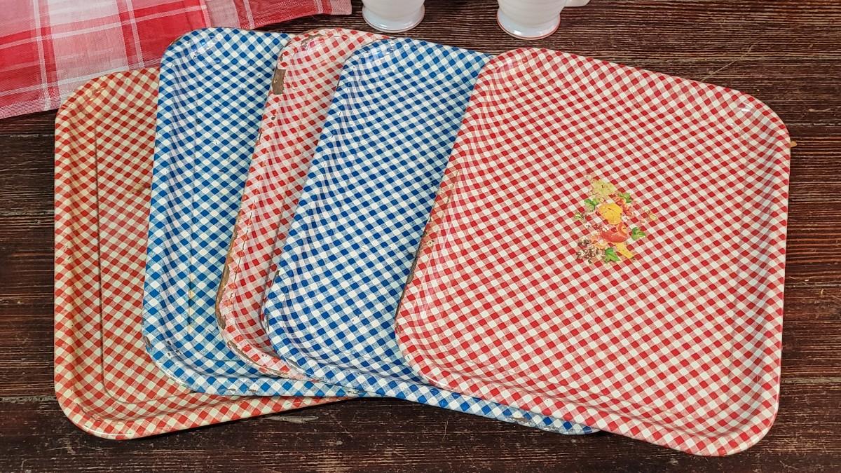 Blue & White Checkered Metal Trays are mixed in with red and white trays