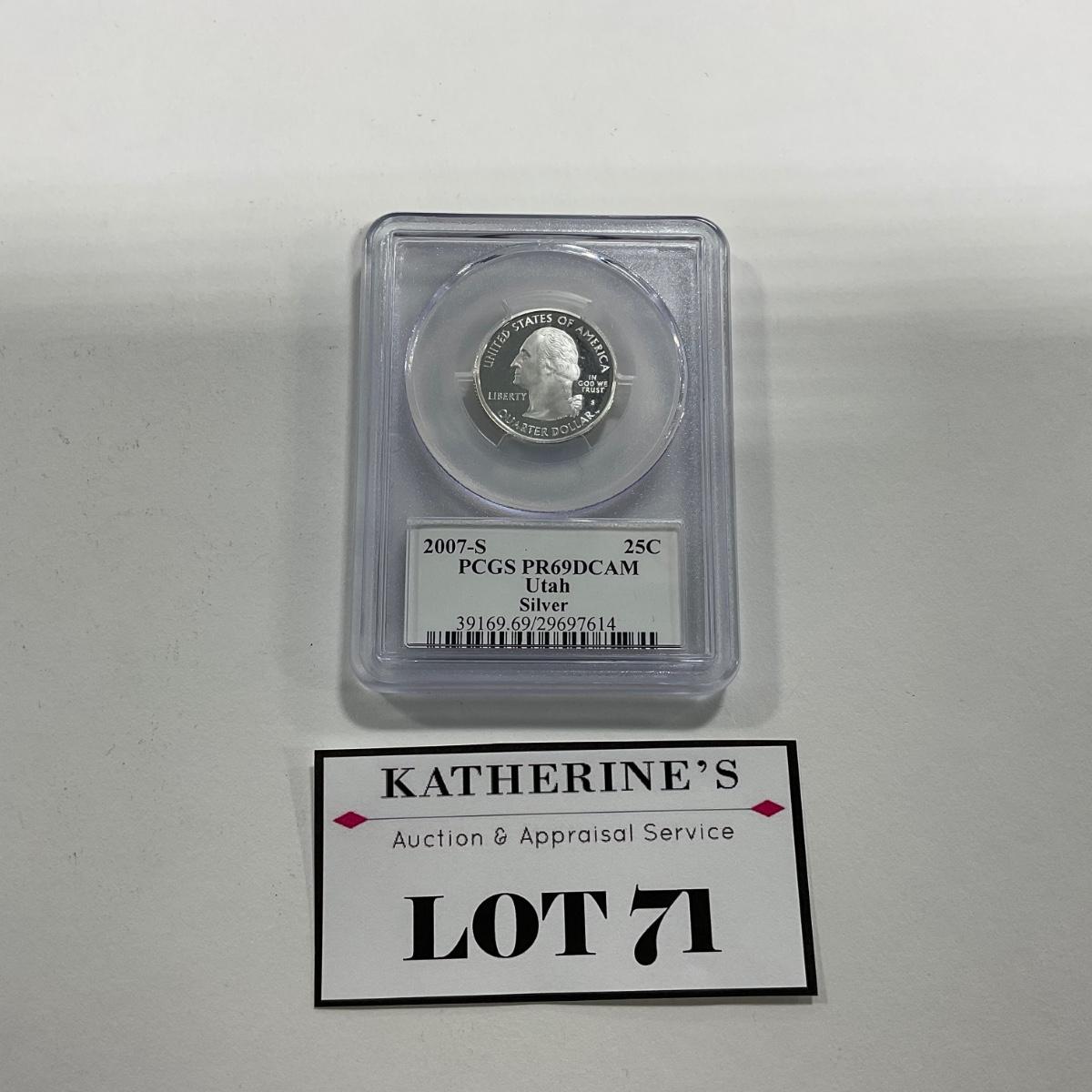 One 2007-S Silver Washington Utah State Quarter proof PCGS PR69 DCAM coin. Please see photos for details and condition. ::: Shipping is available on this lot. If you require shipping you must let us know at the close of the auction. We will coordinate with you after the item has been won. Shipping fees will include insurance up to or exceeding the value of all items being mailed. If you have any questions regarding this lot please contact the auctioneer either via this website, by direct email or by phone. PICK UP TIMES and other important information can be found in the TERMS and DESCRIPTION of the auction. Please take a look for pertinent information. Thanks!