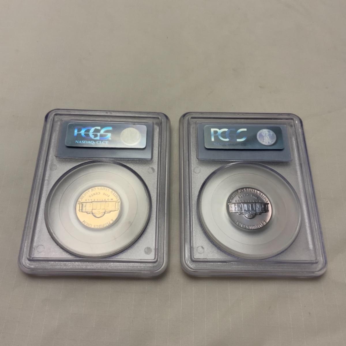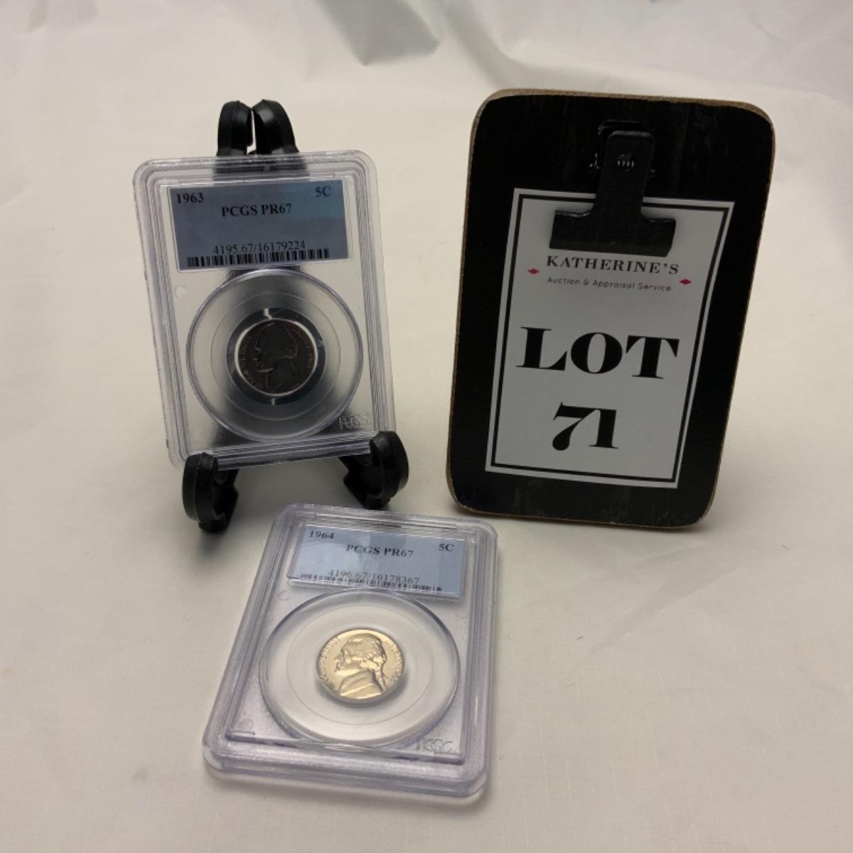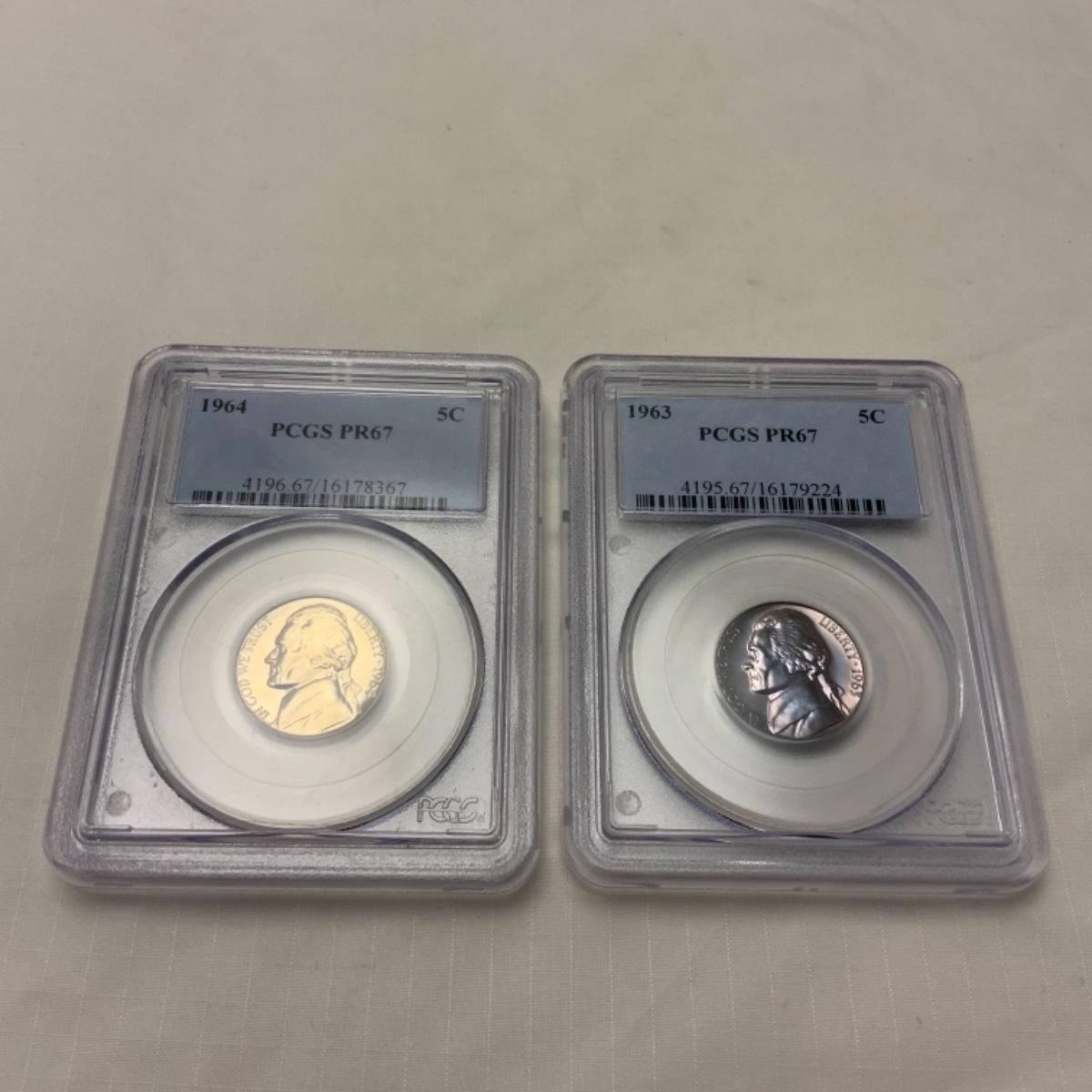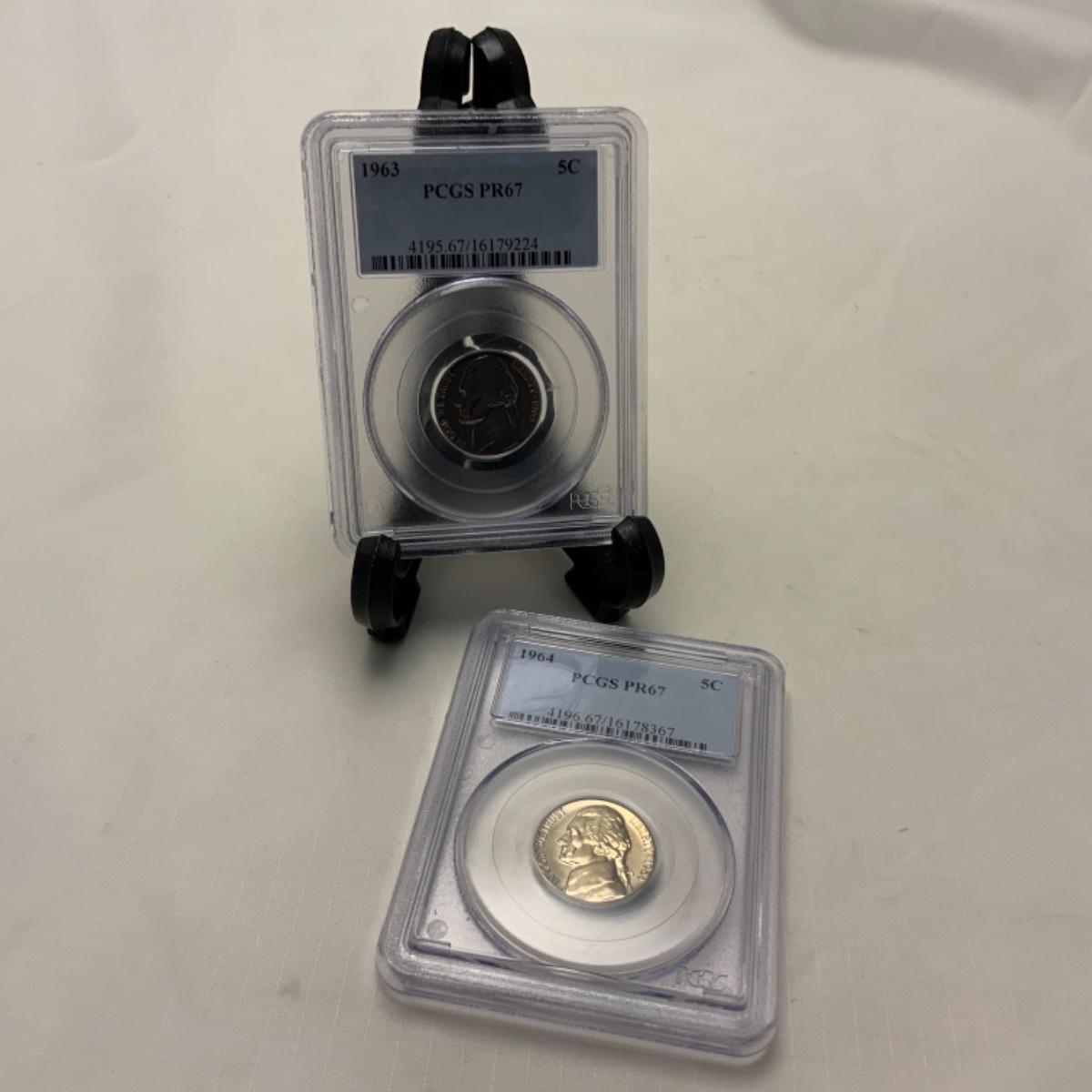 Two Graded Jefferson Nickels from 1963 and 1964. Both graded at a PR 67 by PCGS. The 1963 has a rainbowing color across both sides. Please see photos for details and condition. ::: Shipping is available on this lot. If you require shipping you must let us know at the close of the auction. We will coordinate with you after the item has been won. Shipping fees will include insurance up to or exceeding the value of all items being mailed. If you have any questions regarding this lot please contact the auctioneer either via this website, by direct email or by phone. PICK UP TIMES and other important information can be found in the TERMS and DESCRIPTION of the auction. Please take a look for pertinent information. Thanks!