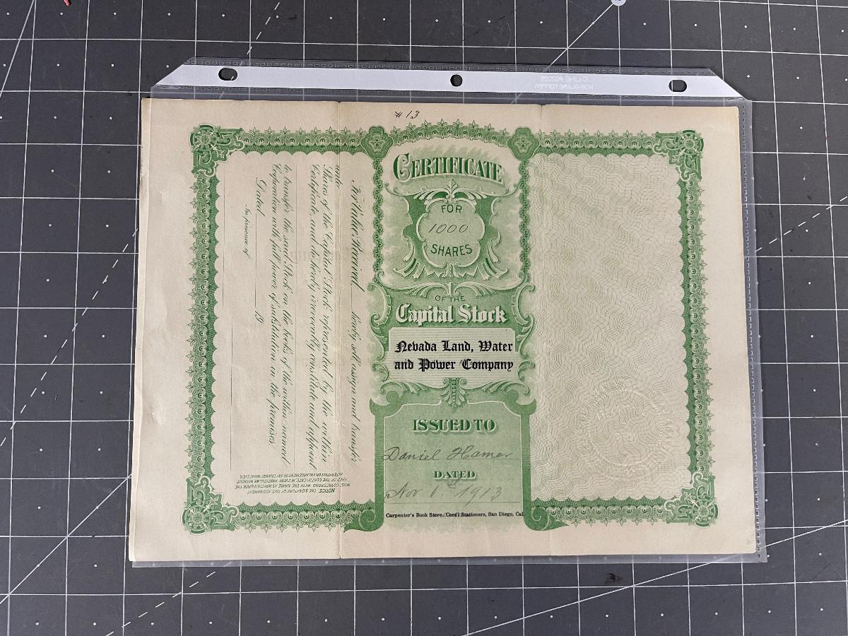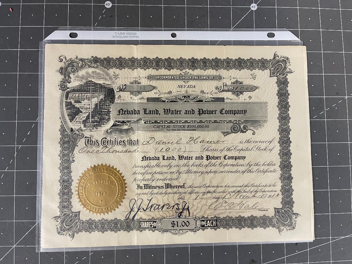 #71 Stock Certificate Nevada Land, Water and Power Company.