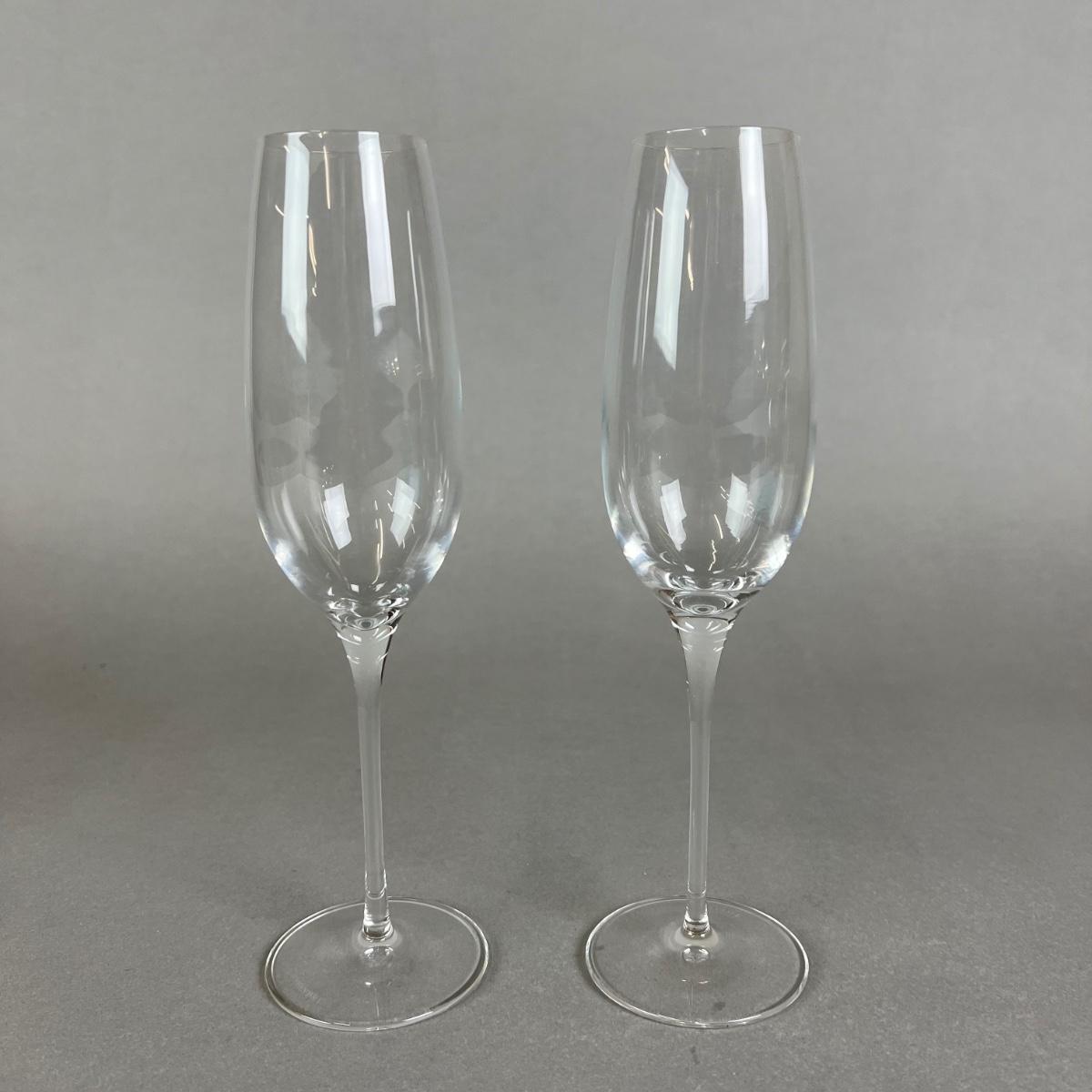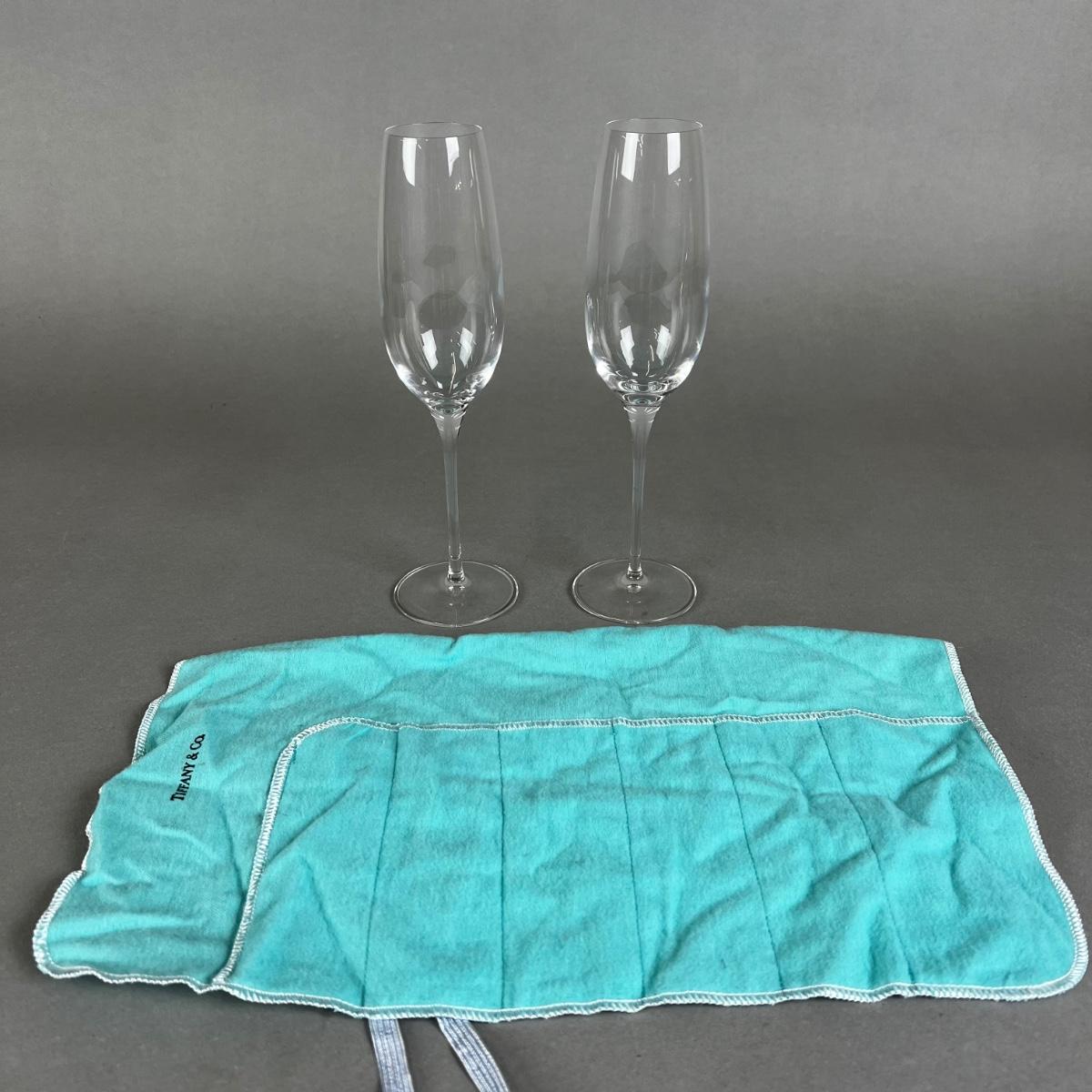 Champagne flutes marked Tiffany & Co also includes Tiffany & Co silverware bag, and Swing Design 4x6 picture frame.