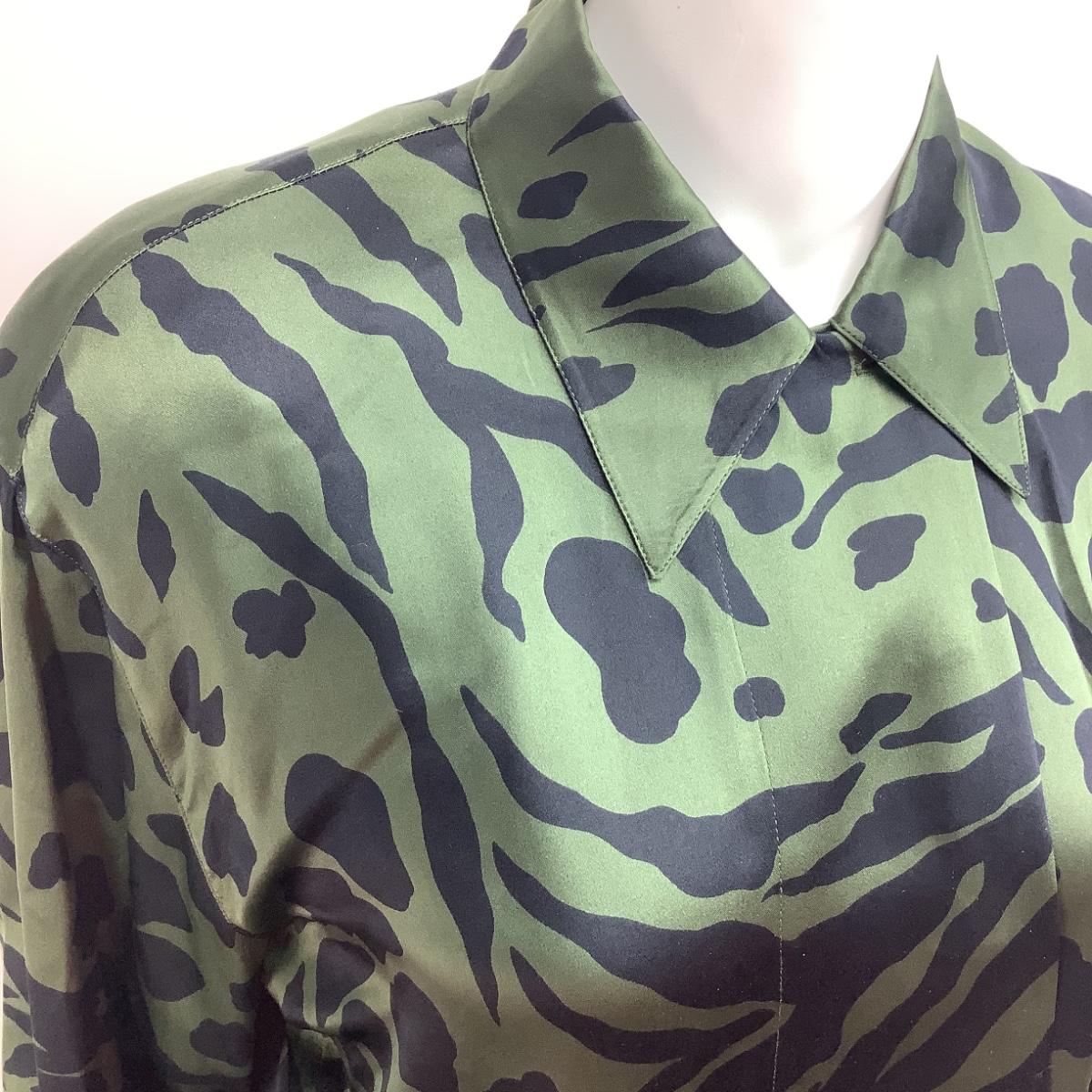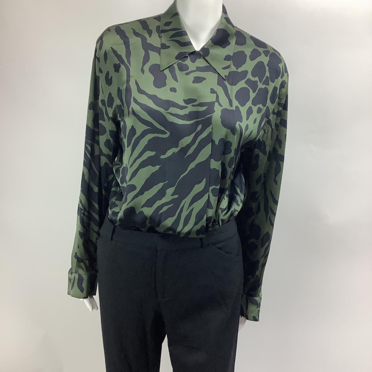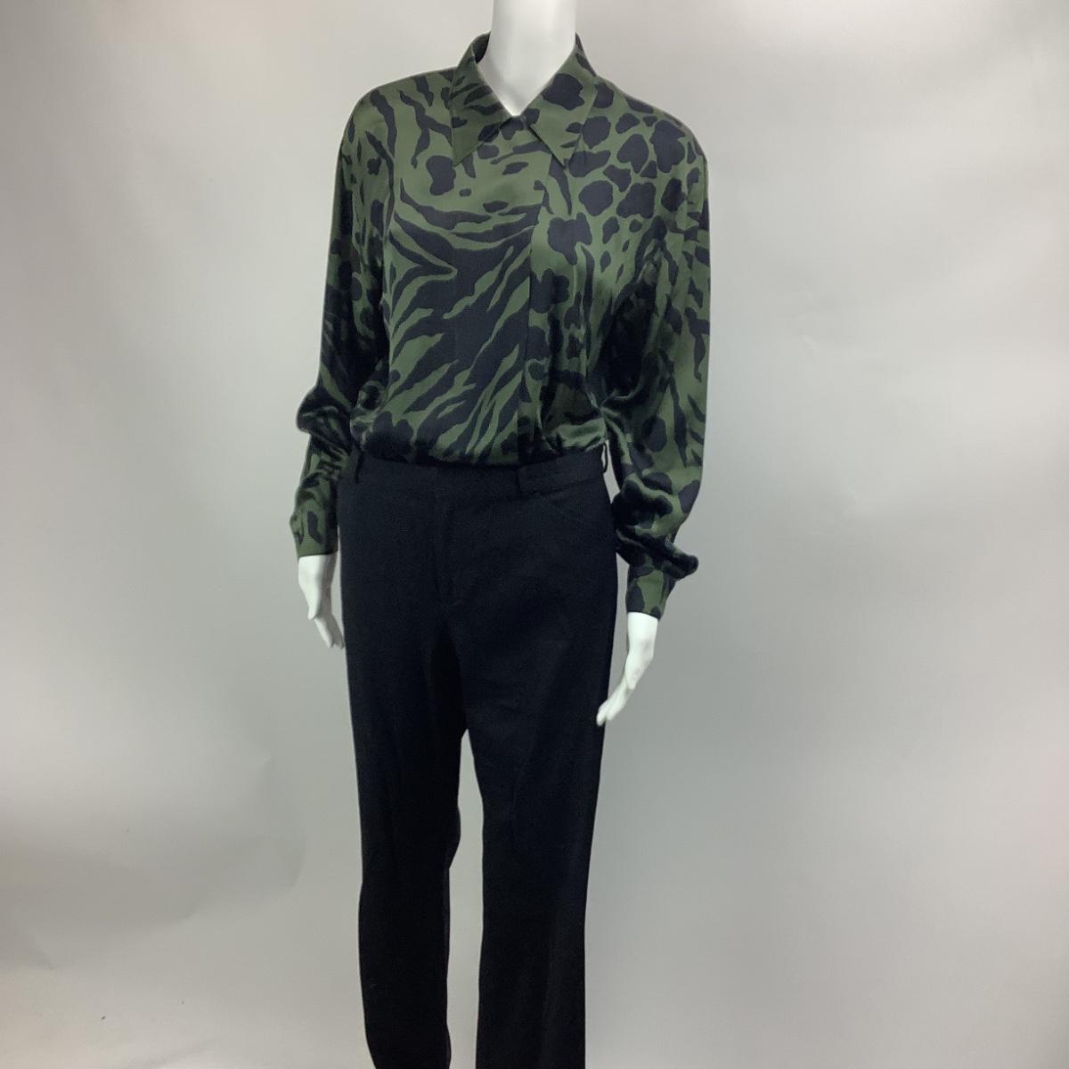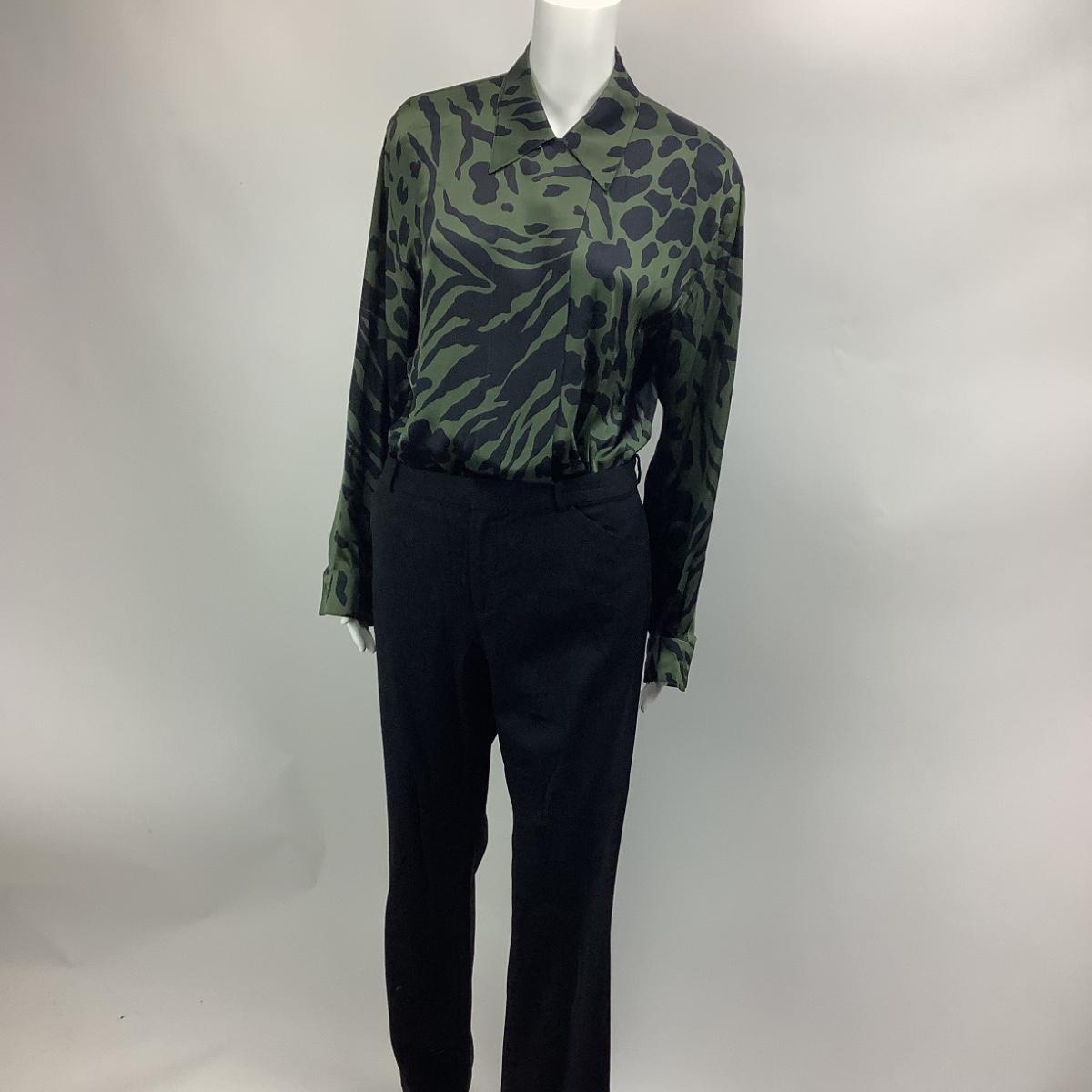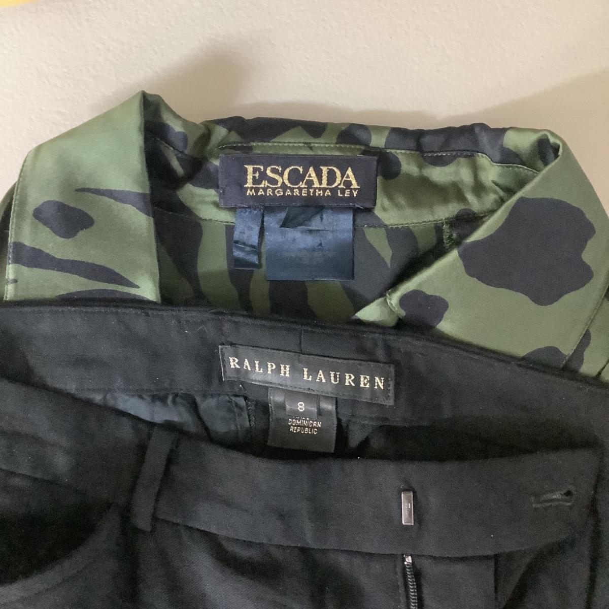 Escada green/black silk blouse is size 38 and measures 21" from armpit to armpit and 25" overall length. The pants are by Ralph Lauren Black Label, size 8, wool blend, measures 13" from hip to hip when flat, 42" overall length and the inseam is 30".