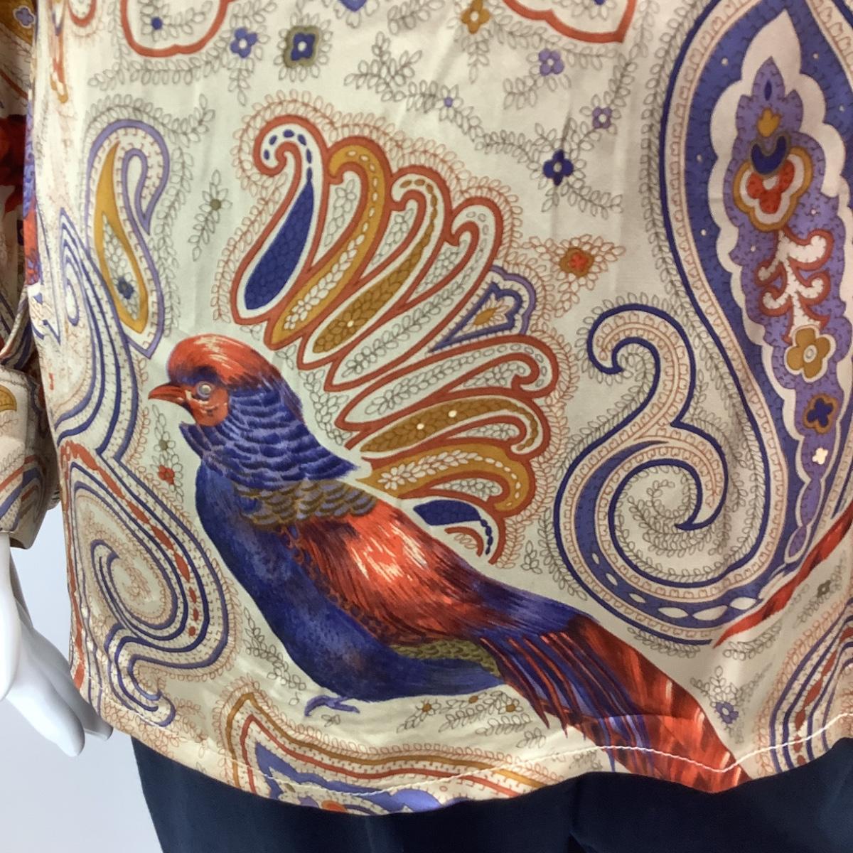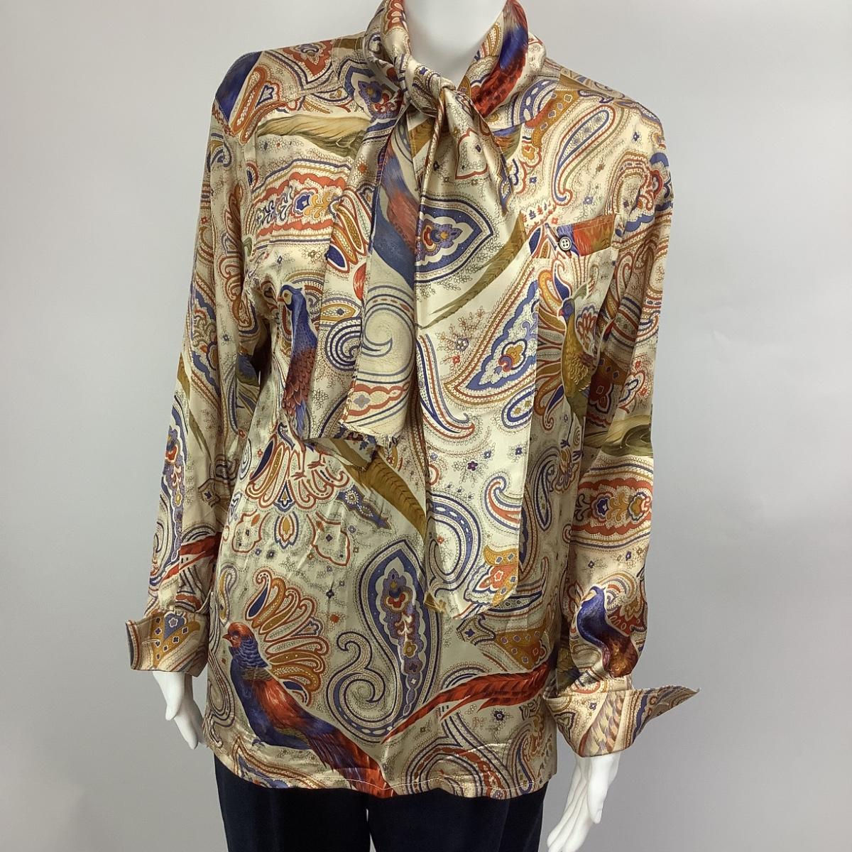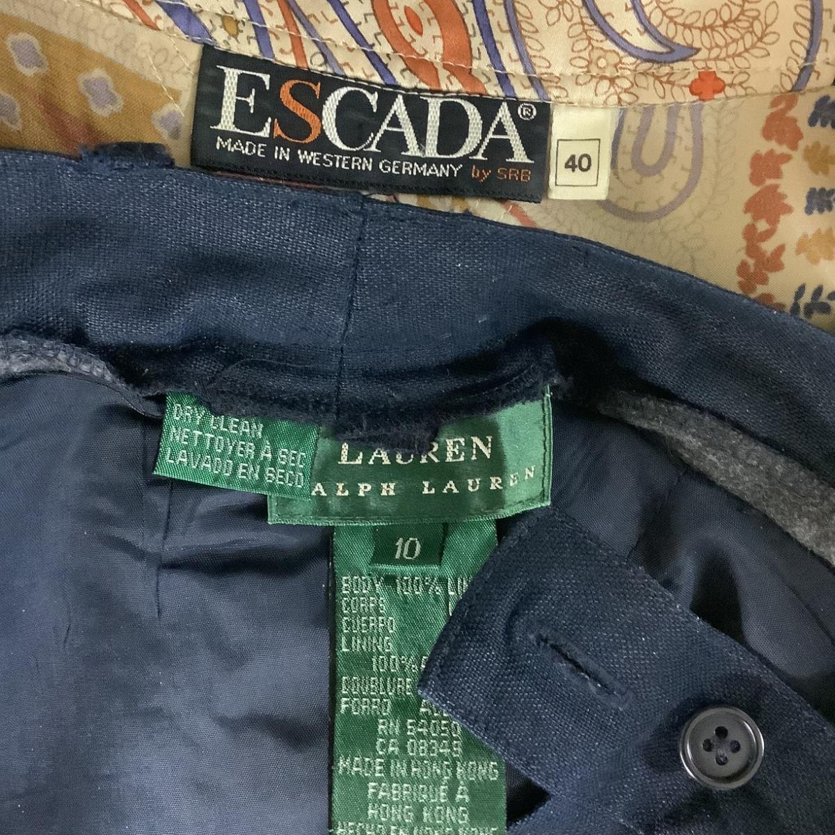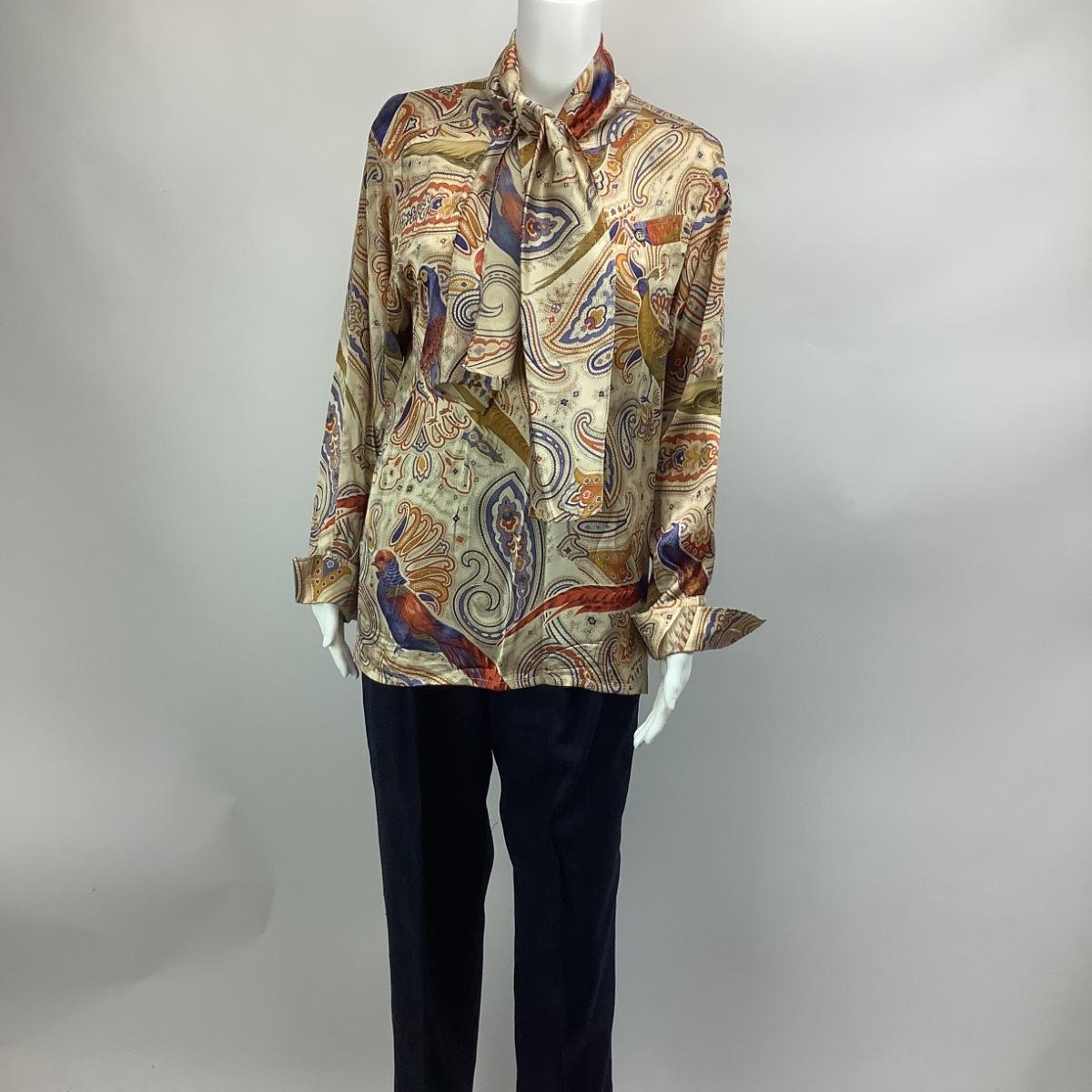 The blouse is size 40, silk, paisley in gold and blue with bow on the collar. The shirt measures 18" from armpit to armpit and overall length is 26". Ralph Lauren slacks size 10 and 100% linen. The pants measure 15" from hip to hip when flat and 40" in length.