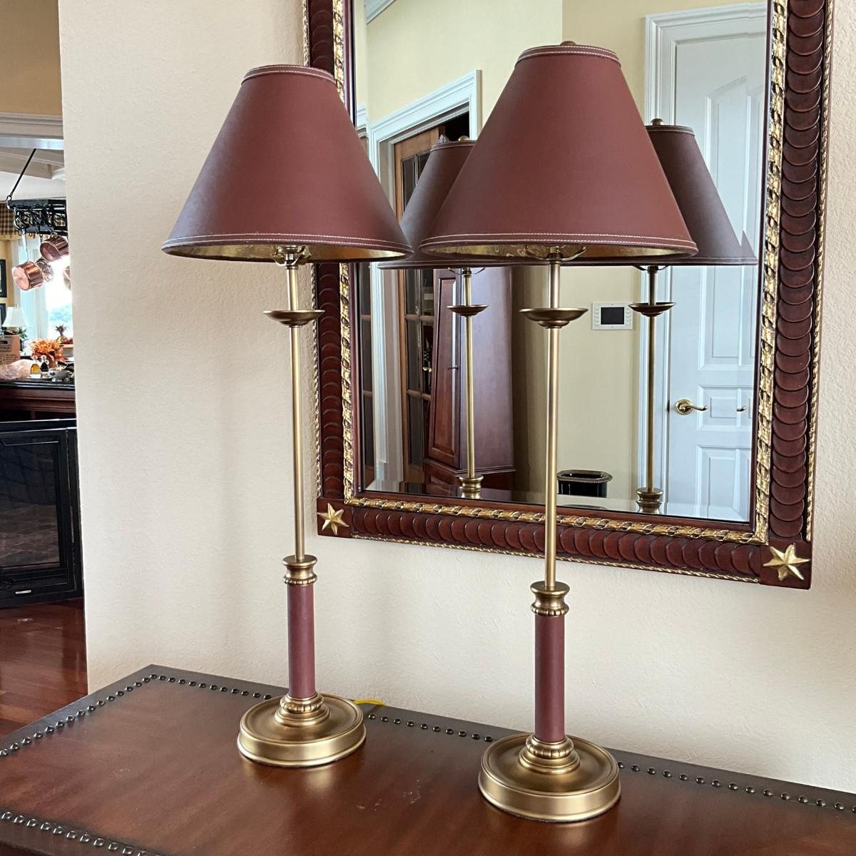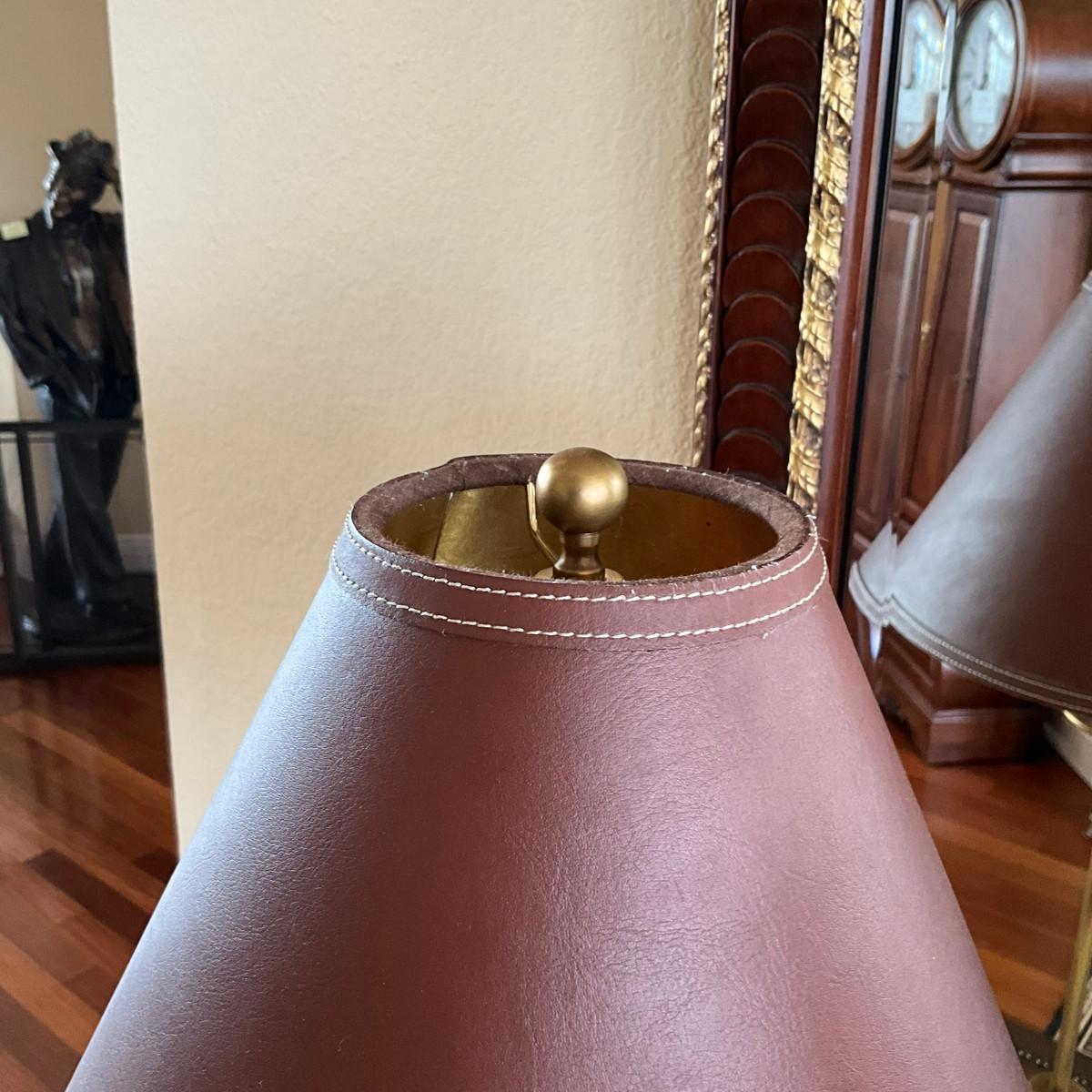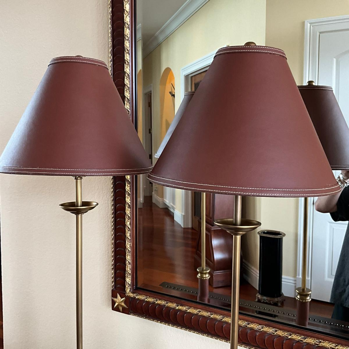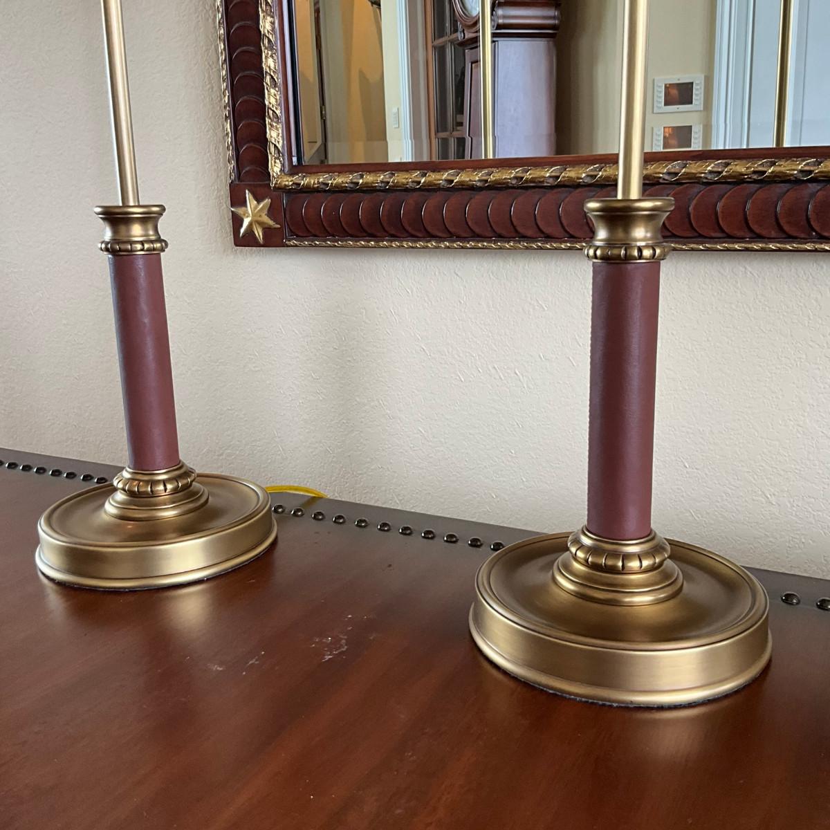 712 Pair of Brown Leather Brass Candlestick Lamps