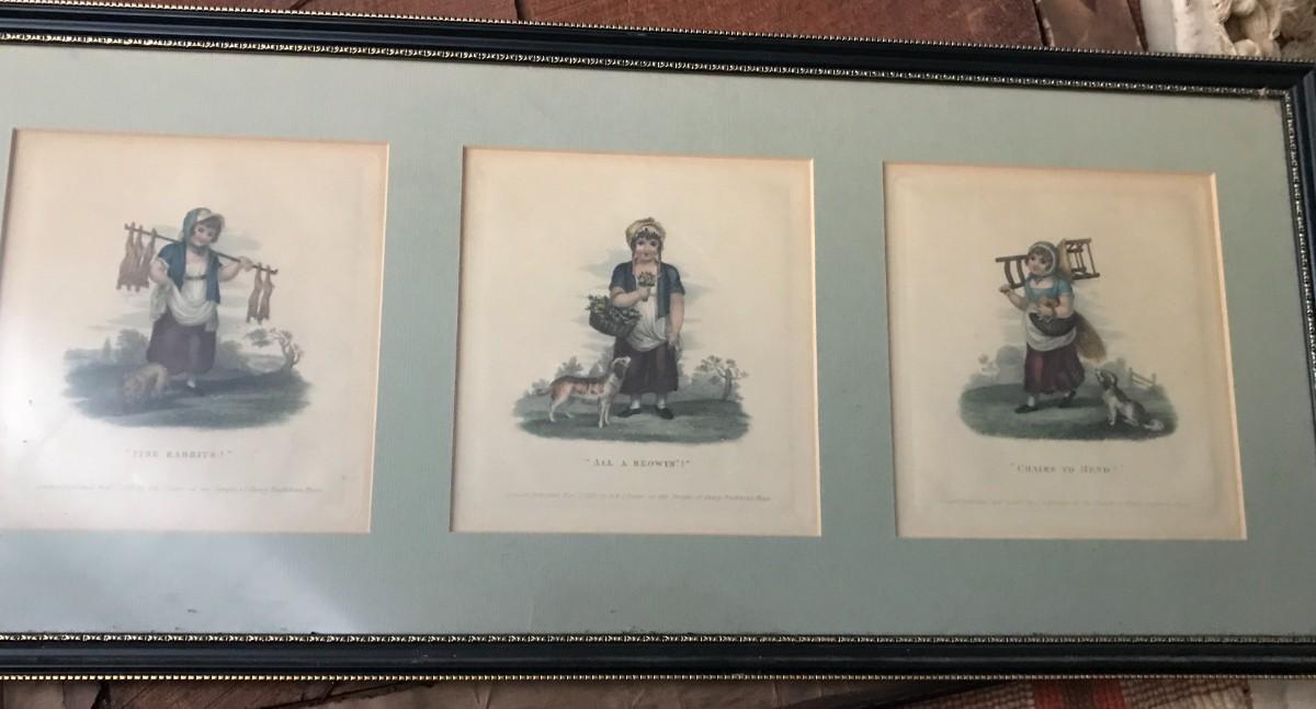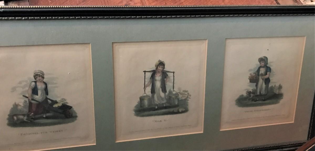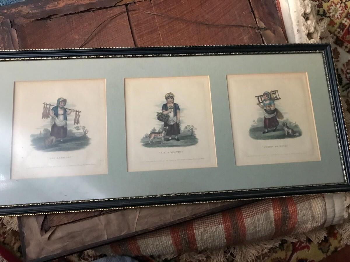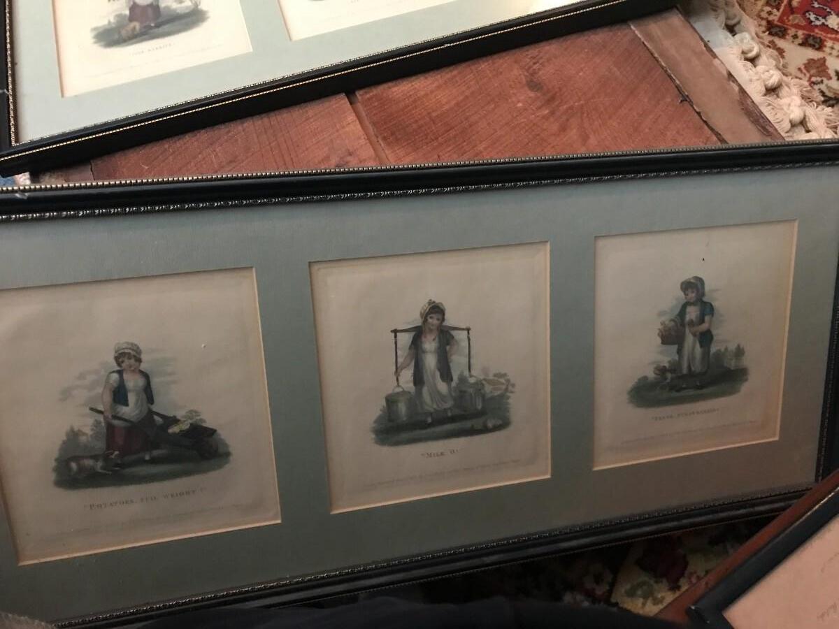 23.5 " wide x 12 " tall framed . pair of triptychs . Antique 19th century hand colored engravings .