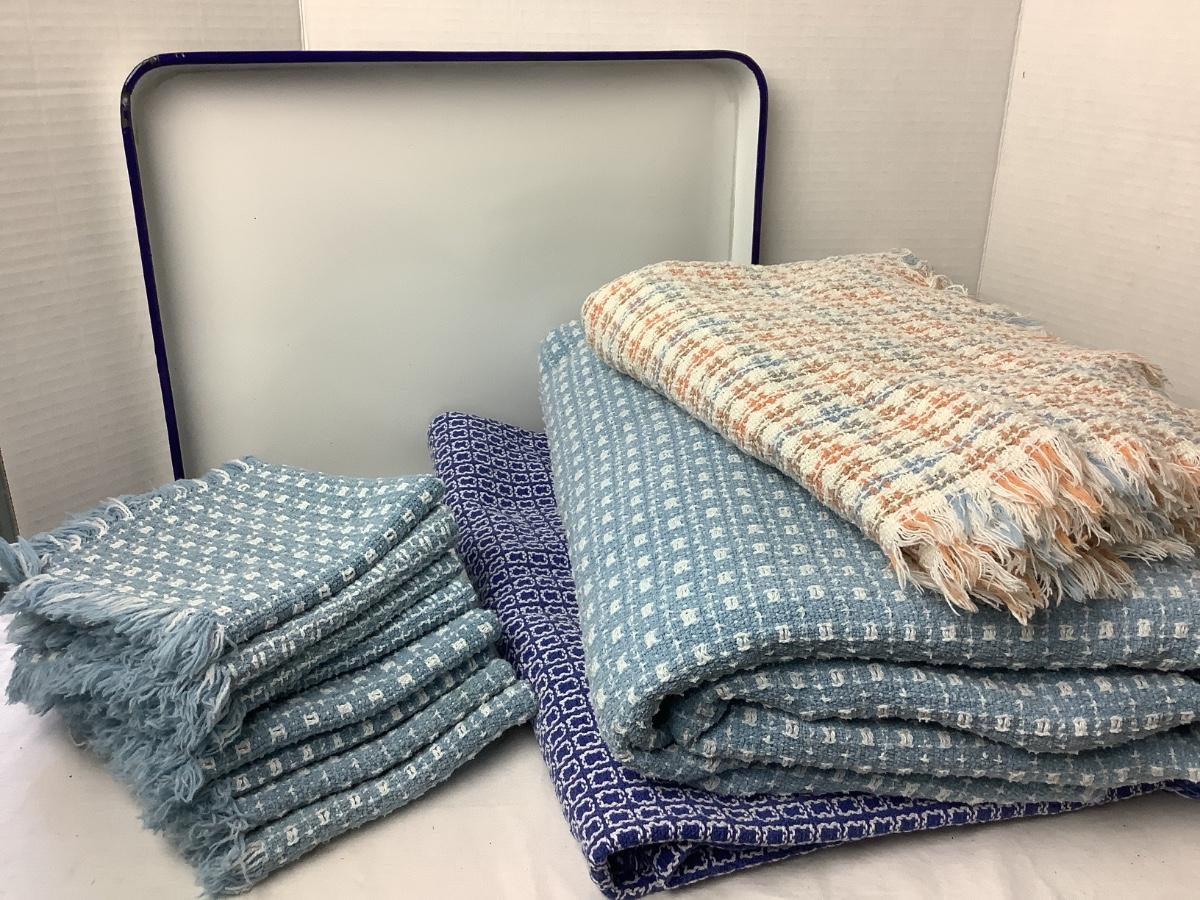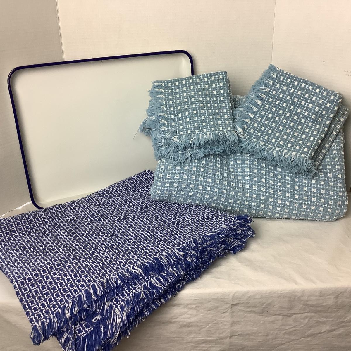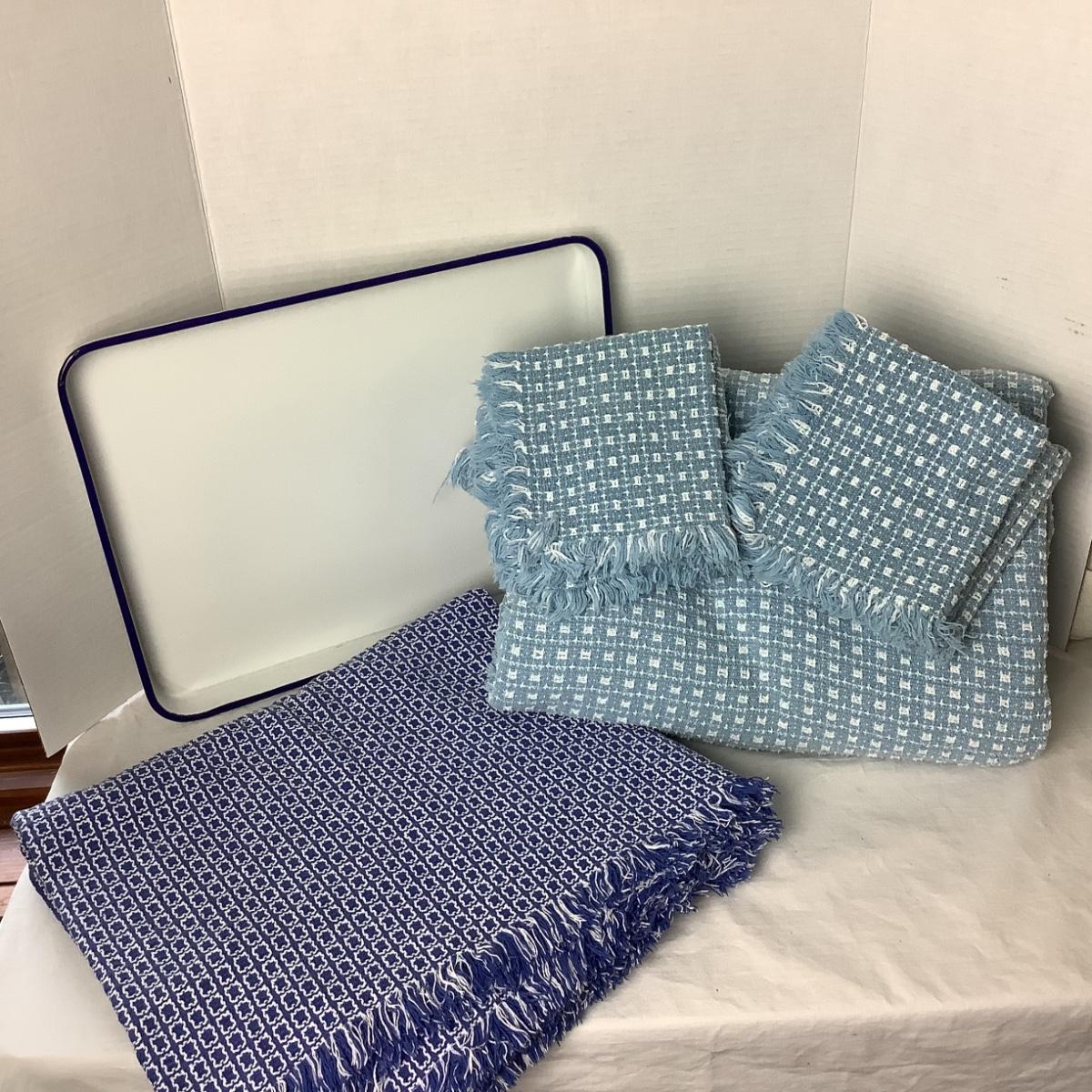 713 Lot of Blue and White Table Linens with Blue and White Enamel Tray
