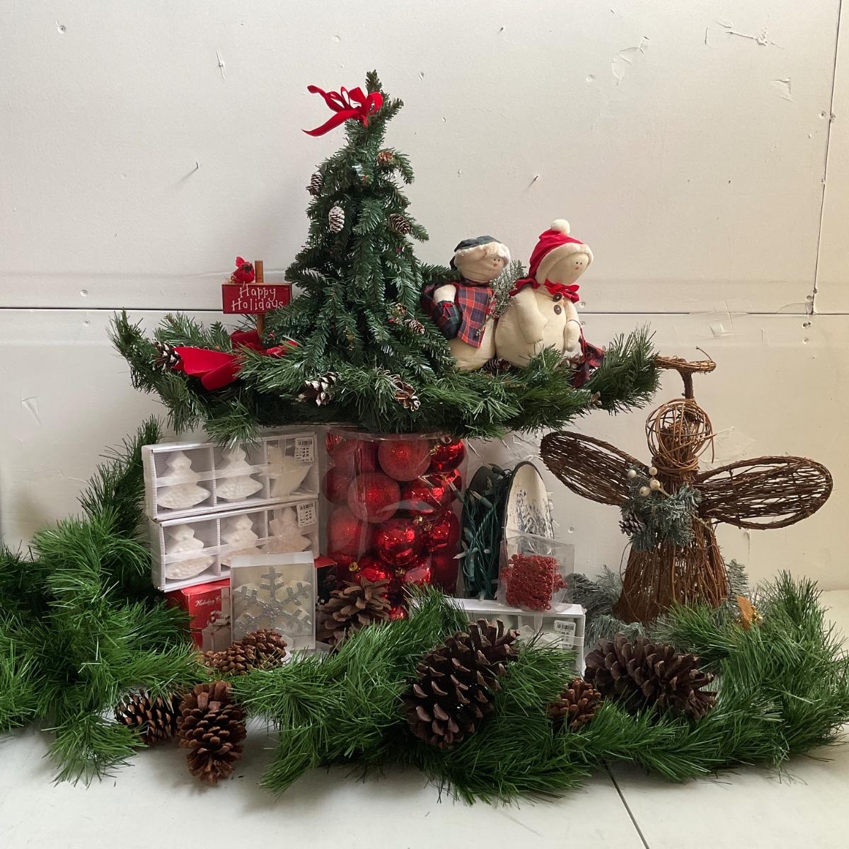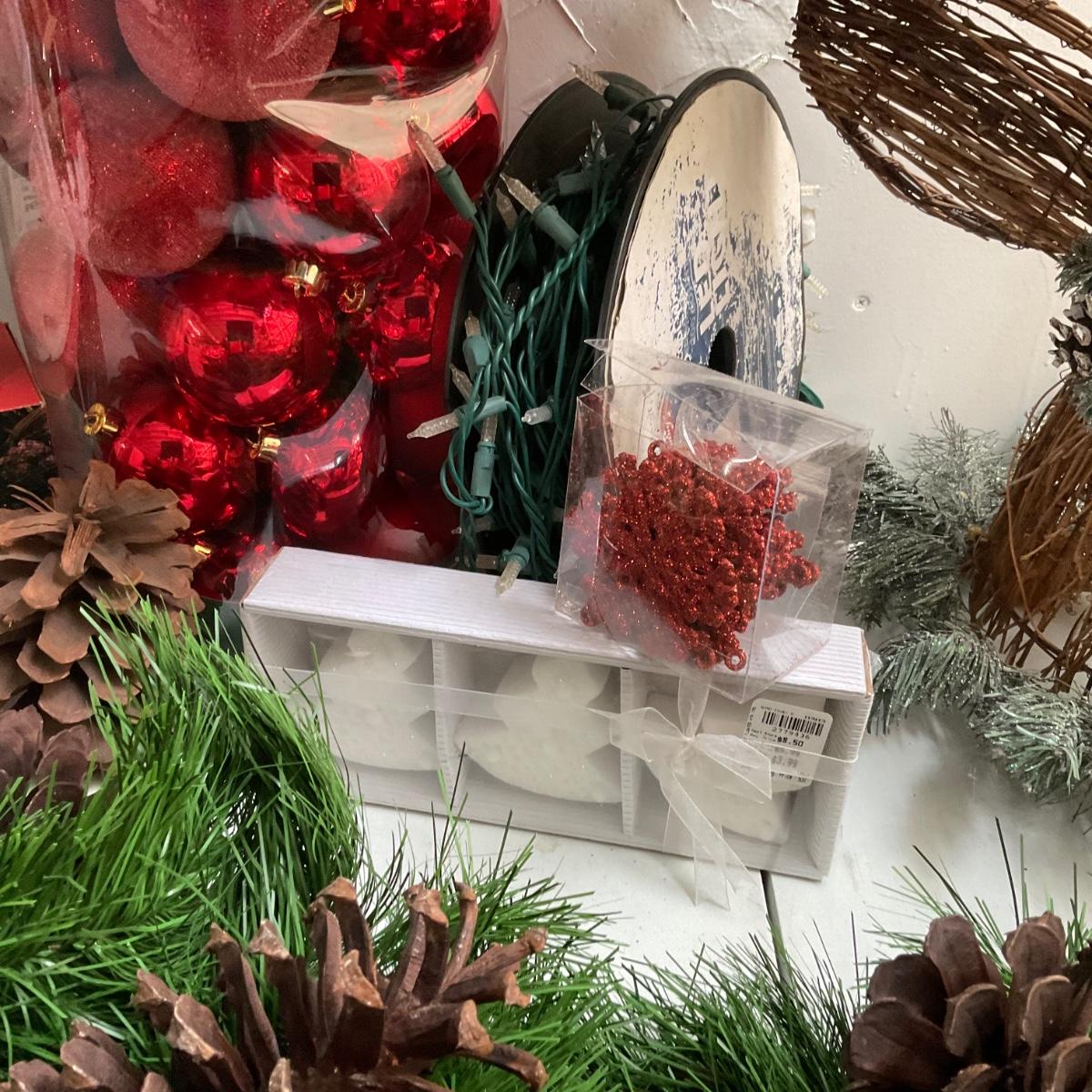 pinecone garland with candles, lights, plastic ball ornaments, and more