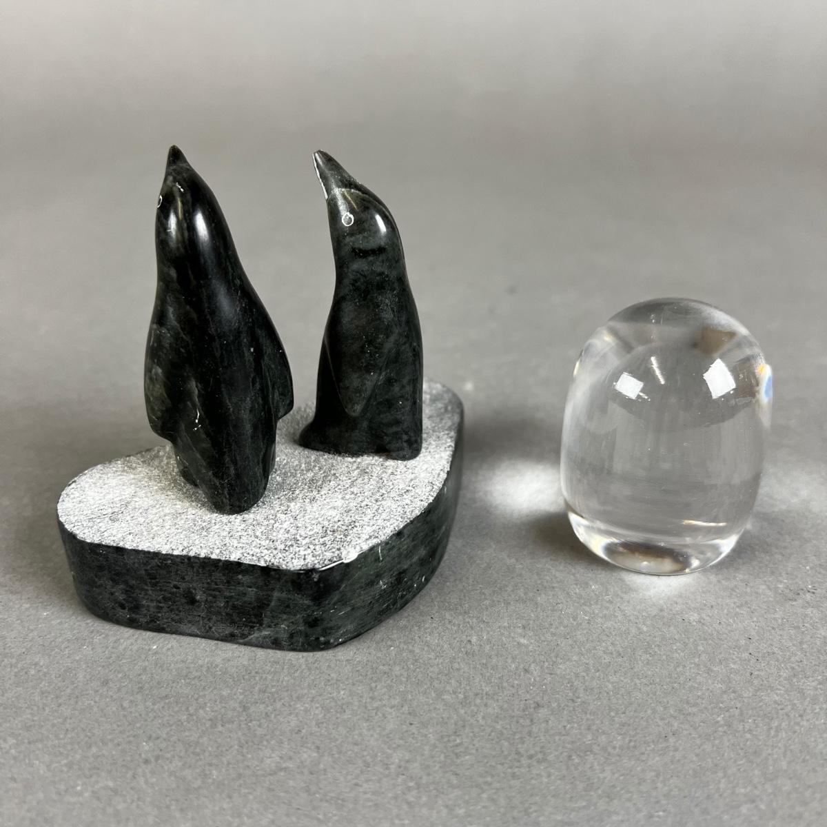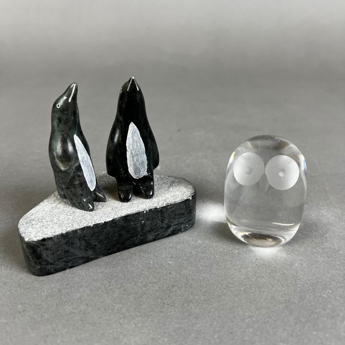 715 Signed Carved Soapstone Penguins & Glass Owl Paperweight