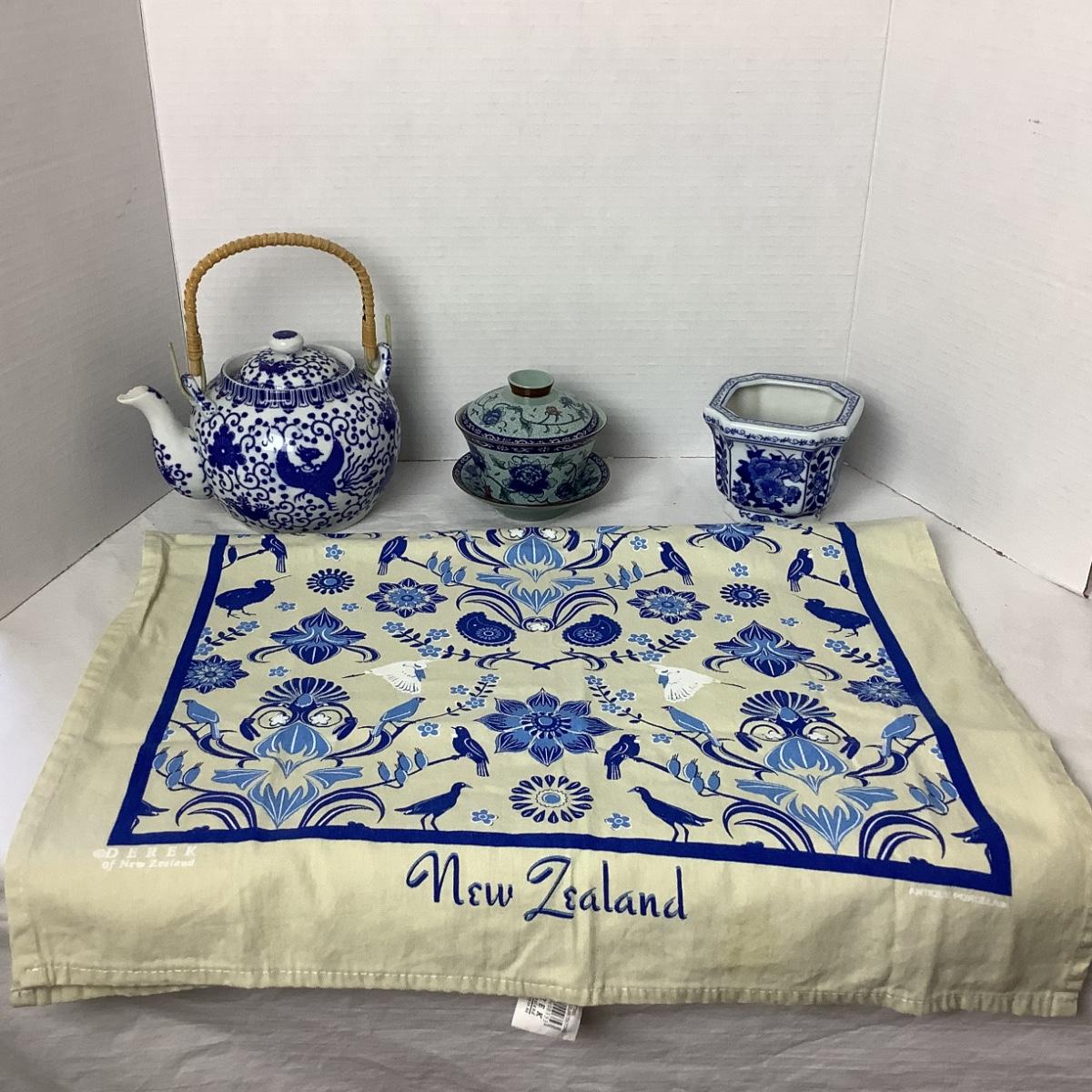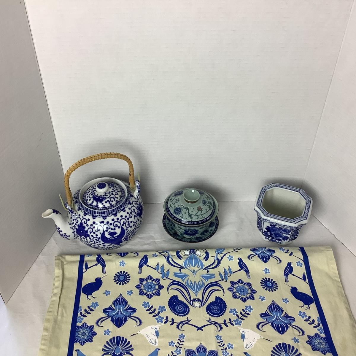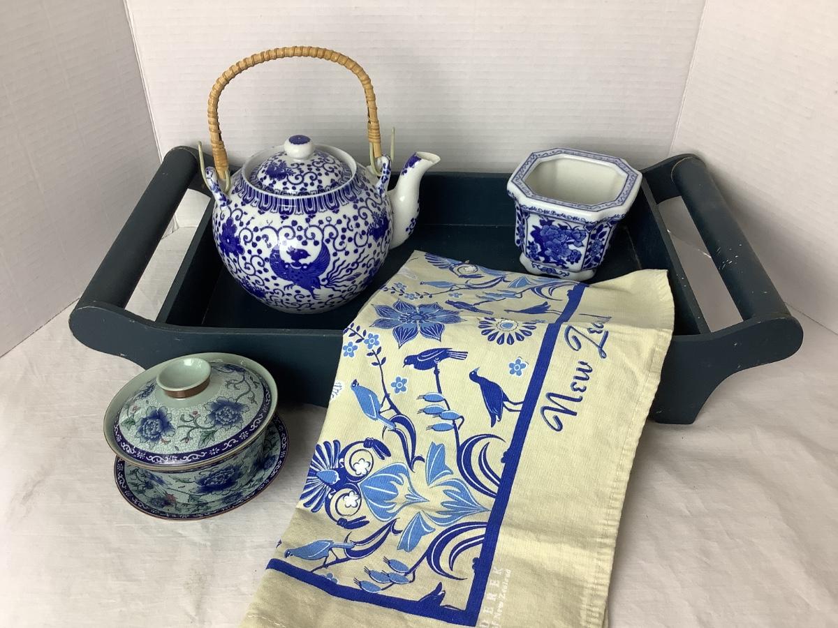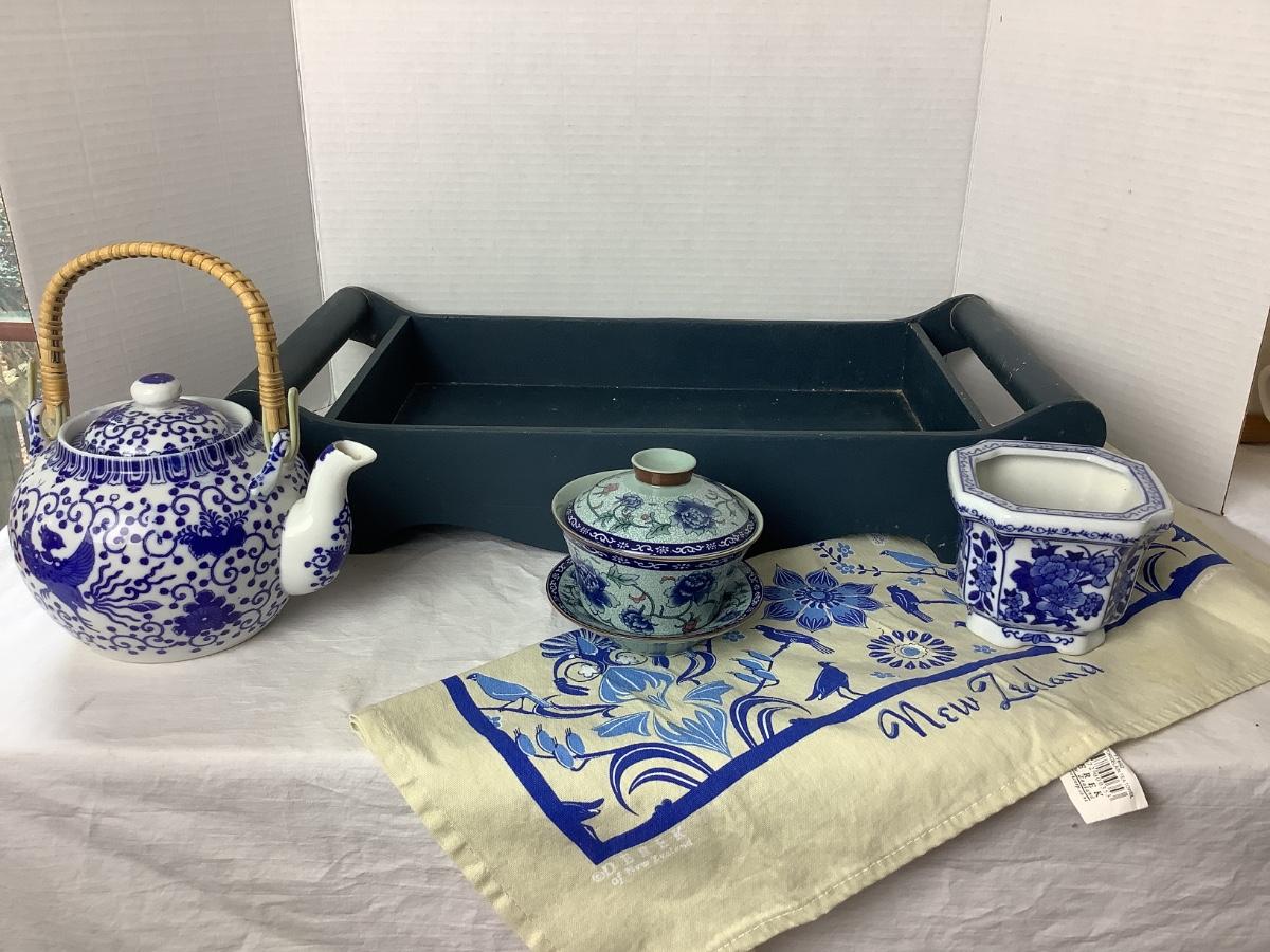 717 Asian Inspired Blue and White Tea Set with Tea Towel , and planter and Blue Wooden Tray