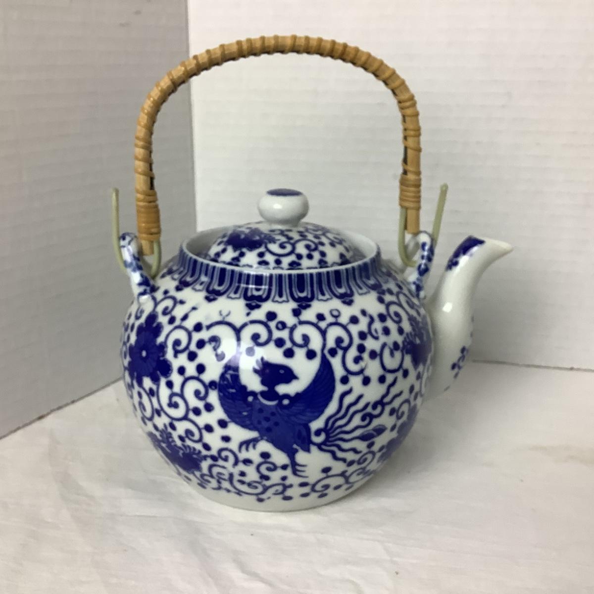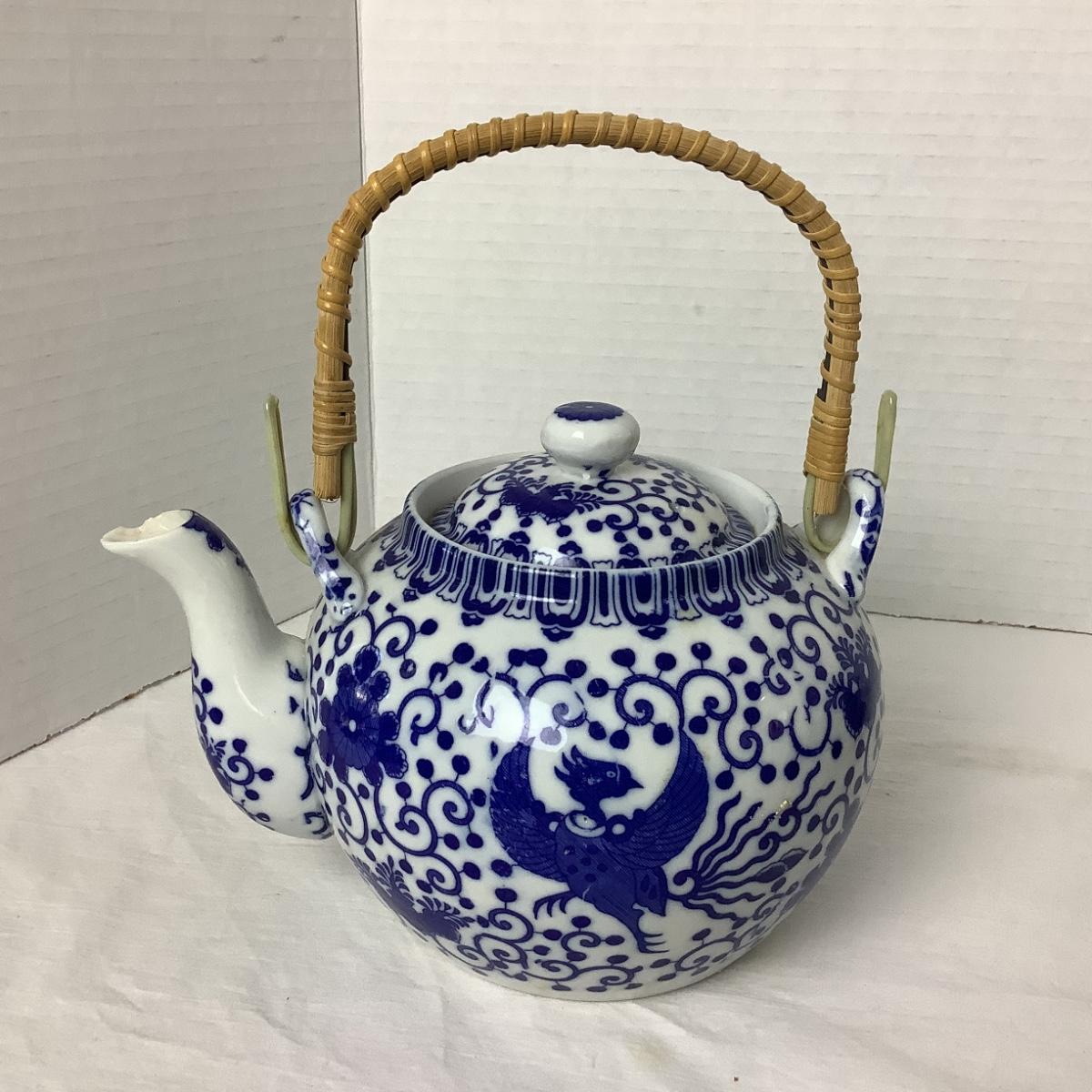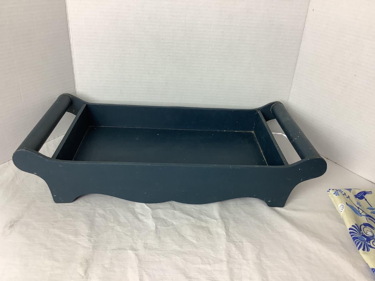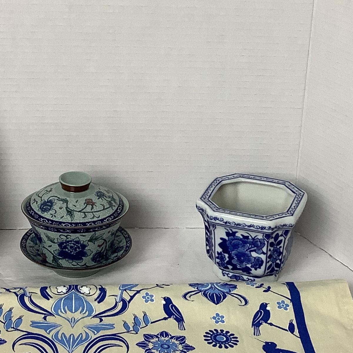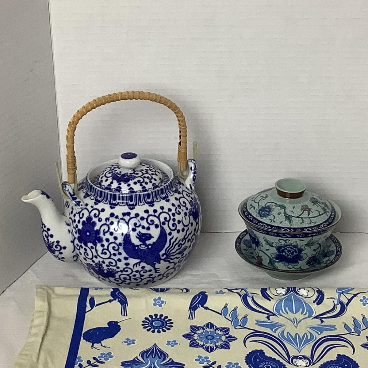 717 Asian Inspired Blue and White Tea Set with Tea Towel , and planter and Blue Wooden Tray