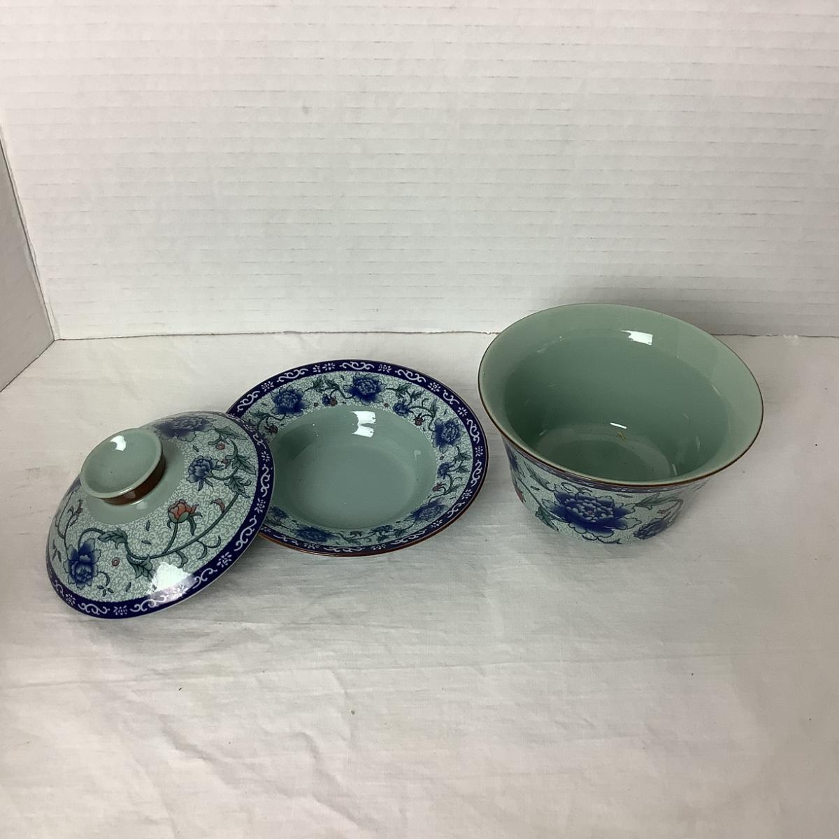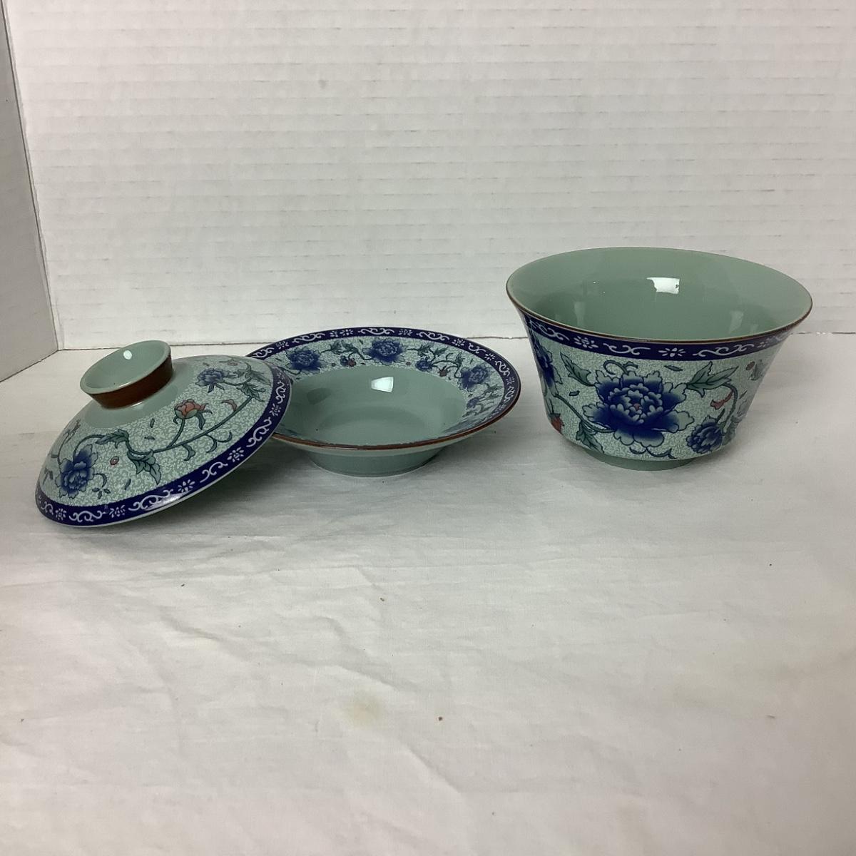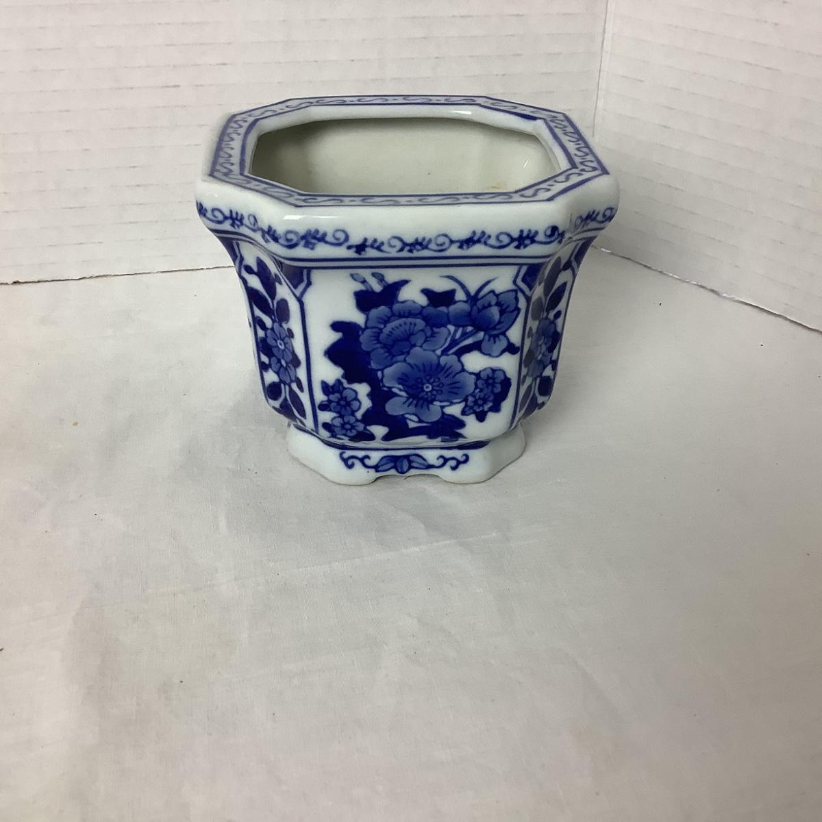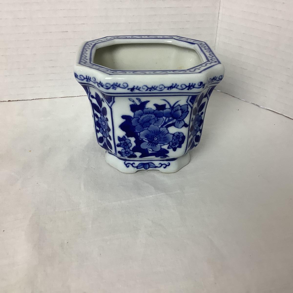 717 Asian Inspired Blue and White Tea Set with Tea Towel , and planter and Blue Wooden Tray