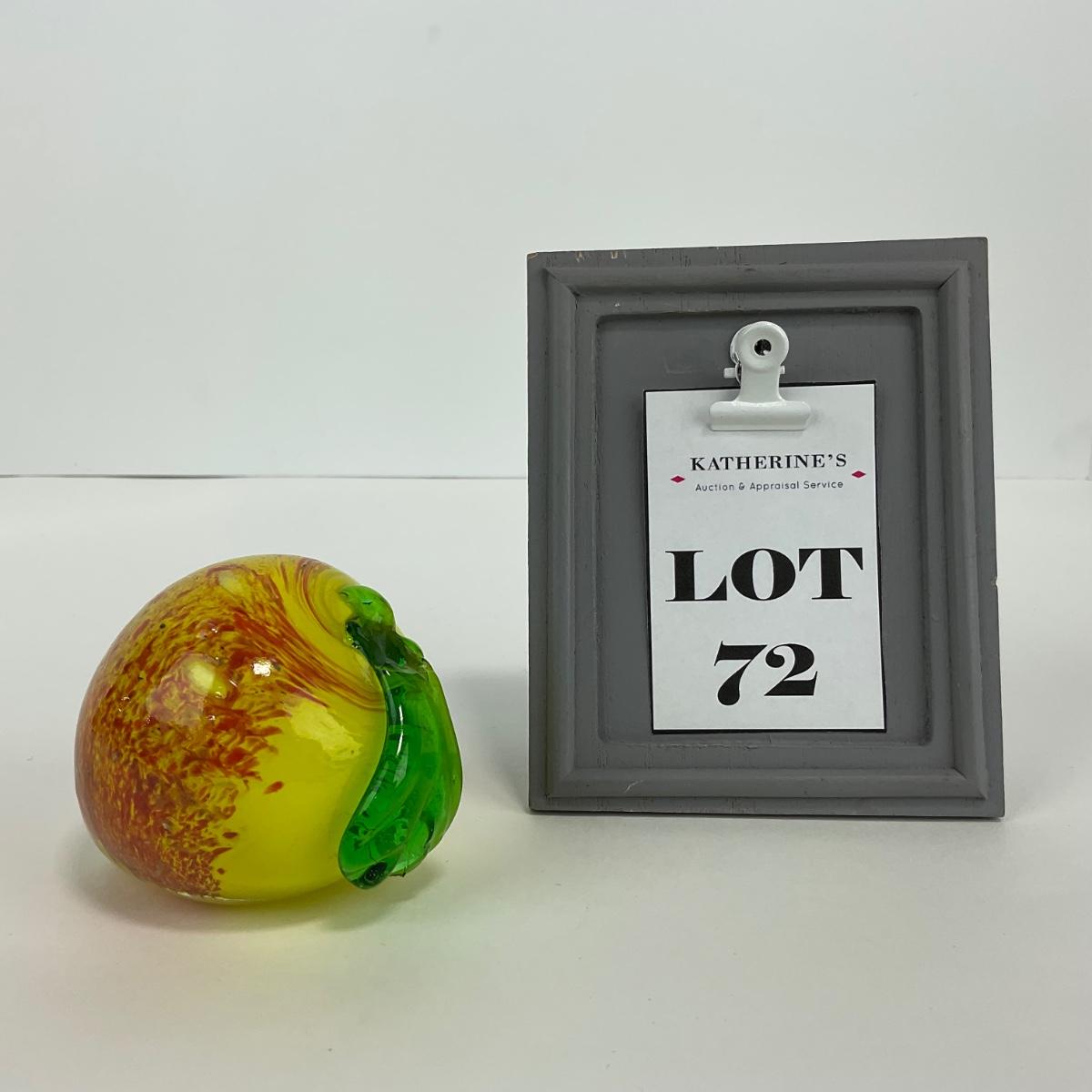 One vintage art glass colorful peach figure. This piece has no damage, and appears to be in great shape with no visable chips, cracks, or broken pieces. Please see photos for details and condition. Any condition statement is given as a courtesy to a client, is an opinion, and should not be treated as a statement of fact. Reference to condition written, oral or within a condition report shall not be regarded as a full account of condition and may not include all defects, alterations, or restorations. Absence of a condition report does not imply a lot is flawless or lacking imperfections or damage. Katherine’s Auction & Appraisal Service shall have no responsibility for any error or omission. Returns shall not be accepted on the basis of condition. ::: Shipping is available on this lot. If you require shipping you must let us know at the close of the auction. We will coordinate with you after the item has been won. Shipping fees will include insurance up to or exceeding the value of all items being mailed. If you have any questions regarding this lot please contact the auctioneer either via this website, by direct email or by phone. PICK UP TIMES and other important information can be found in the TERMS and DESCRIPTION of the auction. Please take a look for pertinent information. Thanks!