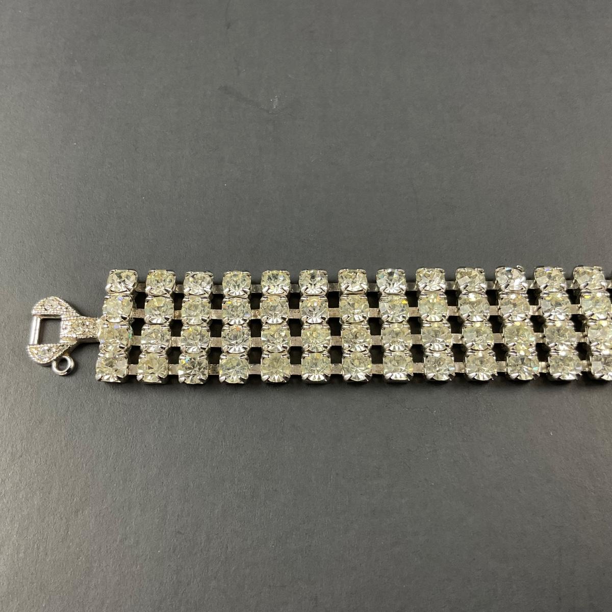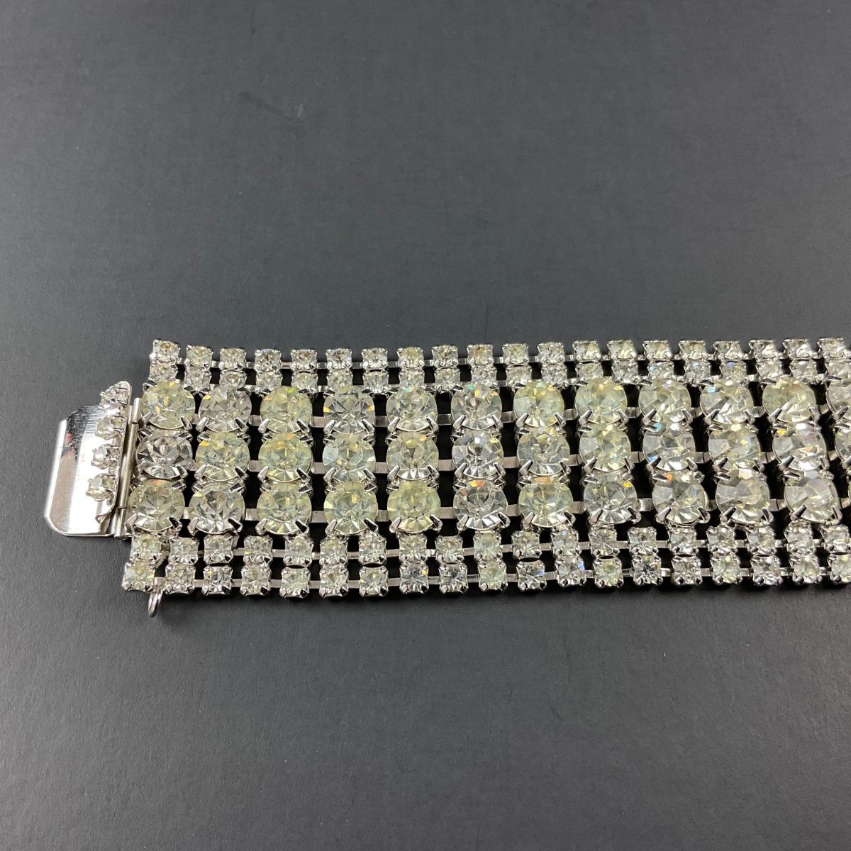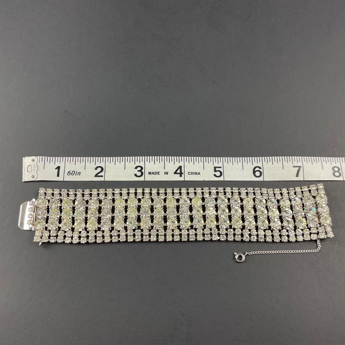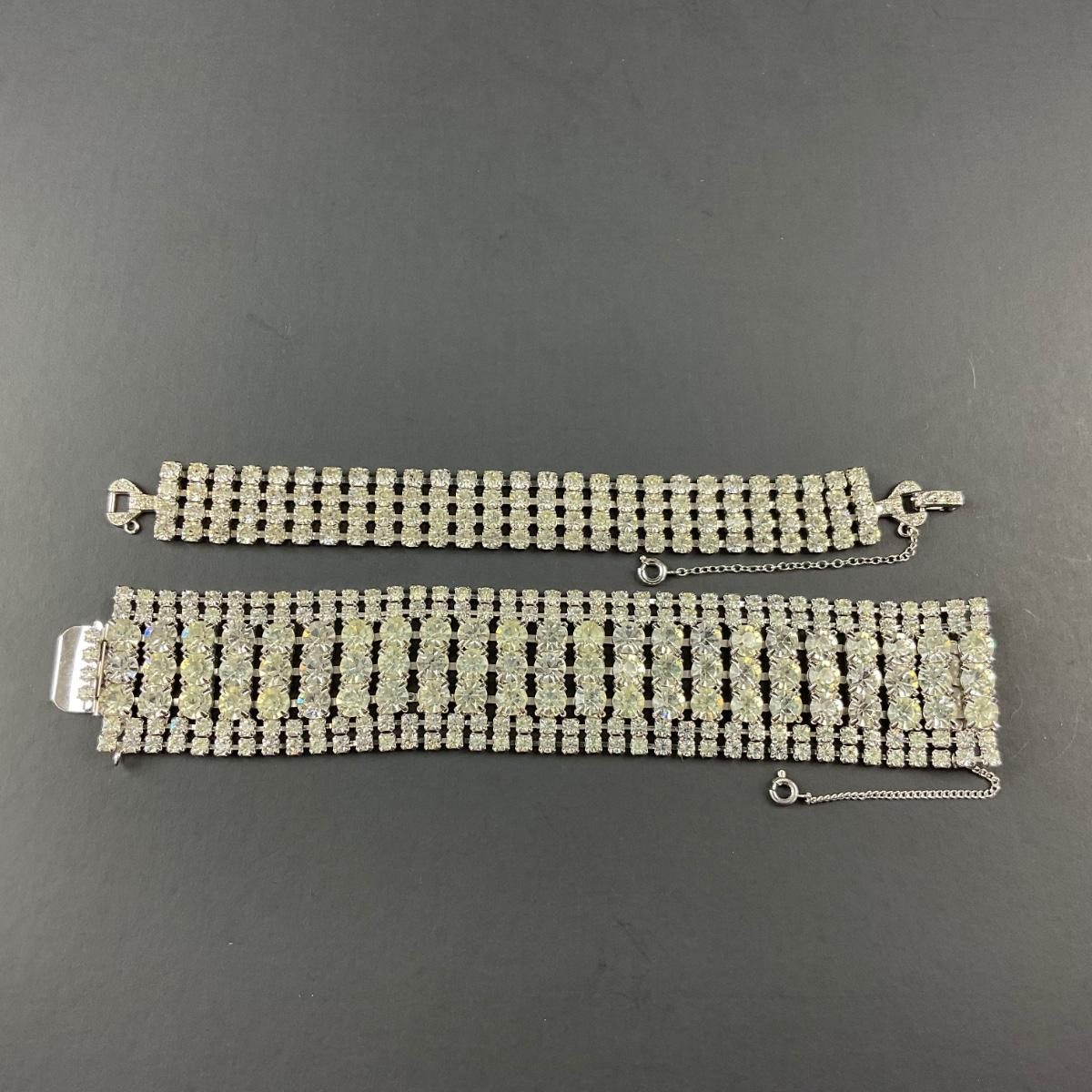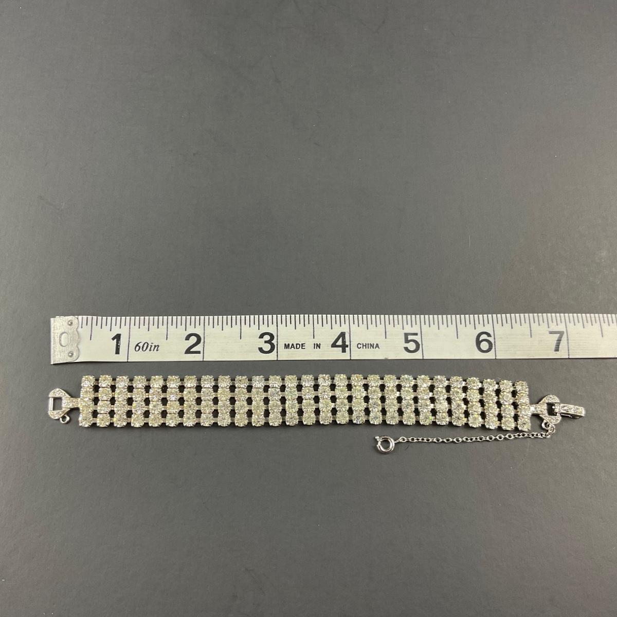 Two vintage unmarked rhinestone bracelets. Please see photos for details and condition. Any condition statement is given as a courtesy to a client, is an opinion, and should not be treated as a statement of fact. Reference to condition written, oral or within a condition report shall not be regarded as a full account of condition and may not include all defects, alterations, or restorations. Absence of a condition report does not imply a lot is flawless or lacking imperfections or damage. Katherine’s Auction & Appraisal Service shall have no responsibility for any error or omission. Returns shall not be accepted on the basis of condition. ::: Shipping is available on this lot. If you require shipping you must let us know at the close of the auction. We will coordinate with you after the item has been won. Shipping fees will include insurance up to or exceeding the value of all items being mailed. If you have any questions regarding this lot please contact the auctioneer either via this website, by direct email or by phone. PICK UP TIMES and other important information can be found in the TERMS and DESCRIPTION of the auction. Please take a look for pertinent information. Thanks!