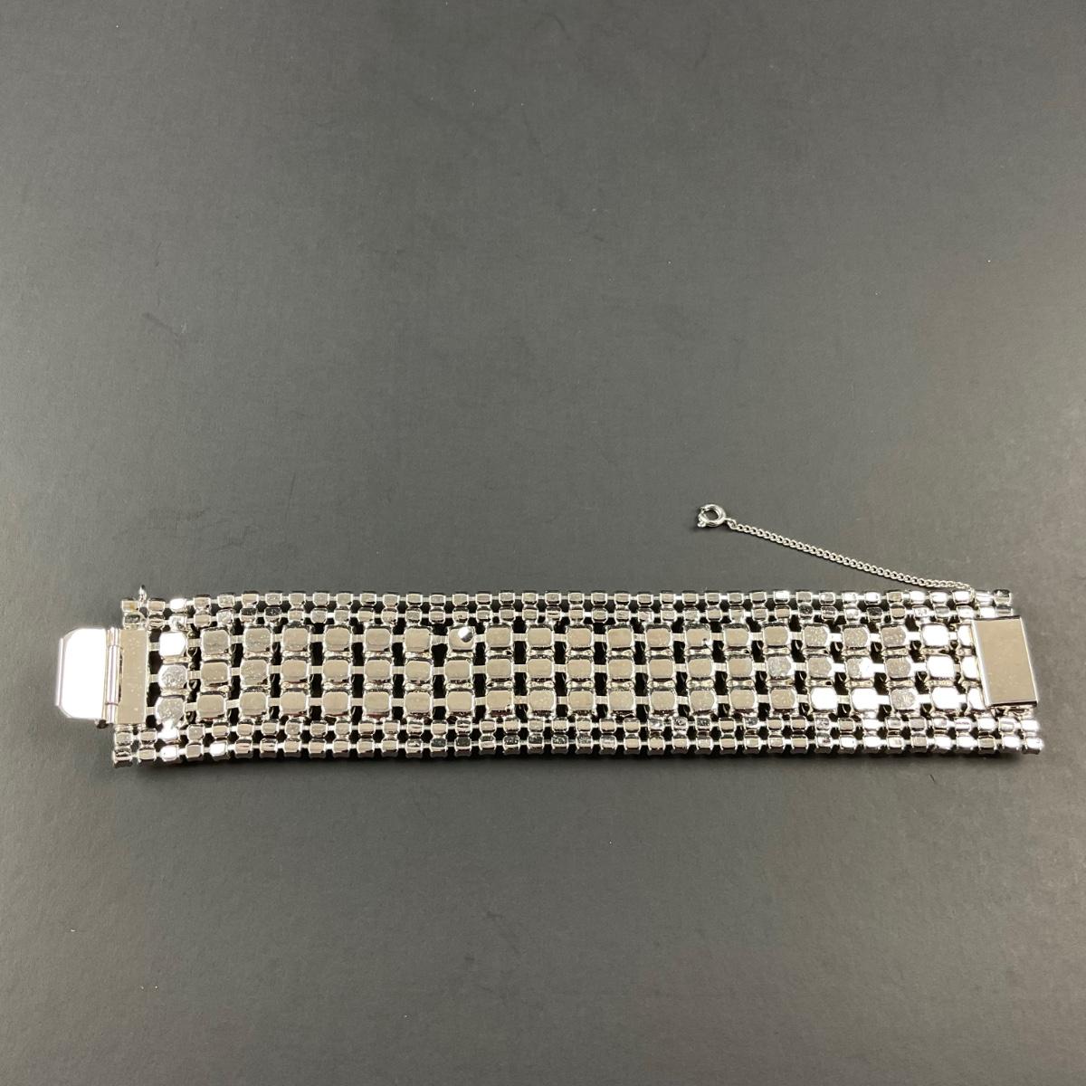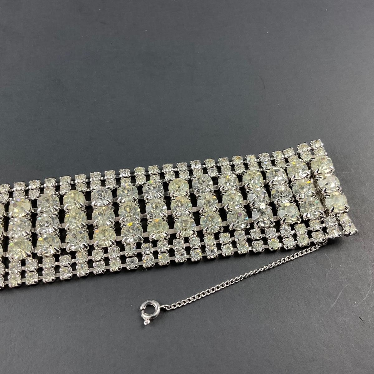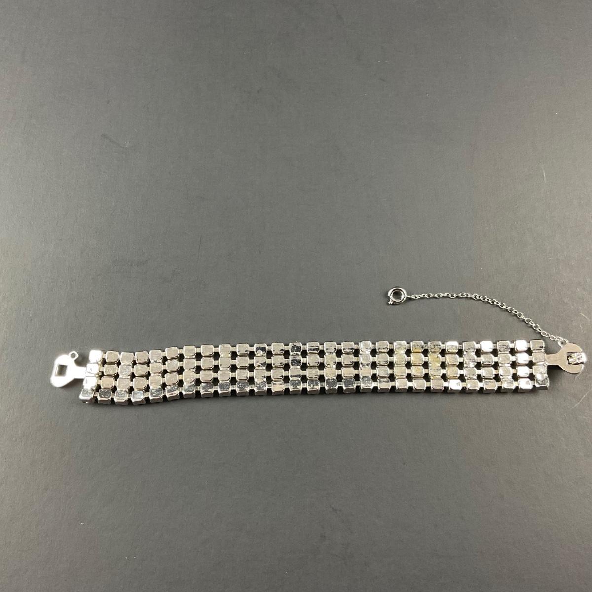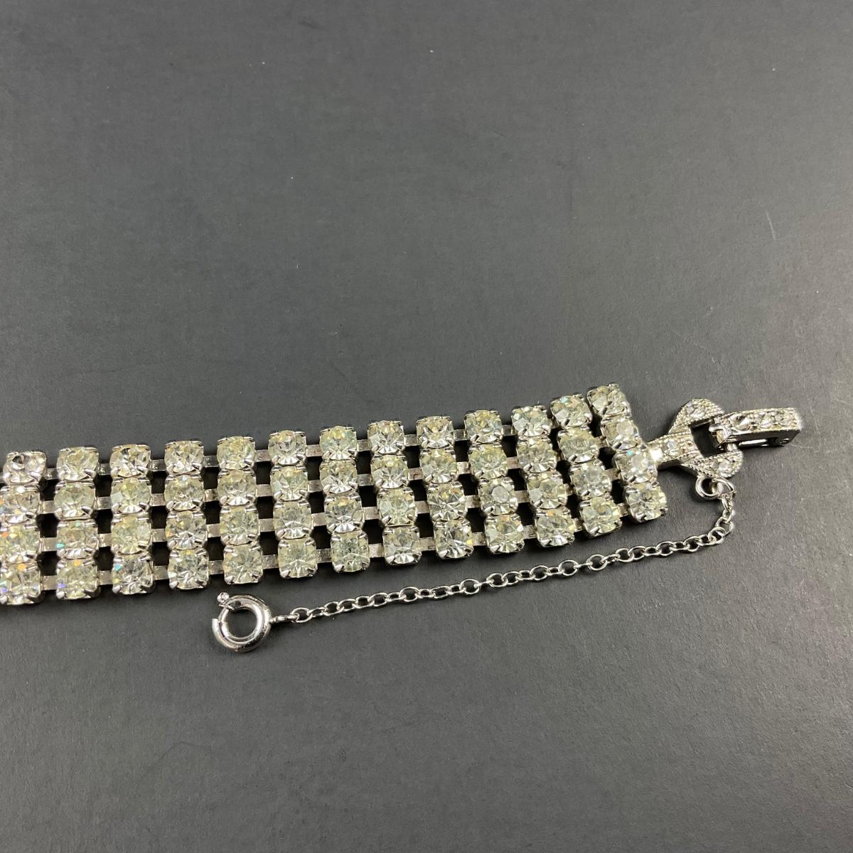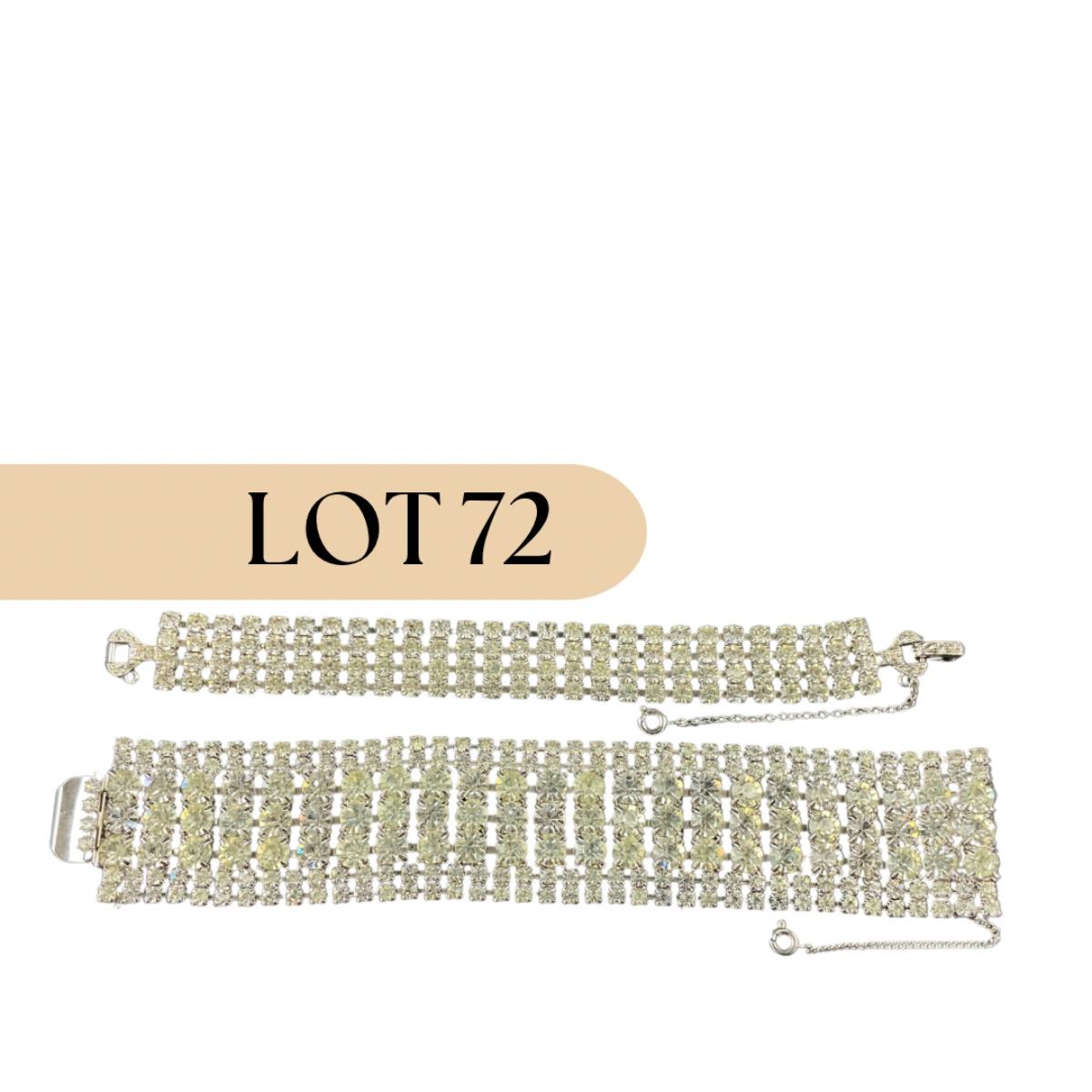Two vintage unmarked rhinestone bracelets. Please see photos for details and condition. Any condition statement is given as a courtesy to a client, is an opinion, and should not be treated as a statement of fact. Reference to condition written, oral or within a condition report shall not be regarded as a full account of condition and may not include all defects, alterations, or restorations. Absence of a condition report does not imply a lot is flawless or lacking imperfections or damage. Katherine’s Auction & Appraisal Service shall have no responsibility for any error or omission. Returns shall not be accepted on the basis of condition. ::: Shipping is available on this lot. If you require shipping you must let us know at the close of the auction. We will coordinate with you after the item has been won. Shipping fees will include insurance up to or exceeding the value of all items being mailed. If you have any questions regarding this lot please contact the auctioneer either via this website, by direct email or by phone. PICK UP TIMES and other important information can be found in the TERMS and DESCRIPTION of the auction. Please take a look for pertinent information. Thanks!