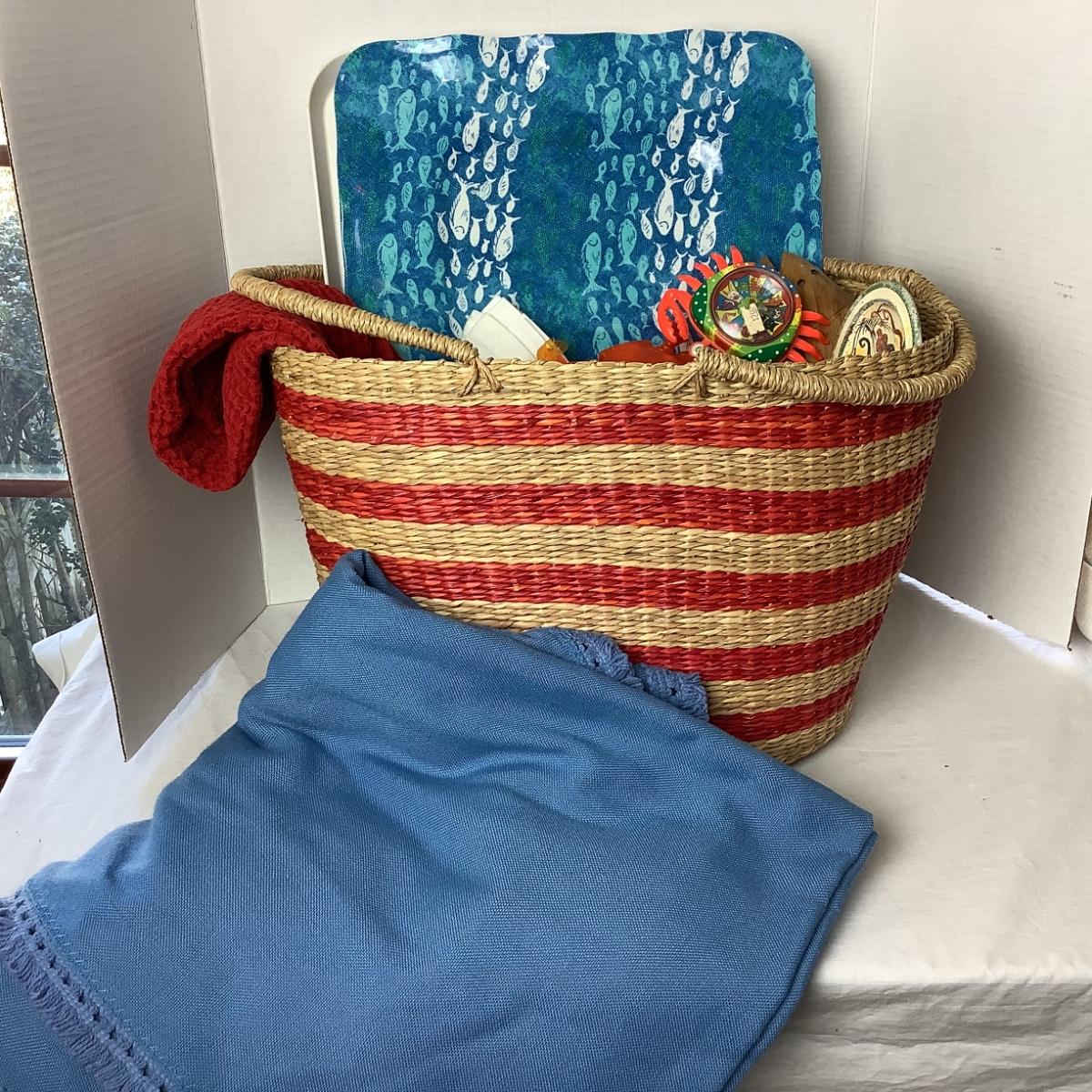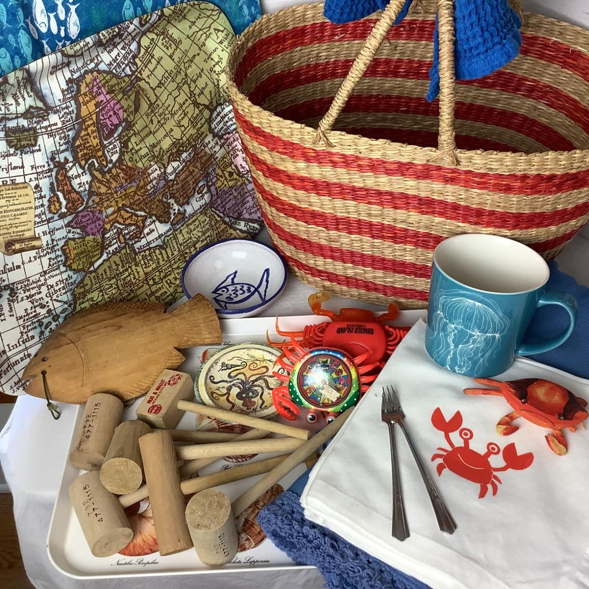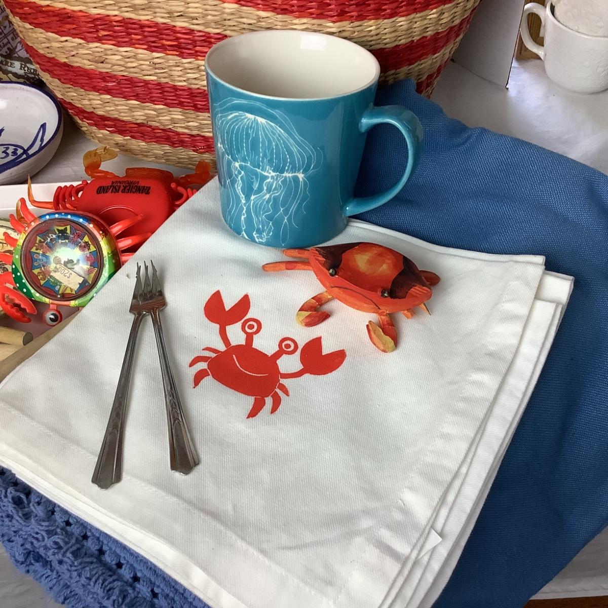 Two nautical serving trays, crab napkins, wooden carved fish, 2 small dishesand mug, crab toys, crab mallots, tea towels, tablecloth, and more