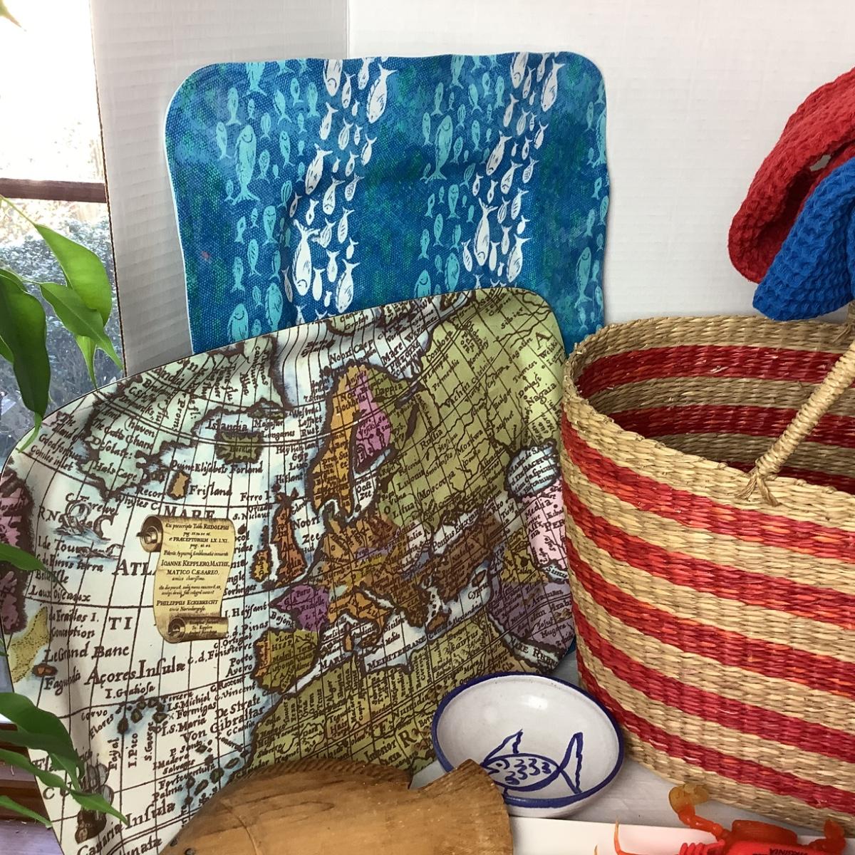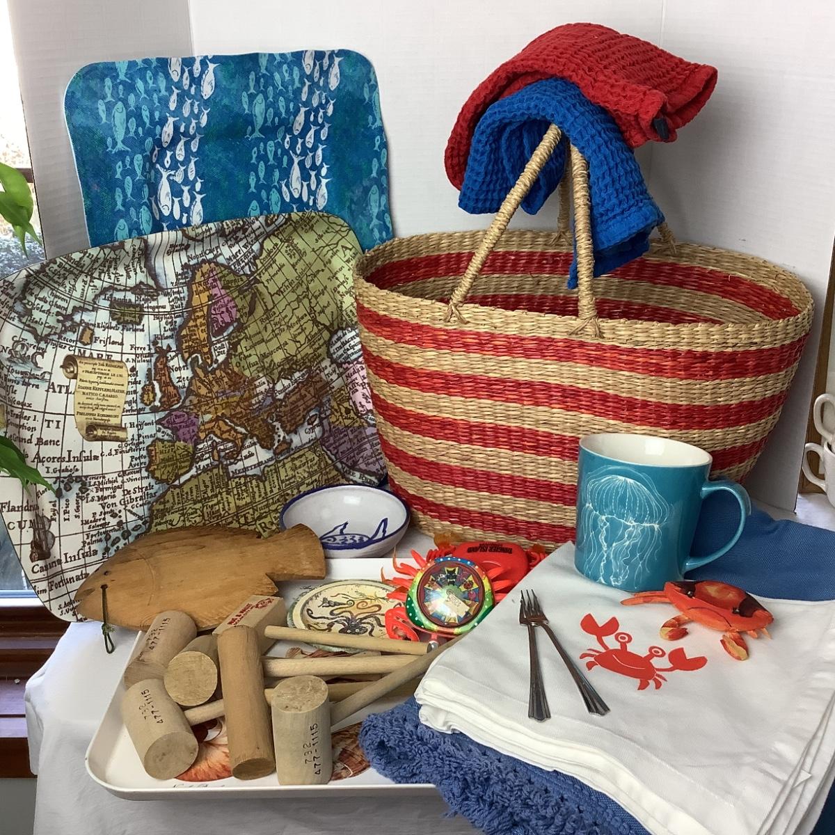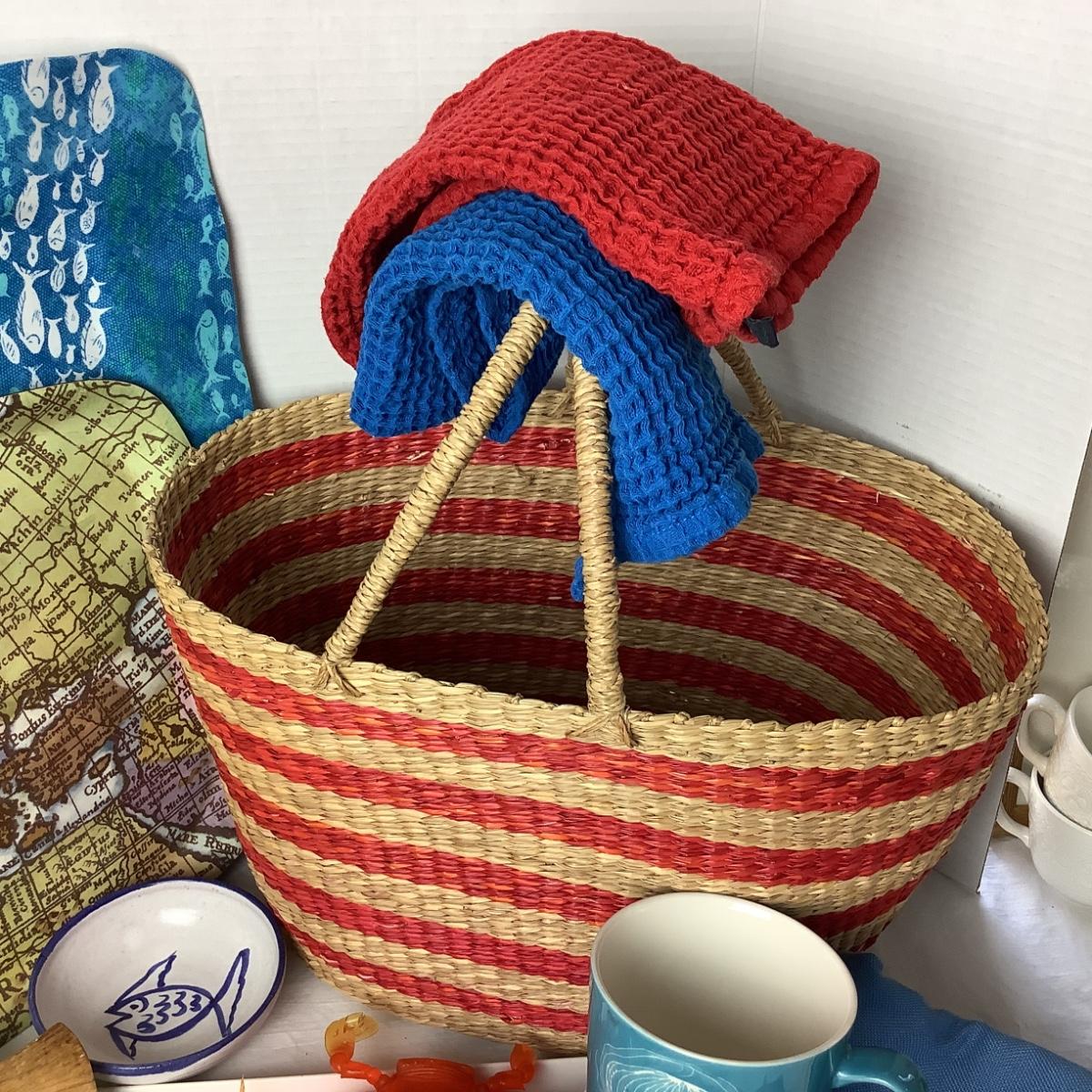 Two nautical serving trays, crab napkins, wooden carved fish, 2 small dishesand mug, crab toys, crab mallots, tea towels, tablecloth, and more