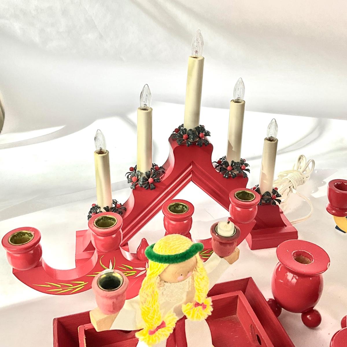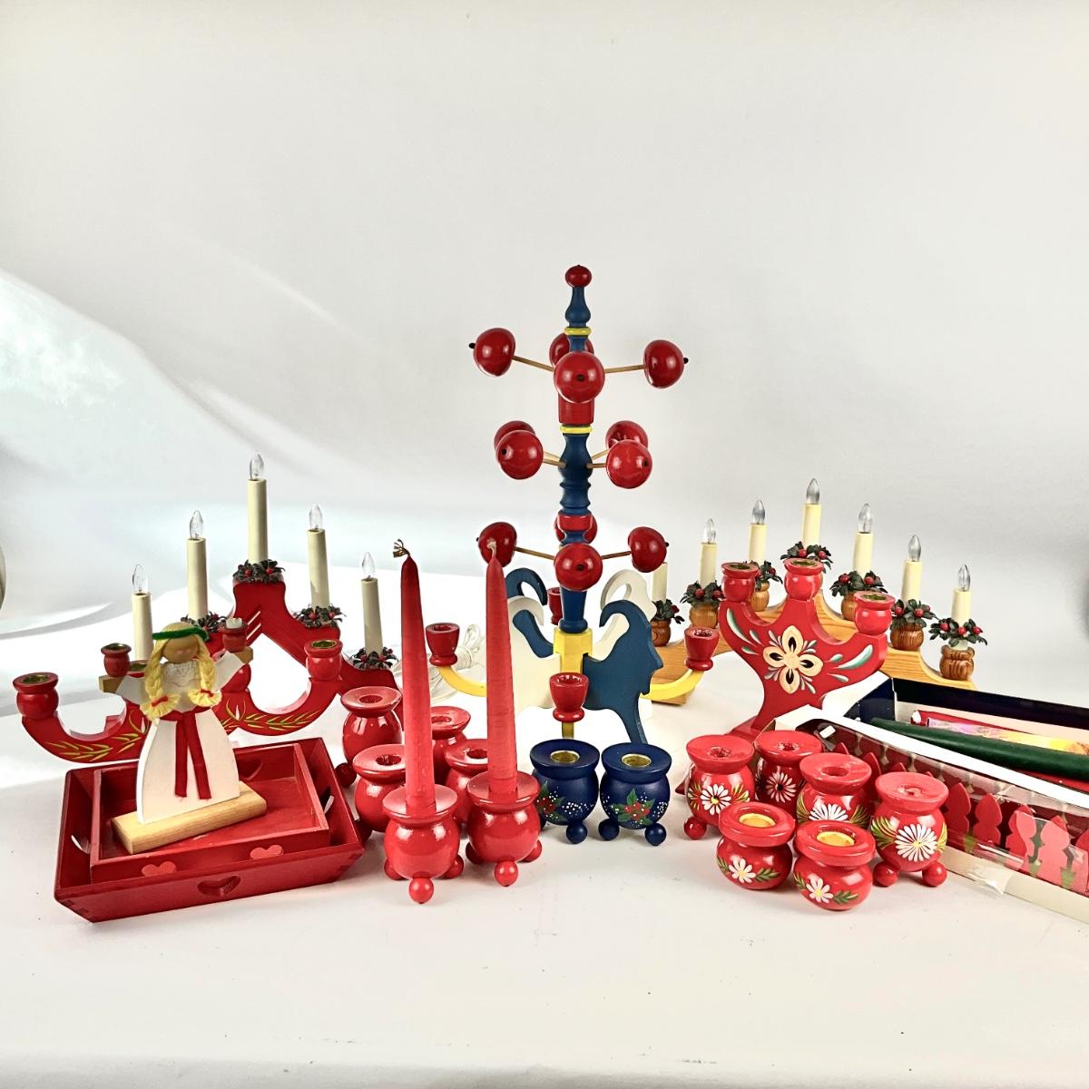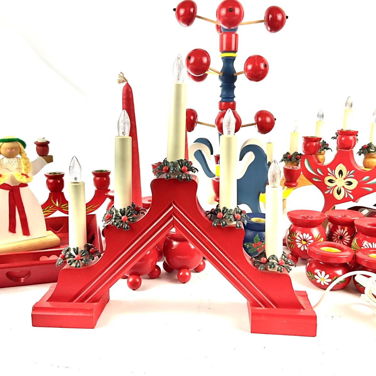 720 Wooden Swedish Christmas Decor Lot With Two Electric Candle Holders