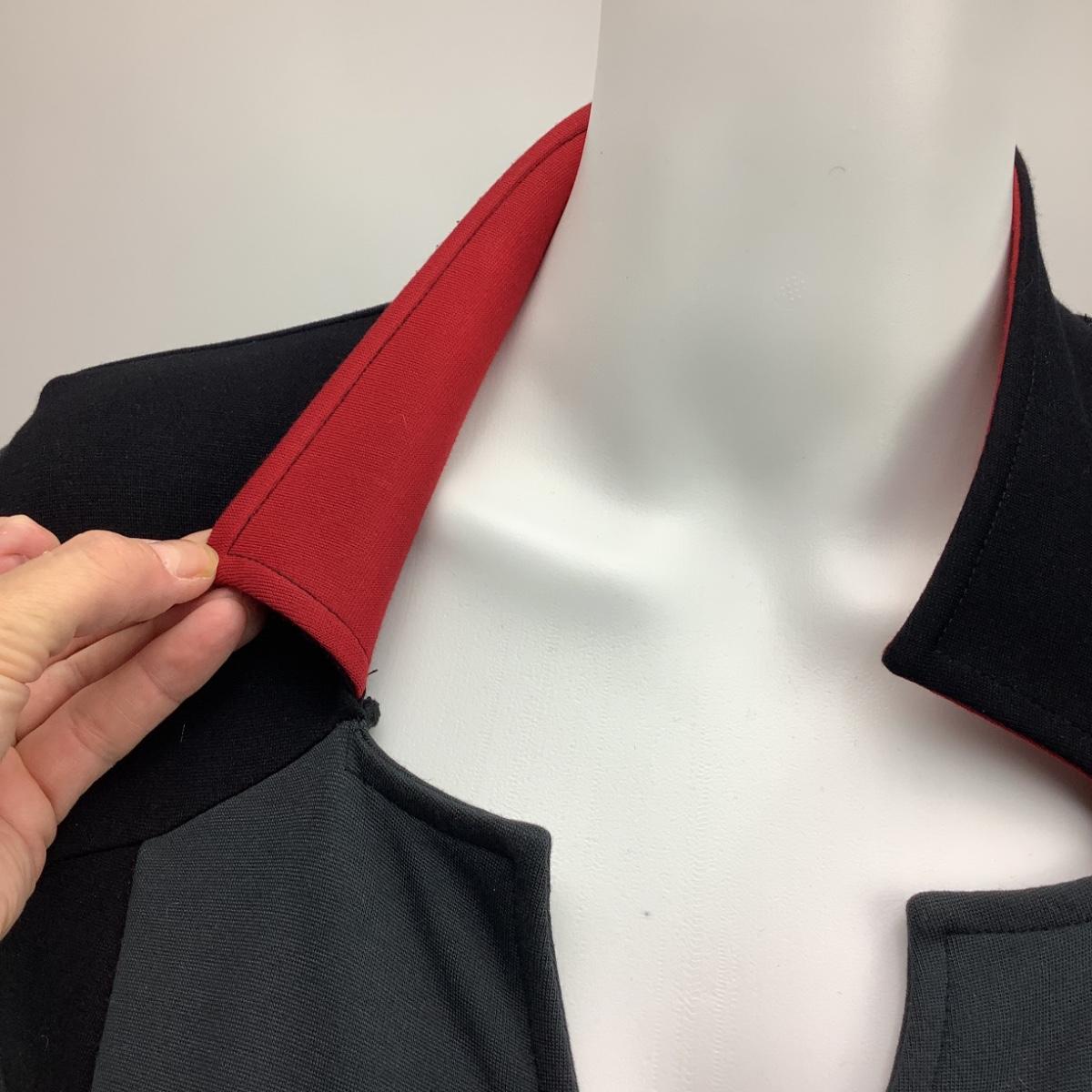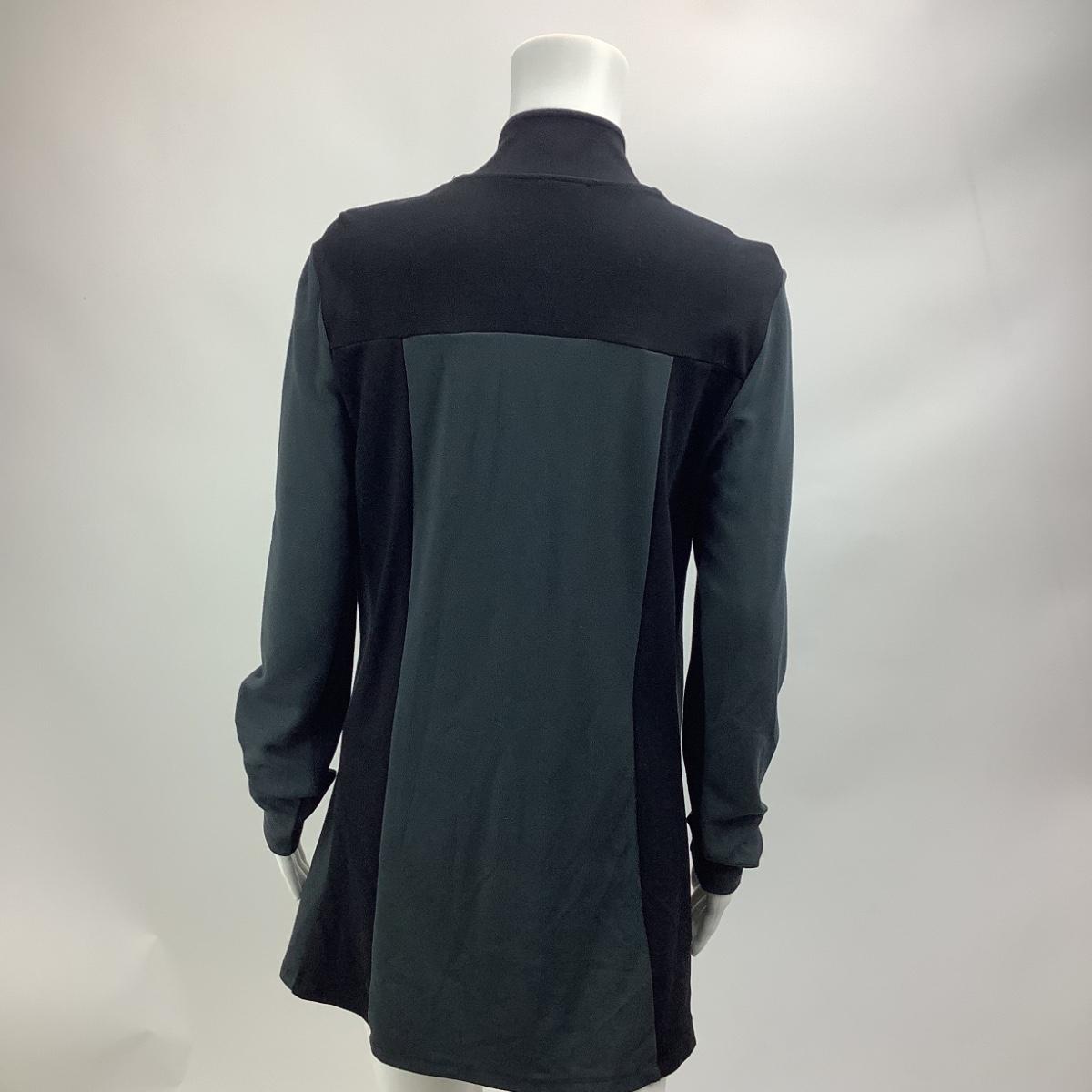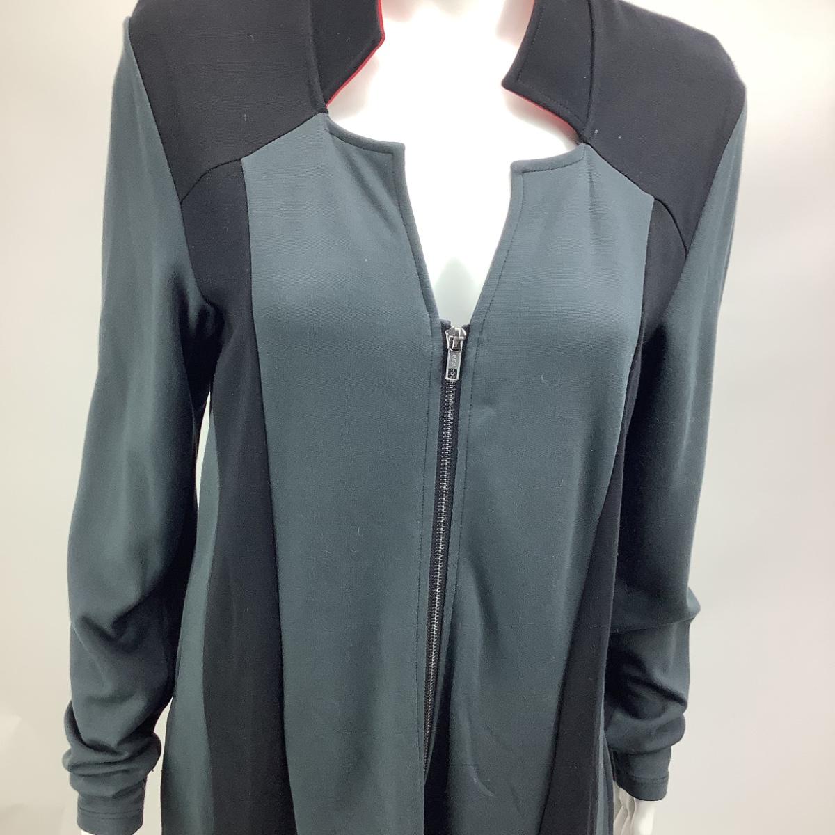 Jacket is black and grey colorblock, full zip, size xs, measures 18" from armpit to armpit and 38" overall length.