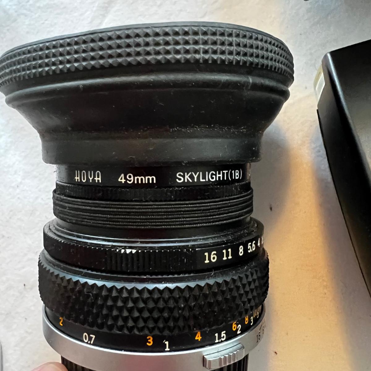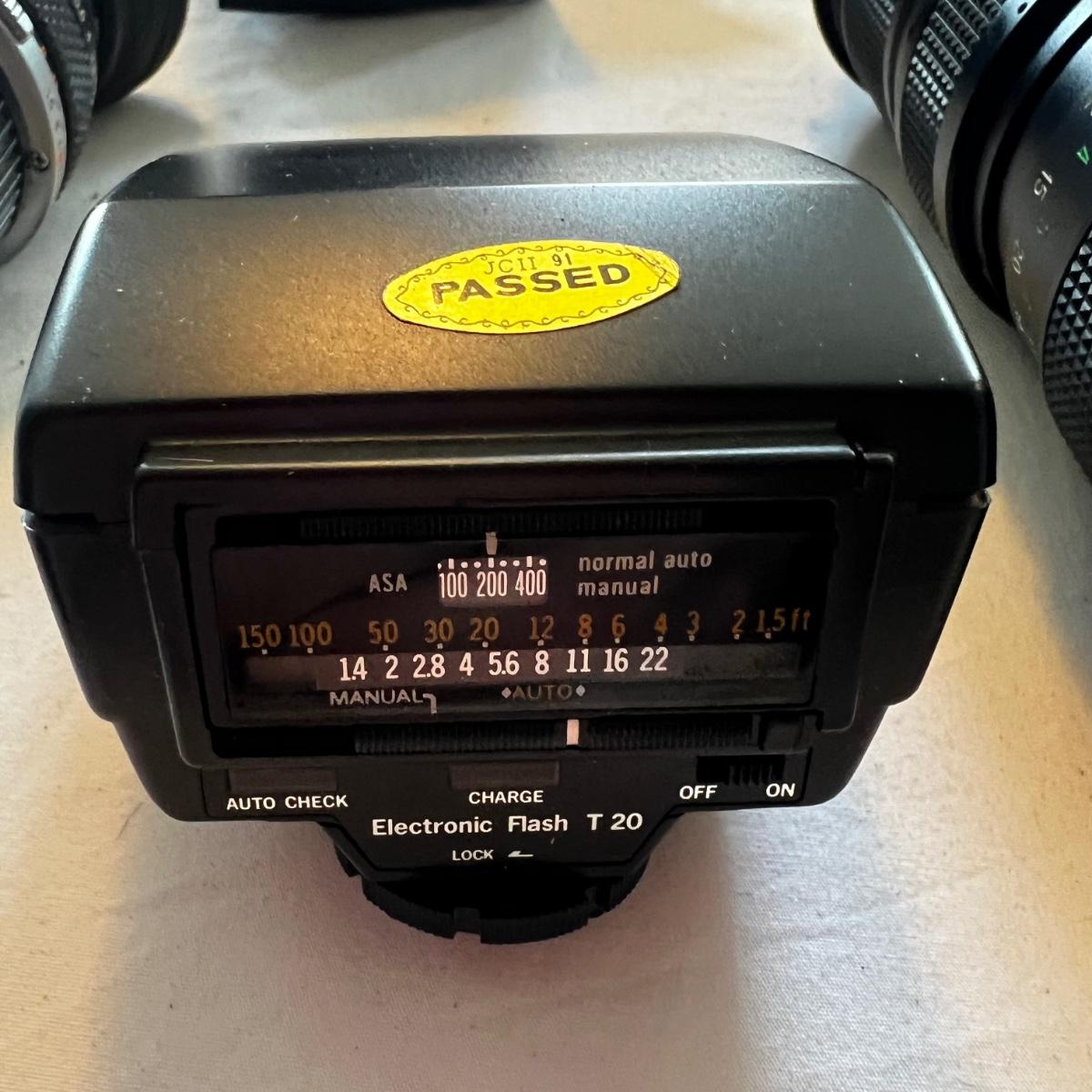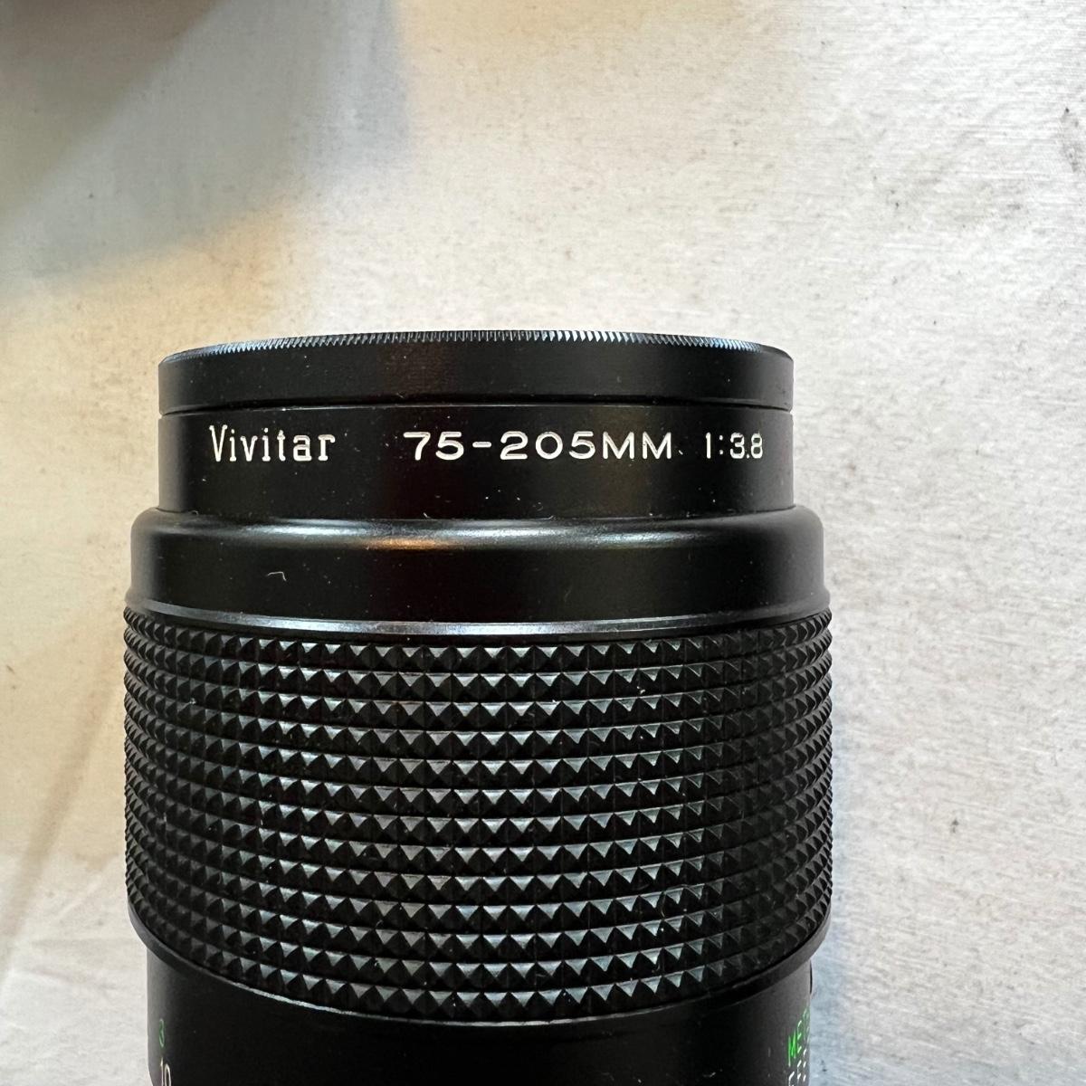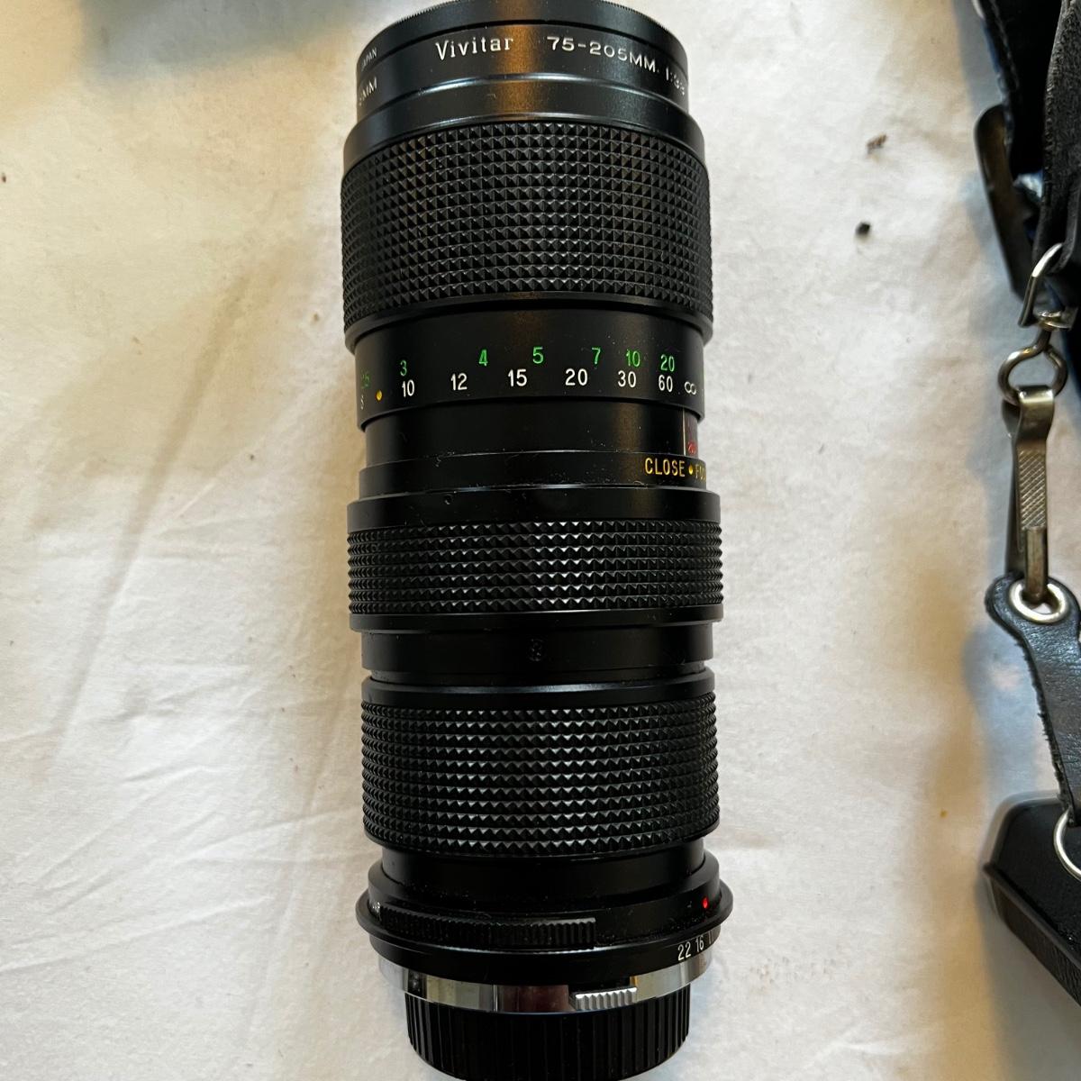 Includes Vivitar auto thyristor 3700, Hoya 49mm skylight (1b), Electronic flash t-20, Vivitar 75-205mm, Tiffen 58mm Haze & canvas travel bag.