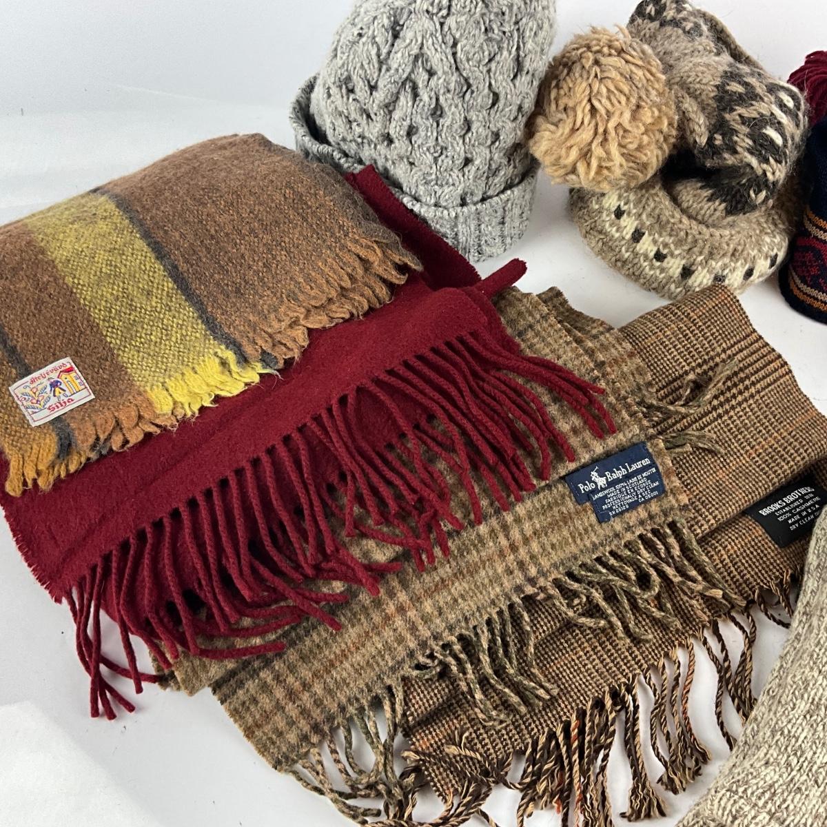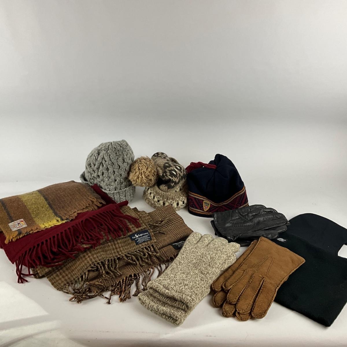 Two wool scarves, two cashmere scarves, three hats, 3 gloves & one hoodie piece