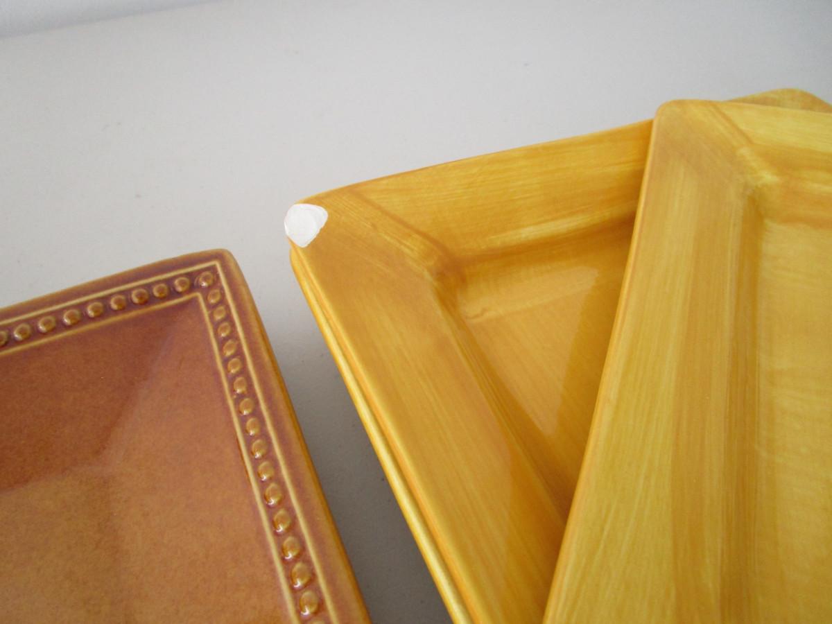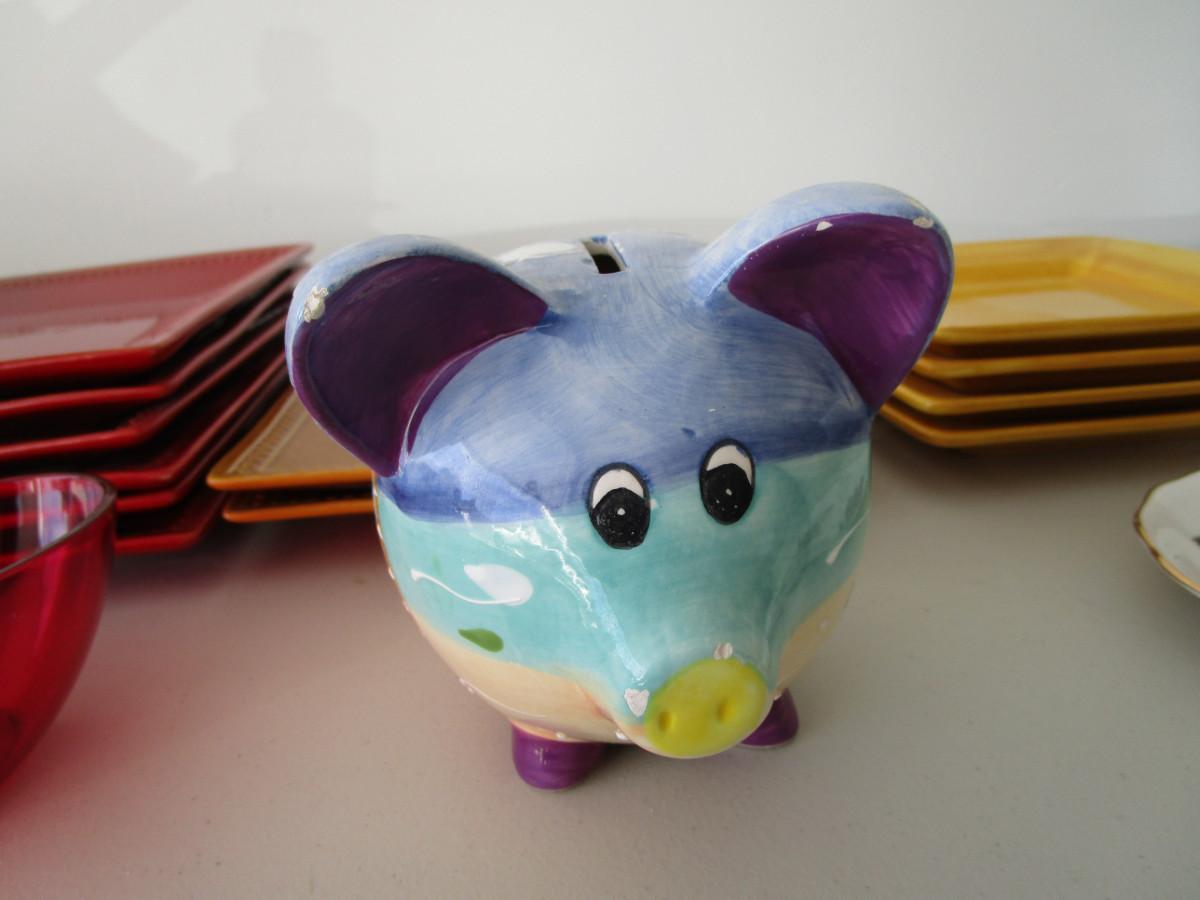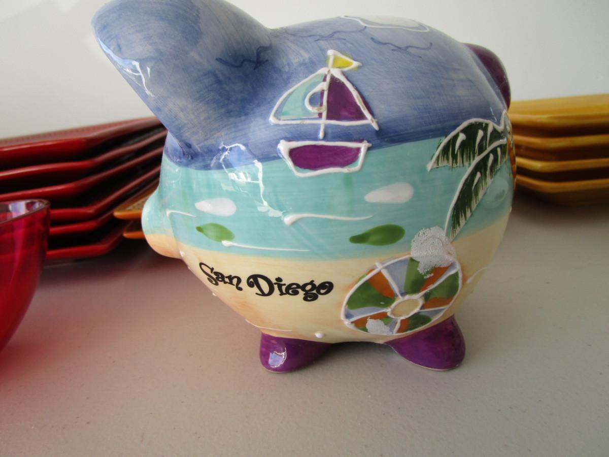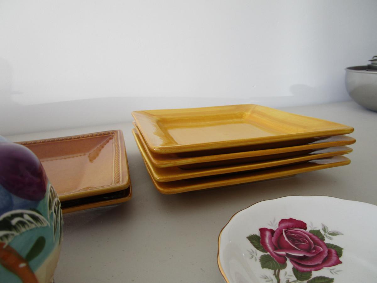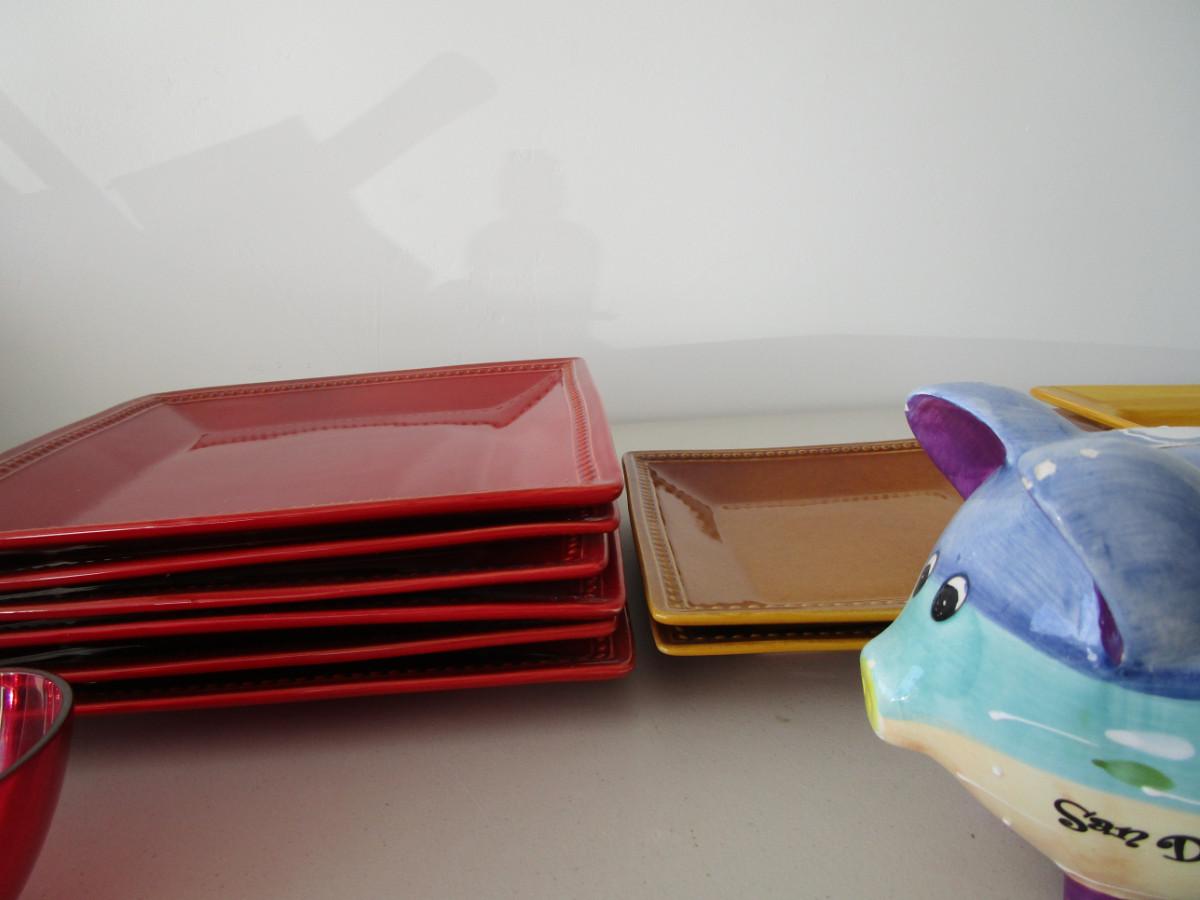 6 Red plates 10.5 in; 4 yellow 8 in, 2 gold 8 in, plastic red dish, San Diego piggy bank