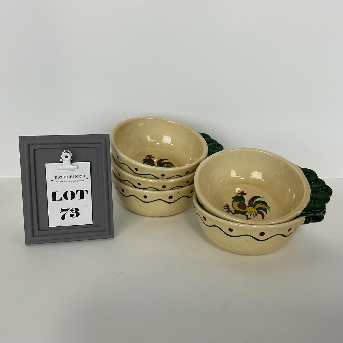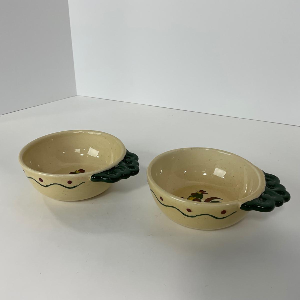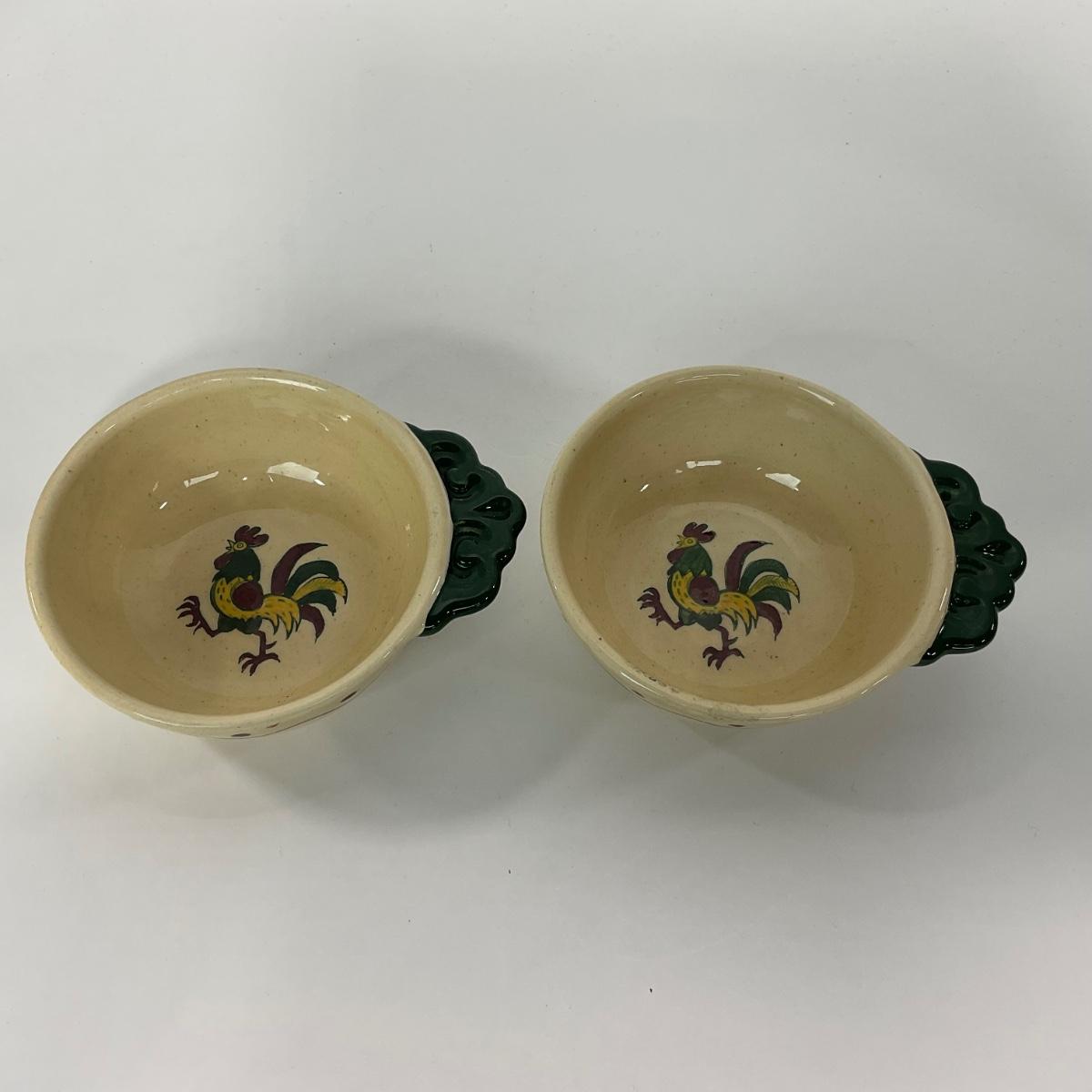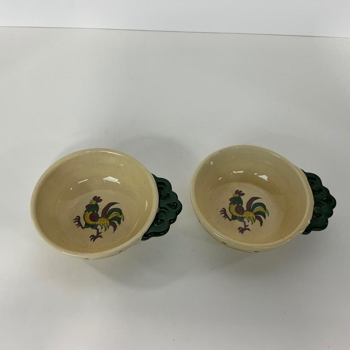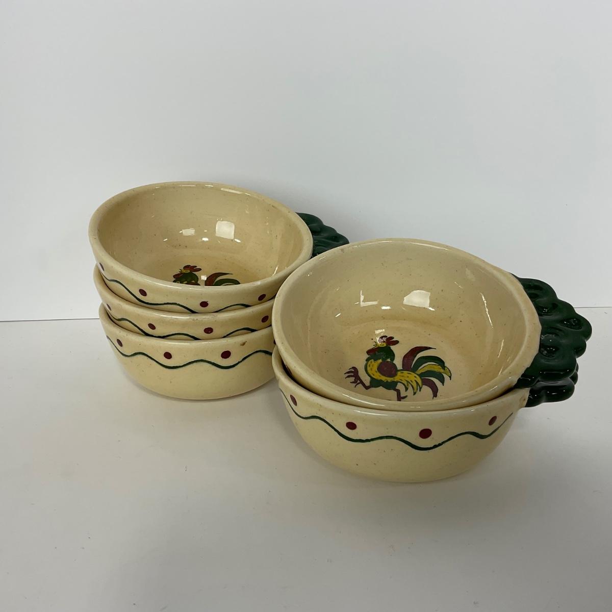 Five handled soup bowls of the Rooster Metlox Poppytrail California pottery. In great shape. Please see photos for details and condition. ::: Shipping is available on this lot. If you require shipping you must let us know at the close of the auction. We will coordinate with you after the item has been won. Shipping fees will include insurance up to or exceeding the value of all items being mailed. If you have any questions regarding this lot please contact the auctioneer either via this website, by direct email or by phone. PICK UP TIMES and other important information can be found in the TERMS and DESCRIPTION of the auction. Please take a look for pertinent information. Thanks!