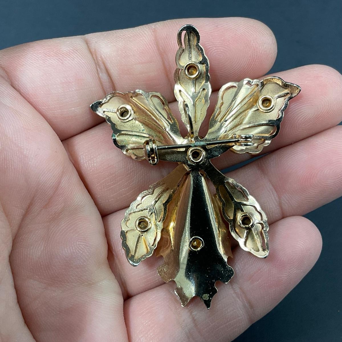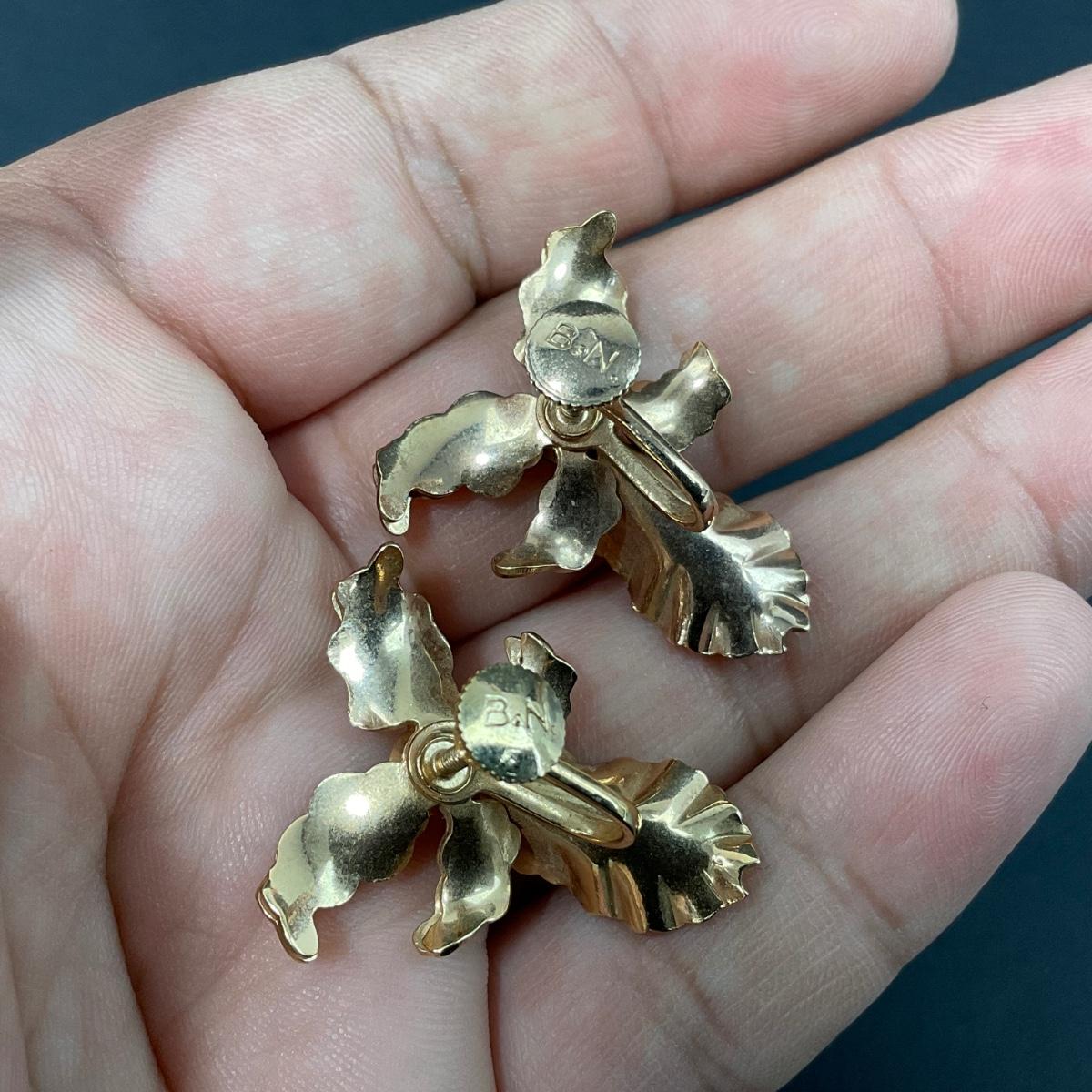 Vintage Bugbee & Niles orchid brooch and post earrings set. Please see photos for details and condition. Any condition statement is given as a courtesy to a client, is an opinion, and should not be treated as a statement of fact. Reference to condition written, oral or within a condition report shall not be regarded as a full account of condition and may not include all defects, alterations, or restorations. Absence of a condition report does not imply a lot is flawless or lacking imperfections or damage. Katherine’s Auction & Appraisal Service shall have no responsibility for any error or omission. Returns shall not be accepted on the basis of condition. ::: Shipping is available on this lot. If you require shipping you must let us know at the close of the auction. We will coordinate with you after the item has been won. Shipping fees will include insurance up to or exceeding the value of all items being mailed. If you have any questions regarding this lot please contact the auctioneer either via this website, by direct email or by phone. PICK UP TIMES and other important information can be found in the TERMS and DESCRIPTION of the auction. Please take a look for pertinent information. Thanks!